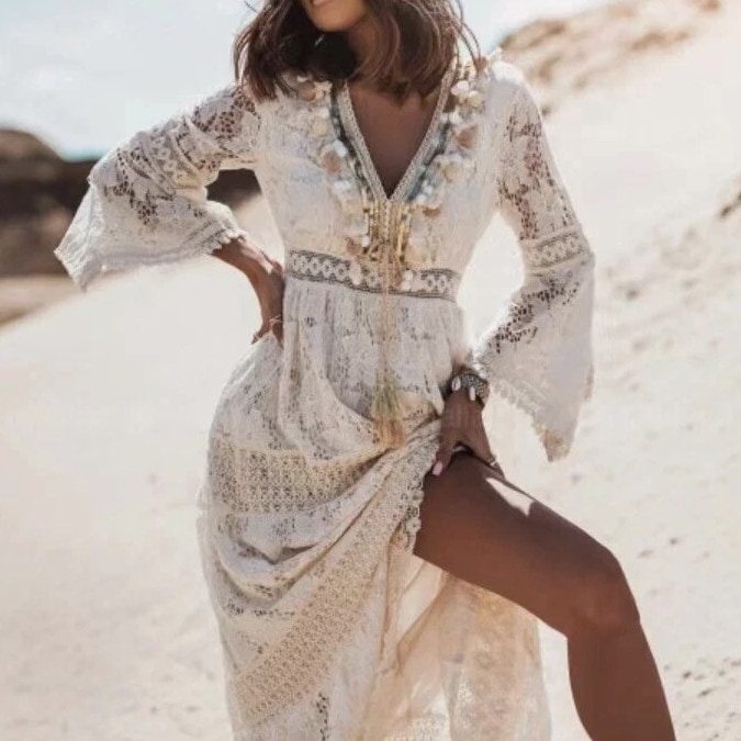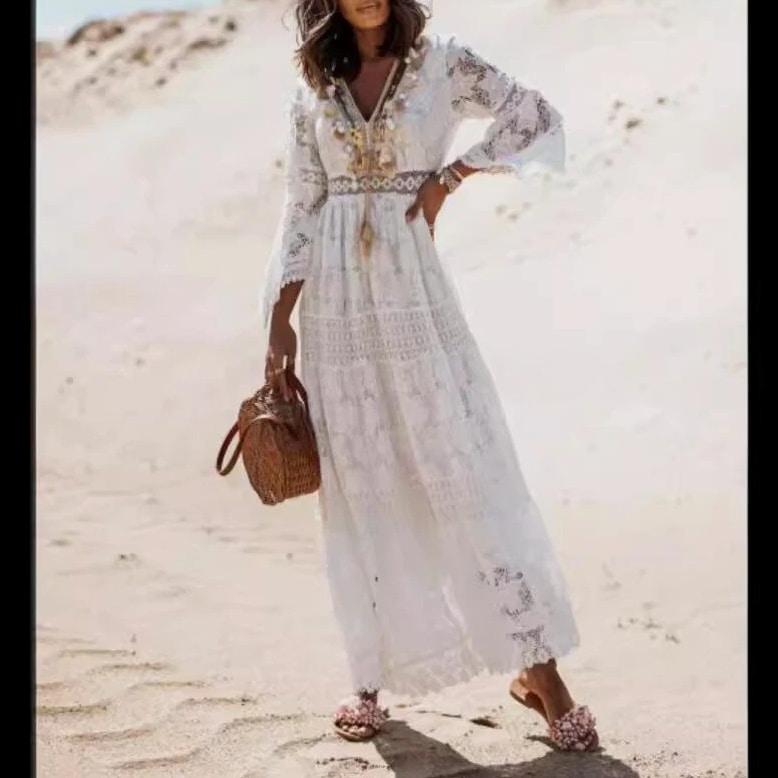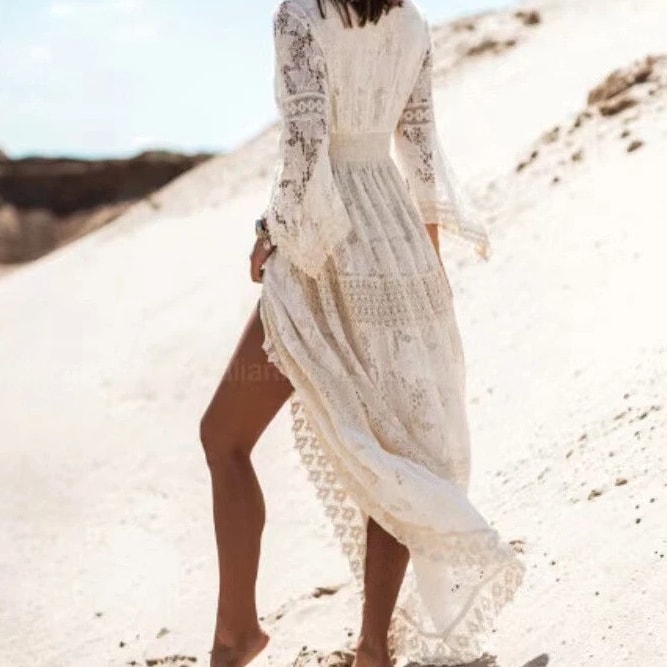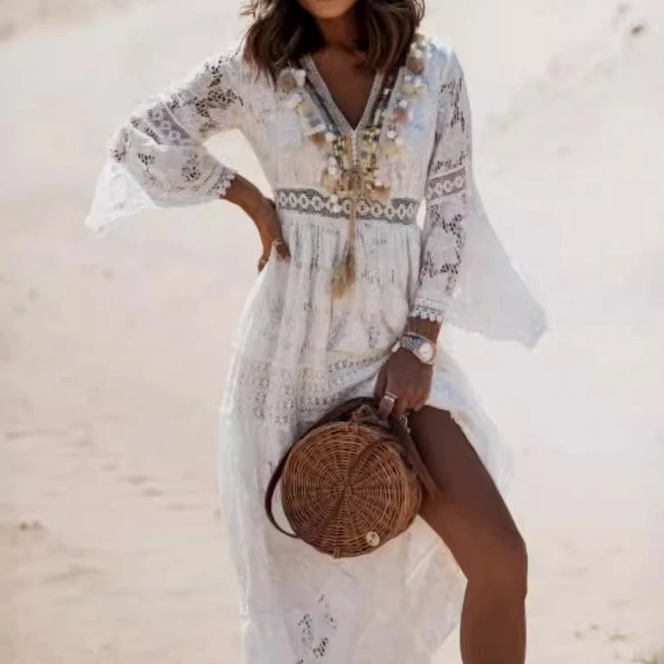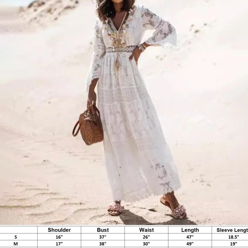 Women's Boho Maxi Lace V-Neck Flare-Sleeve Dress Summer Party Beach Sundress