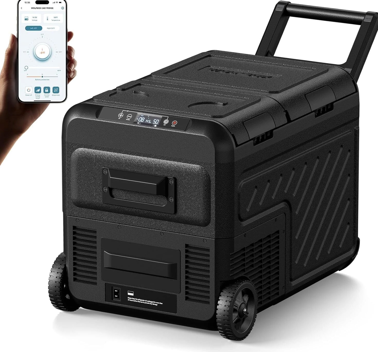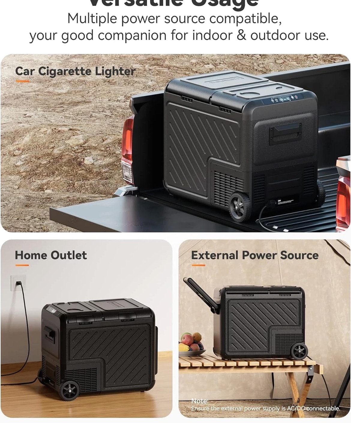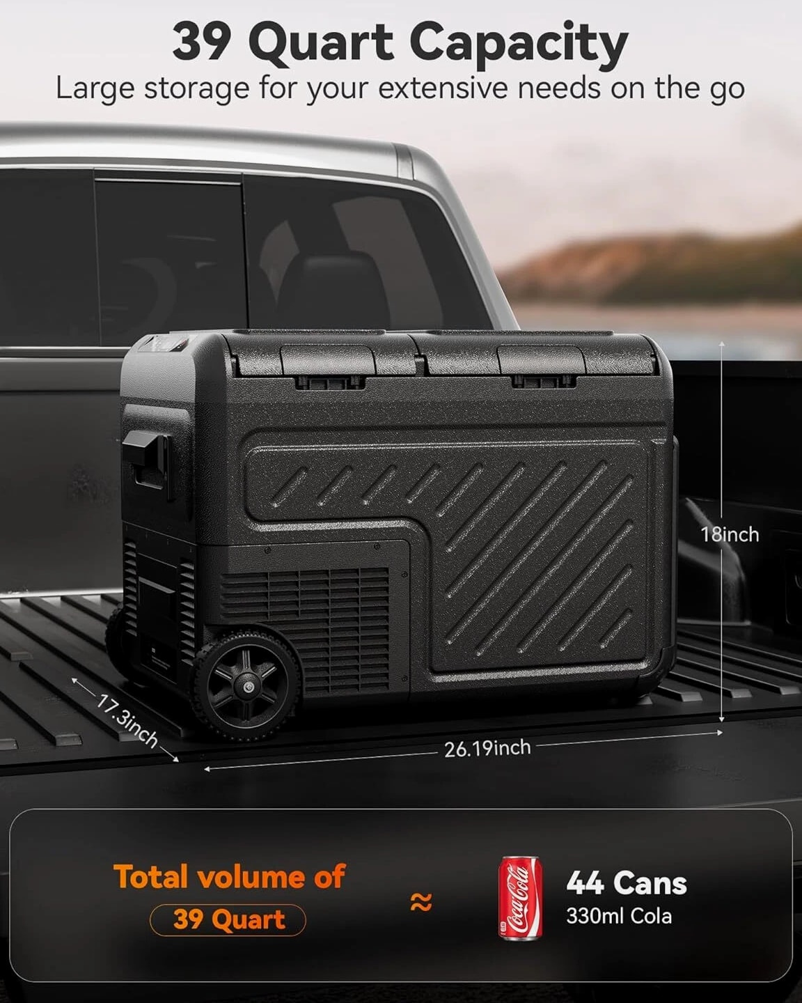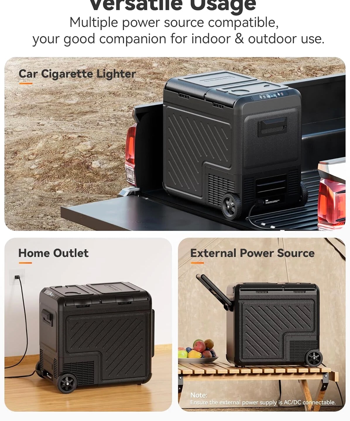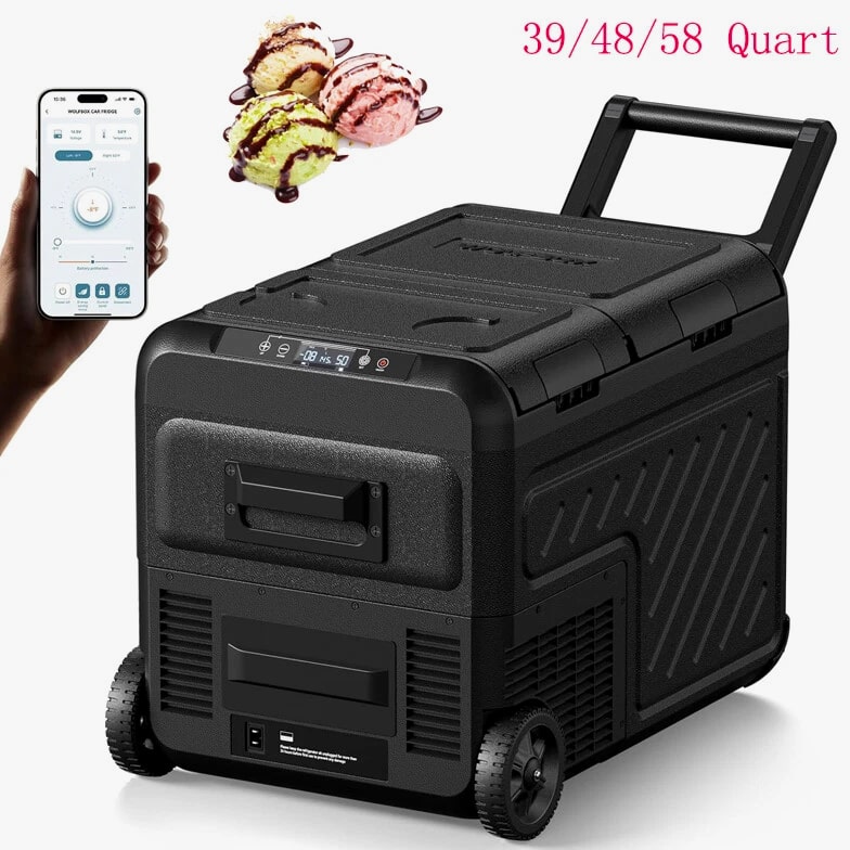 12V portable refrigerator offering advanced cooling technology for vehicle and RV use. Featuring adjustable temperature controls and smartphone app compatibility for remote monitoring. Key Features: - Multiple capacity options: 39, 48, or 58 Quart sizes available - 12 Volt DC power compatible with trucks, cars, and RVs - Wide temperature range for both refrigeration and freezing - APP control functionality for convenient remote access - Durable construction suitable for camping and travel - Multiple compartment options for organized storage - Energy-efficient operation Ideal for road trips, camping expeditions, tailgating, and long-haul transportation. Maintains consistent cooling performance in various driving conditions.