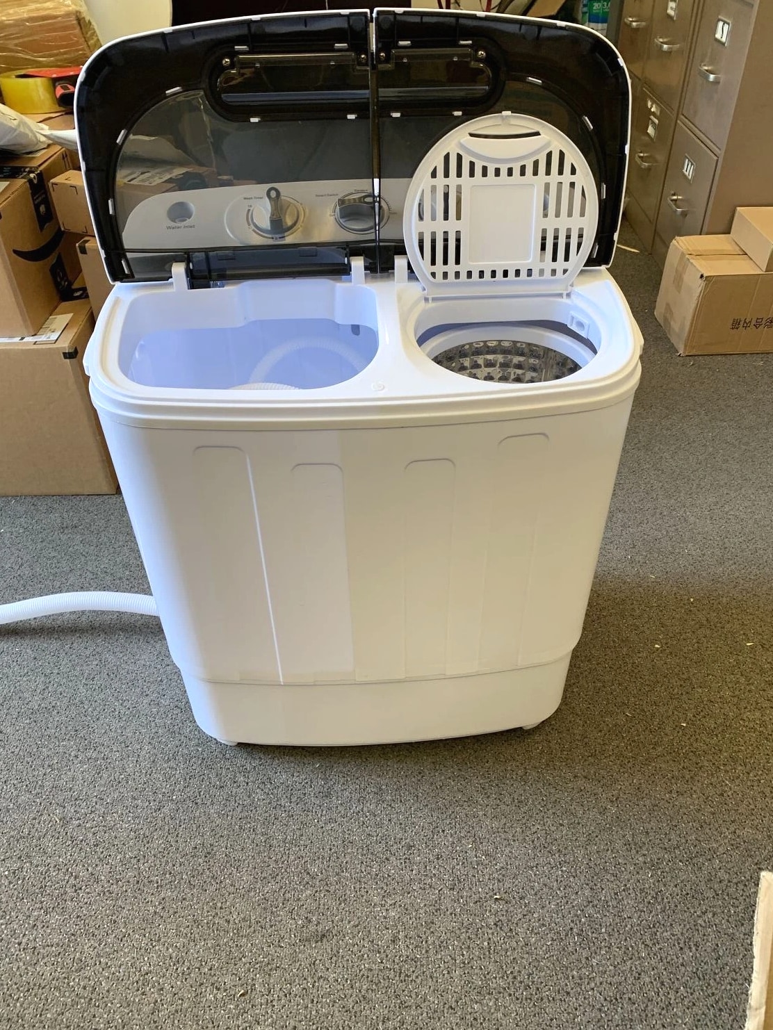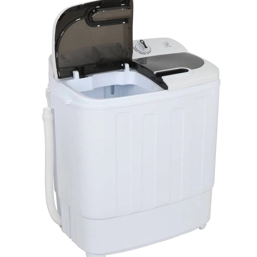 Features: Portable washing machine and spin cycle is constructed of durable plastic material which makes it steady and dual function feature allows for washing and spin at the same time. Its compact, lightweight and space-saving design makes this ideal for places where space is limited such as for apartments, condos, motor homes, camping trips or dormitories. Enjoy the convenience of washing and spinning up to 13 total pounds of laundry (Washer: 8 lbs, Spin Cycle: 5 lbs.) The wash cycle can run up to 15 minutes on either a soft or normal wash and the spin cycle can run up to 5 minutes which means the clothes can be washed for the time required. Simple to use: simply add clothes, water and detergent and set the machine to wash. Once done give it a spin to dry out and rinse through. This portable washing machine gives you a similar performance of larger machines but in a compact smaller size. With an impressive performance and lightweight portability, this portable washing machine will save you time, money, and space. It does not require plumbing and only requires access to water and a drain area. Everything needed for the machine to work is included (except water and detergent). Includes in the box is the Washing Machine, Water Fill Hose and manual. This unit features a 1300RPM motor with a max frequency of 60Hz Specifications: Overall Dimensions: 23"(L) x 13.5"(W) x 26"(H) Washer:12"(L) x 13"(W) x 14"(H) Spinner: 7"(Dia) x 9"(Dep) Waterproof Rating: IPX4 No assembly required