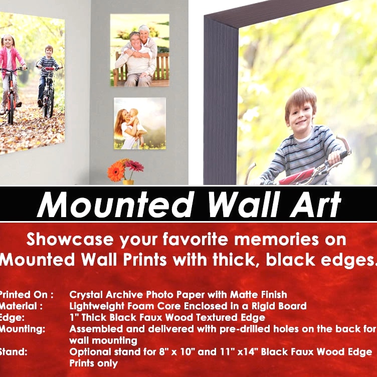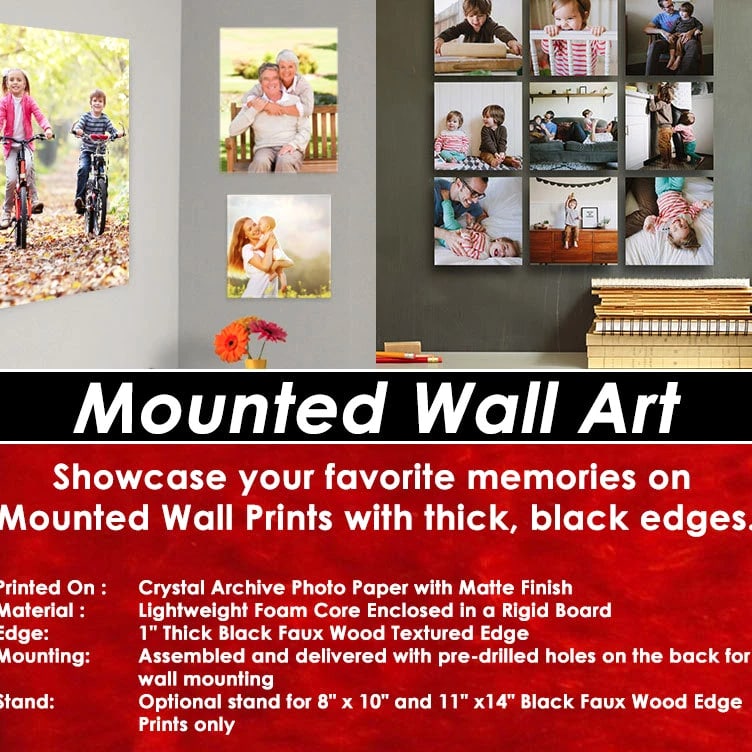 11"x14" Personalized Horizontally Mounted Wall Art Print Printed On : Crystal Archive Photo Paper with Matte Finish Material : Lightweight Foam Core Enclosed in a Rigid Board Edge: 1" Thick Black Faux Wood Textured Edge Mounting: Assembled and delivered with pre-drilled holes on the back for wall mounting Stand: Optional stand for 8" x 10" and 11" x14" Black Faux Wood Edge Prints only Mounted Wall Prints: Display Your Favorite Moments & Memories Whether for your home or office, our premium Mounted Wall Prints will enliven any room with your favorite photographs and memories. Printed on high-quality archival photo paper with matte finish, the prints are then mounted on a durable yet lightweight foam core and enclosed in a rigid board. All of our Mounted Wall Prints have pre-drilled holes on the back and are ready to be hung vertically or horizontally. Moreover, the 8" x 10" and 11" x 14" sizes for the 1" thick Black Faux Wood Textured Edge prints have an optional stand on the back for table displays. Simply install the stand by inserting it into one of the pre-drilled holes on the back and it's ready for display on your desk, shelf or table. (OTHER SIZES AND SETUPS AVAILABLE) After your Purchase, you will be contacted via email. Step 1 E-mail us any artwork, logos, picture and text you would like to be printed on your ORDER. Step 2 We will design a layout and send you a proof via email. Step 3 Once the proof is approved We will Print & Ship your ORDER! Need A Design? No Problem! No Additional Charge! • Send us your photos, logos or info you want to appear on your ORDER. • We will make a custom design at no additional charge. • You approve the proof/layout or request as many changes as you like. • After all changes have been made and you are 100% HAPPY…..We will Print & Ship your ORDER!