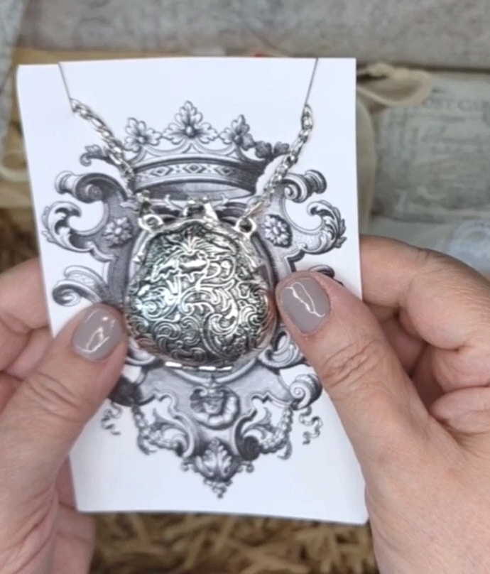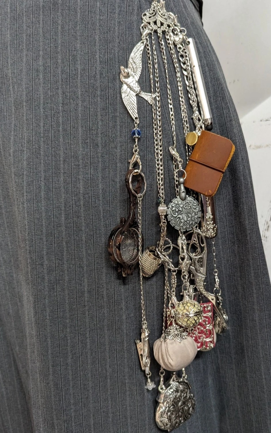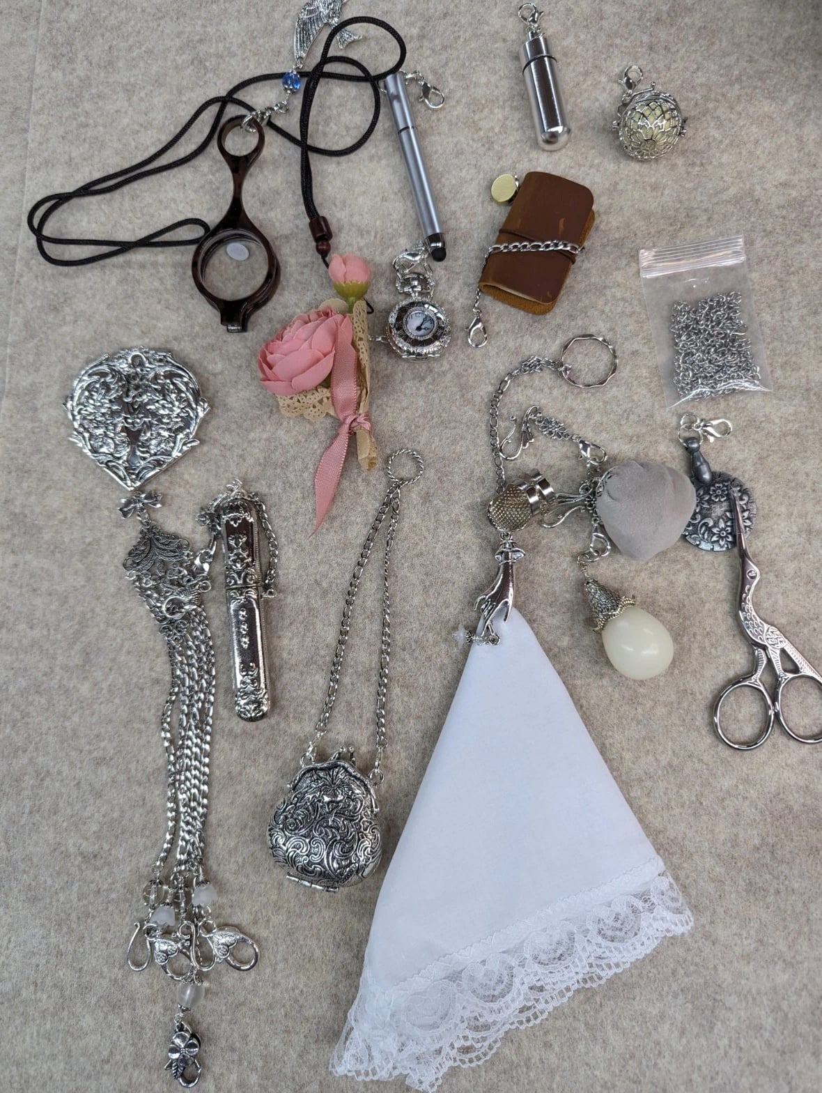 Stainless Steel Heart Chatelaine featuring heavy duty waist/belt clip This chatelaine has a heavy floral, heart shaped metal head piece with five chains holding decorative findings along with hooks and rings to hold scissors, needle cases, stitch markers and other useful items. At the top, on the back of the piece, is a stainless steel clip that fits over your waistband or belt. Accessories Included: Beautifully detailed Victorian style: Mini magnetic closure purse Pressed steel needle case 1" Pocket Watch - working watch Elegant Hand handkerchief clip with lace trimmed handkerchief Vintage styled armless reader glasses Filigree Aromatherapy ball Stainless Steel Pill Box Leather mini notebook and pen/stylus set Handwork Tools: Velvet Pin Cushion Beeswax Thread Waxer Thimble Disk Thread Cutter Stork or Crane Scissors 3.5" A Chatelaine is a decorative clasp with a series of chains suspended from it. Each chain has hooks or rings for useful items such as scissors, thimbles, watches, and keys. Chatelaines are used in many fiber arts, including Embroidery, Crochet, Tatting, Knitting, and others. Handcrafted from jewelry findings and other materials, each Chatelaine is a work of art. Shipped via USPS First Class Mail. Gift packaging included.