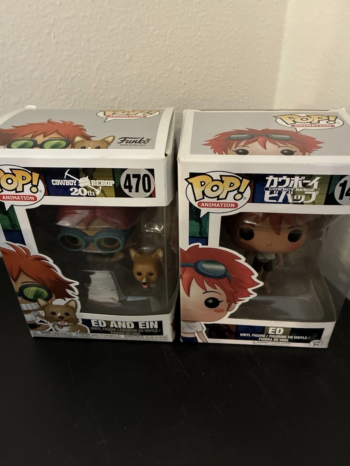 Cowboy Bebop Funko pop bundle. Features Ed #148 and Ed and Ein #470. Both remain unopened in original boxes. The Ed and Ein figure has minor box wear—see photos from storage over the years. Still makes an excellent addition to any Cowboy Bebop fan collection