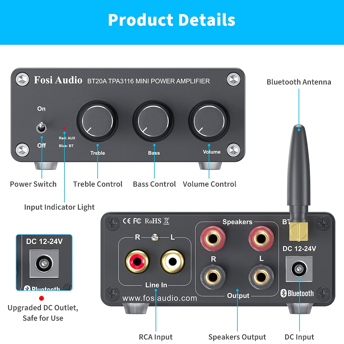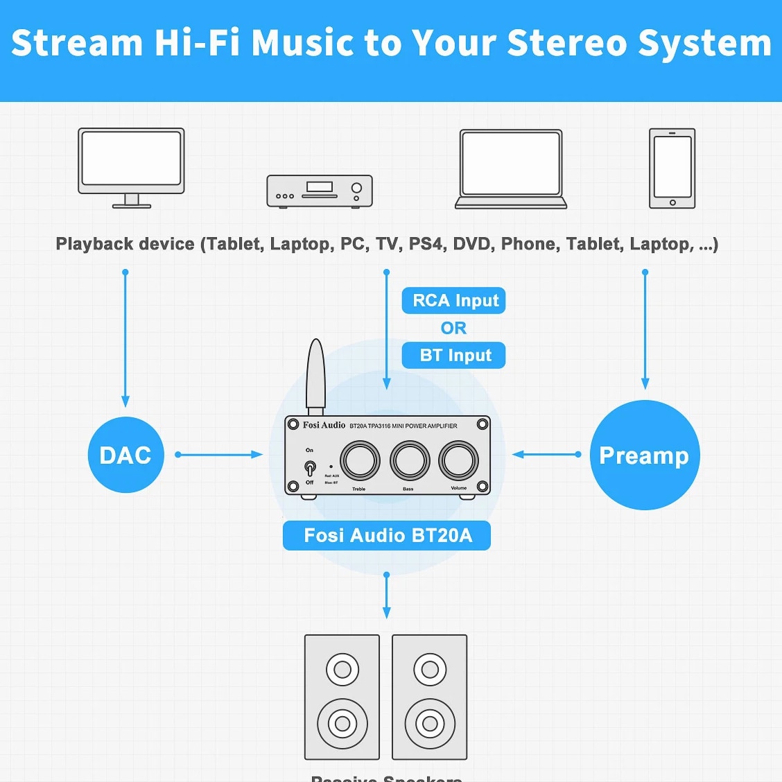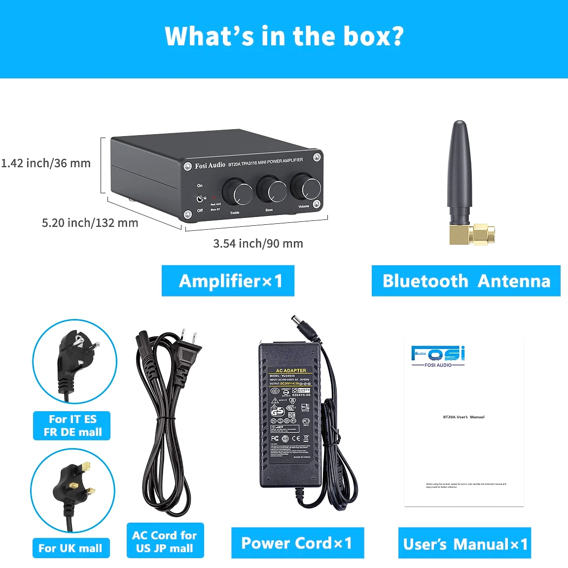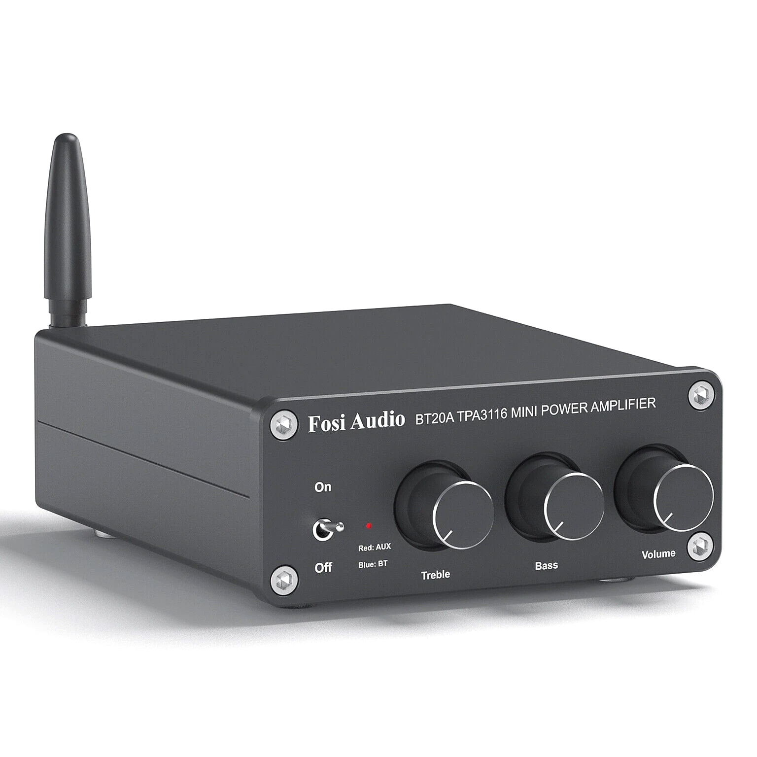 Store Sections Categories Mono Amplifiers Subwoofer Amplifiers Bluetooth Amplifiers Preamps Phono Preamps Headphone Amps Gaming DACs Amplifiers Other Fosi Audio BT20A Bluetooth 5.0 Audio Receiver Digital Power Amplifier 2 Channel 2*100W Mini Hi-Fi Class D Home Speaker Product Overview Highlights: Small simple compact design but practical and powerful, little Hi-Fi Bluetooth wireless amplifier exclusively designed for customers who pursue HiFi sound; CSR Bluetooth 5.0 core with 50ft connection range guarantees low signal delay. No pop, no audible noise when Bluetooth connection is established; 100W RMS X 2 (4 ohms, 20 Hz - 20 kHz, 0.04% THD), can drive 280watts (8 ohm), 320watts (4 ohm) speakers, (For passive speakers only, not powered speakers.) Advanced circuitry design with built-in speakers protection circuit, ideal for bookshelf/computer/desktop/speakers in your home; Key Specs: Model: BT20A Power amplifier chip: TPA3116D2*2 NE5532*2 DC Input Range: 12-24V Terminating Impedance: 2 Ohm - 8 Ohm Max Power Output: 100W x 2 THD ≤ 0.04% Frequency Range: 20Hz - 20kHz (±1 dB) SNR ≥ 98dB Input Sensitivity ≤ 280mV Input Mode: Bluetooth & RCA Bluetooth version: Bluetooth 5.0 (30m without obstruction) Bluetooth chip: ATS2853 Package Contents: 1*BT20A Bluetooth Amplifier 1*19V 4.74A power supply 1*User Manual