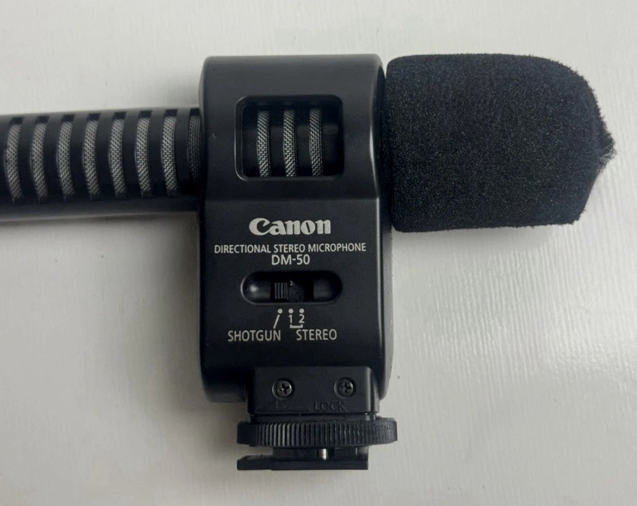 Tested and works. Comes with mic cover foam windscreen. The Canon DM-50 Directional Stereo Shotgun Microphone is a high-quality microphone designed for professional audio recording. Engineered specifically for Canon cameras, it features a compact form factor and hot/cold shoe mount for easy attachment. With stereo setting, this microphone is perfect for capturing clear and crisp audio for home recording projects. Manufactured in the United States, this microphone is a reliable choice for musicians, podcasters, and content creators seeking to enhance their audio quality.