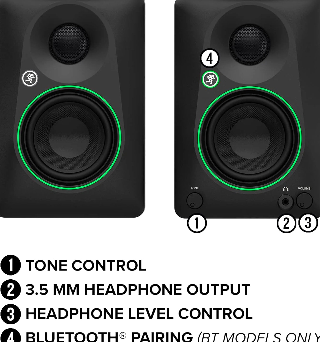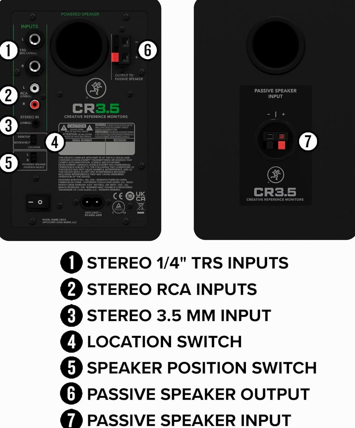 Mackie CR3.5 3.5" Creative Reference Powered Studio Monitors with Tone Control and Location Switch — Active Speakers for Music Production, Desktop Computer, Gaming, Hi-Fi Listening Description Style Standard Number of Items 1 Power Source Corded Electric Control Method Touch Warranty Description 1-year all inclusive, nontransferable Tweeter Diameter 1 Inches Woofer Diameter 3.5 Inches Unit Count 1.0 Count Speaker Size 3.5 Inches Brand Mackie Number of Audio Channels 2.0 Model Number 2056259-00 Model Name 2056259-00 Audio Driver Type Dynamic Driver Number of Batteries 1 Nonstandard Battery batteries required. Specific Uses For Product Professional audio, Casual listening Manufacturer Mackie Antenna Location For Home Studios, Audio Production, Multimedia Setups Audio Output Mode Stereo Connectivity Protocol RCA, TRS Warranty Type Limited Item Weight 10.2 Pounds Connectivity Technology RCA, TRS Enclosure Material Metal, Plastic Mounting Type Tabletop Mount Color Black Vinyl Wrap Item Dimensions D x W x H 7.1"D x 5.5"W x 8.1"H Compatible Devices Desktop, Laptop, MP3 Player, Projector, Smartphone, Tablet, Television Is Waterproof False Built-In Media 1/8" to 1/8" cable, 1/8" to RCA cable, Foam isolation pads, Speaker to Speaker Wire Speaker Maximum Output Power 50 Watts Speaker Type Monitor Size 3.5" Monitor Mackie CR3.5 Creative Reference Powered Studio Monitors combine studio-quality sound with a tone control, making CR3.5 the best studio monitors, gaming speakers and party speakers, all wrapped into one. Connect CR3.5 to just about anything. Hook up audio interfaces and playback devices with TRS and RCA connectors. Play gaming consoles and PCs with the 3.5 mm input. There's even a built-in headphone output. Use the tone knob to shape the sound, starting with the transparent response you expect from studio monitors. Turn the knob to gradually boost the bass and add high-end sparkle, perfect for immersive gaming, casual listening or all-out partying. Flip the location switch between desktop speaker mode and bookshelf speaker mode to optimize CR3.5 for wherever you place them. Use desktop mode for listening up close (like in the studio) and bookshelf mode for listening at a distance (like from the couch).