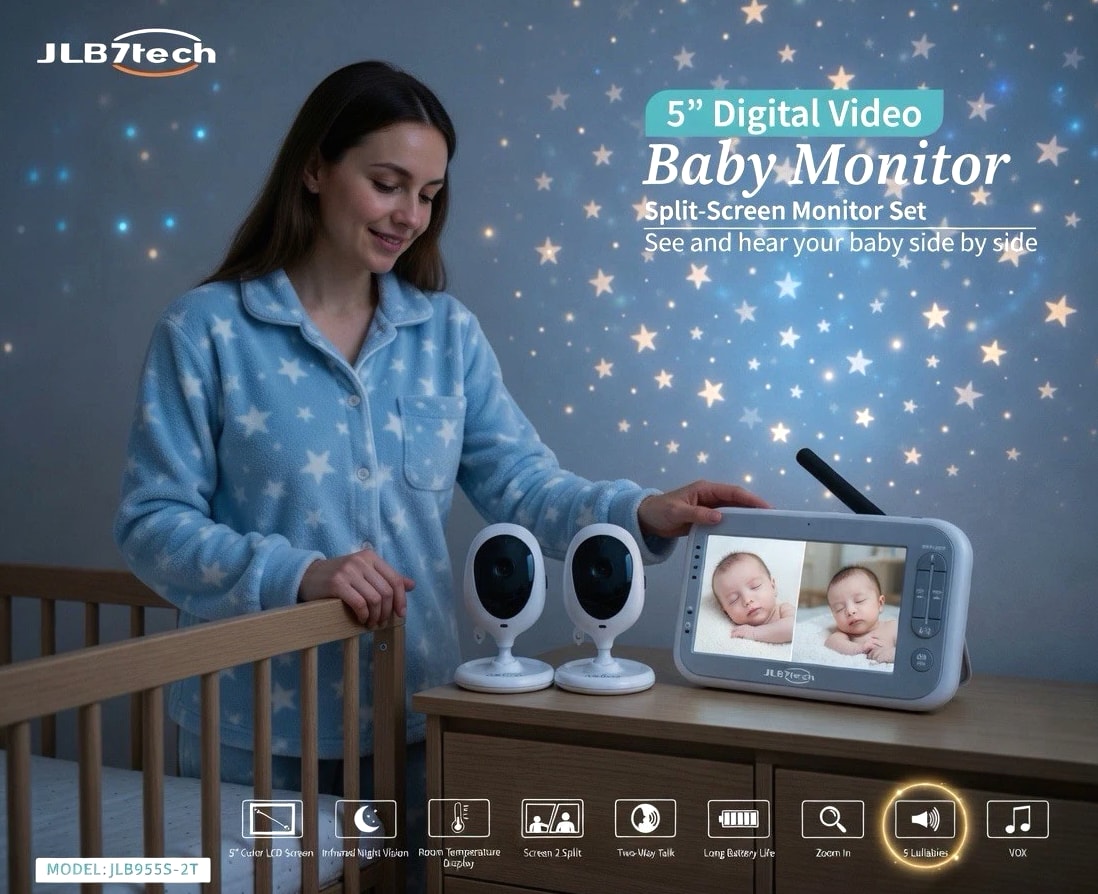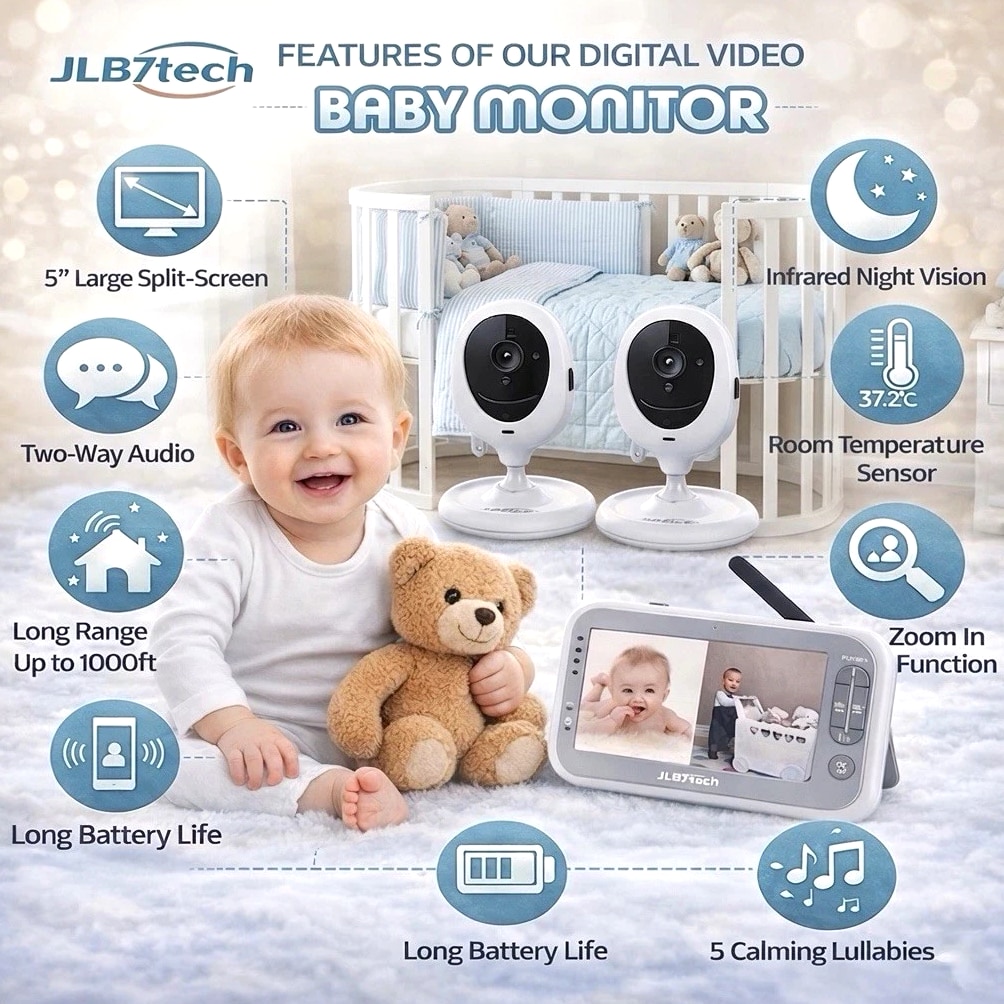 Monitor your baby anytime with this 5" Digital Baby Monitor featuring Dual Cameras. This monitor allows you to see and hear your baby clearly, giving parents peace of mind day and night. The split-screen display lets you monitor two rooms or two babies simultaneously, while infrared night vision ensures a clear view even in darkness. Perfect for nurseries, bedrooms, or playrooms. Features ✔ 5" Large LCD Screen – Clear and easy to view ✔ Split-Screen Monitoring – Watch two cameras at the same time ✔ Infrared Night Vision – Automatic night monitoring ✔ Two-Way Talk – Communicate with your baby through the monitor ✔ Room Temperature Sensor – Helps keep baby comfortable ✔ Zoom Function – Get a closer look anytime ✔ Long Battery Life – Reliable monitoring throughout the day ✔ Extended Range Signal – Up to 1000 ft coverage ✔ 5 Built-in Lullabies – Calm and soothe your baby What's Included • 1 × 5" Baby Monitor Screen • 2 × Baby Cameras • Power adapters • User manual Ideal for new parents, baby showers, or nursery setups.