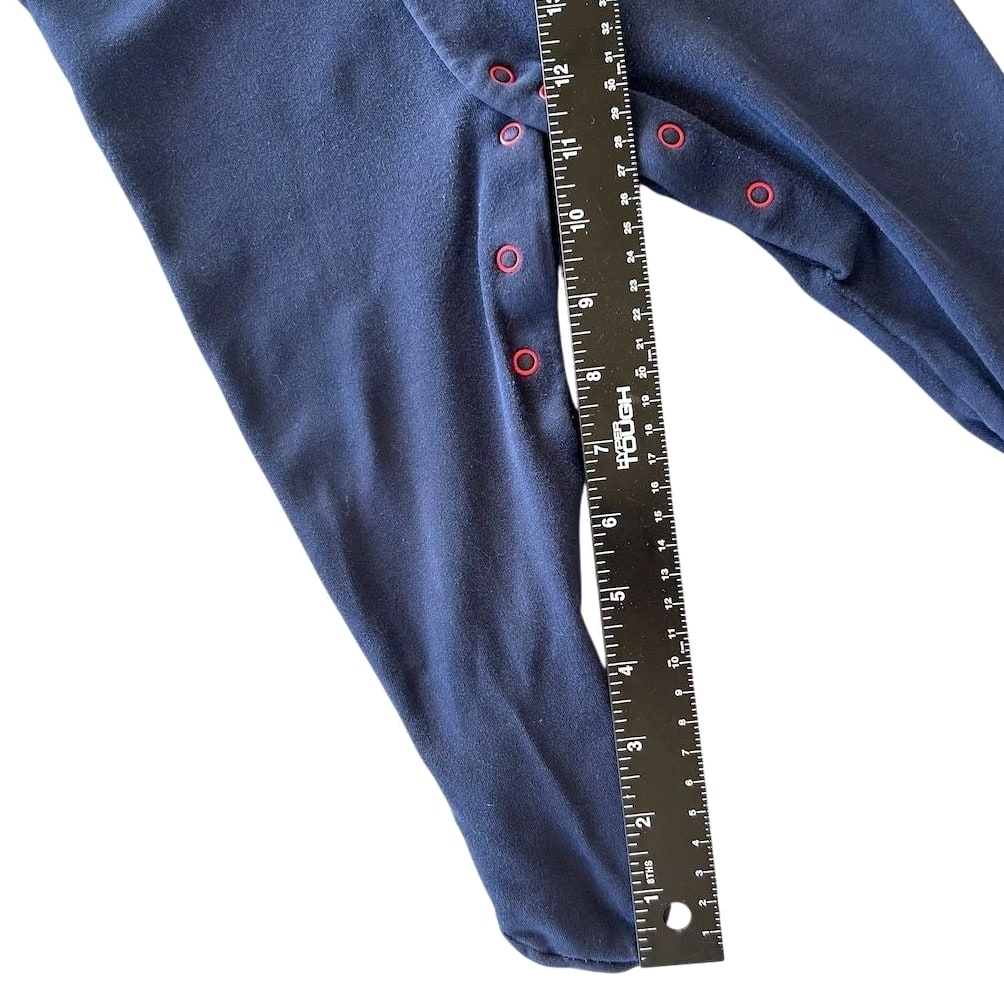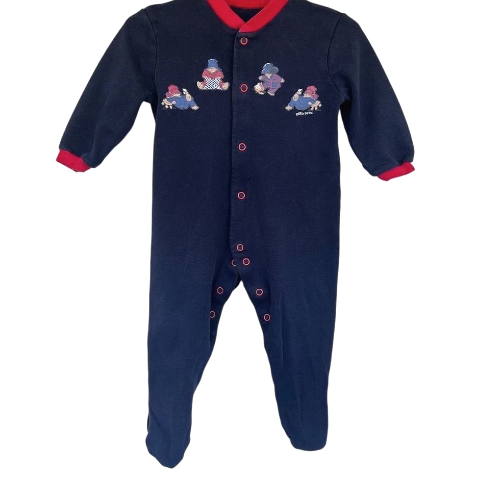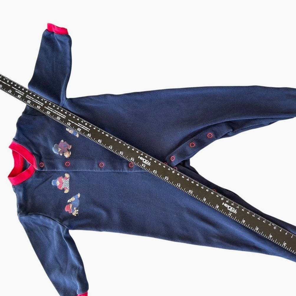 A charming navy blue footed sleepsuit adorned with a delightful Paddington Bear applique. This cozy one-piece features a red collar and cuffs, with snap closure down the front for easy dressing. Perfect for naptime or bedtime adventures. Fading present on graphics. See pics Measurements: • Chest (flat): 11 in • Sleeve Length: 11 in • Inseam: 9 in • Length (shoulder to heel): 25 in Department: Unisex Baby & Toddler Type: One Piece Theme: Animals Material: Cotton Fabric Type: Knit Closure: Snap Style: Footie Pajamas Pattern: Graphic Print Season: Fall, Winter, Spring Number of Pieces: 2 Piece Accents: Embroidered, Button Sleeve Length: Long Sleeve Features: All Seasons Keywords: Paddington Bear, sleepsuit, footed pajamas, baby boy, baby girl, infant, nightwear, character, appliques, cozy, comfortable, twins, gift, baby shower All items come from a smoke free, pet friendly home. All items are washed with Tide. We try our best to disclose any flaws with items, if we miss something please reach out. Combined shipping available on all items. Measurements provided for clothing listed.
