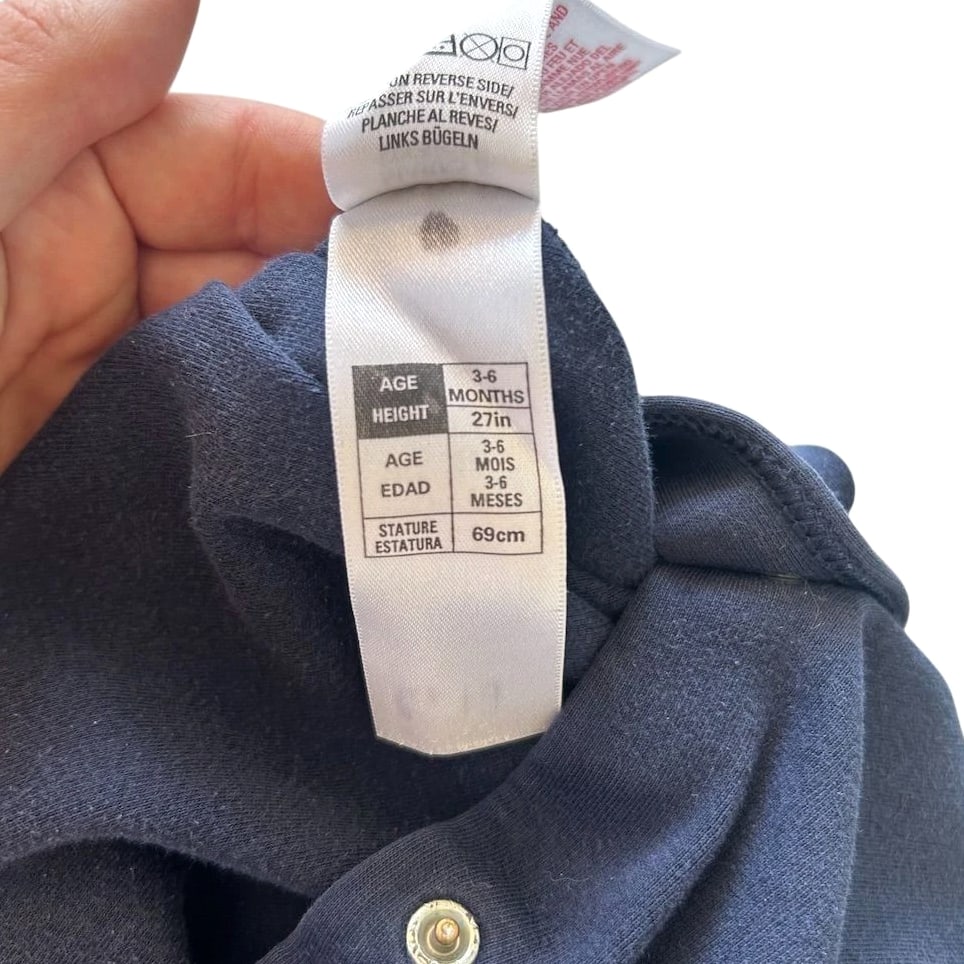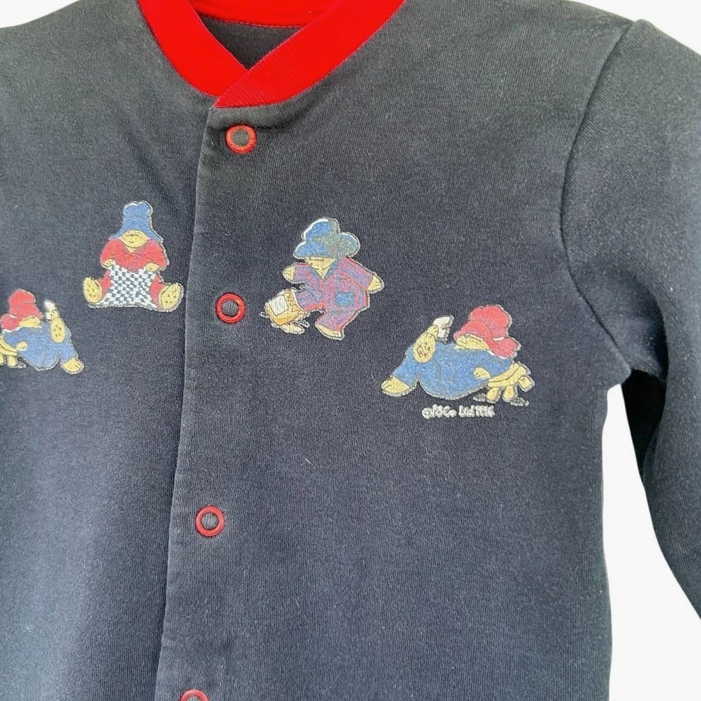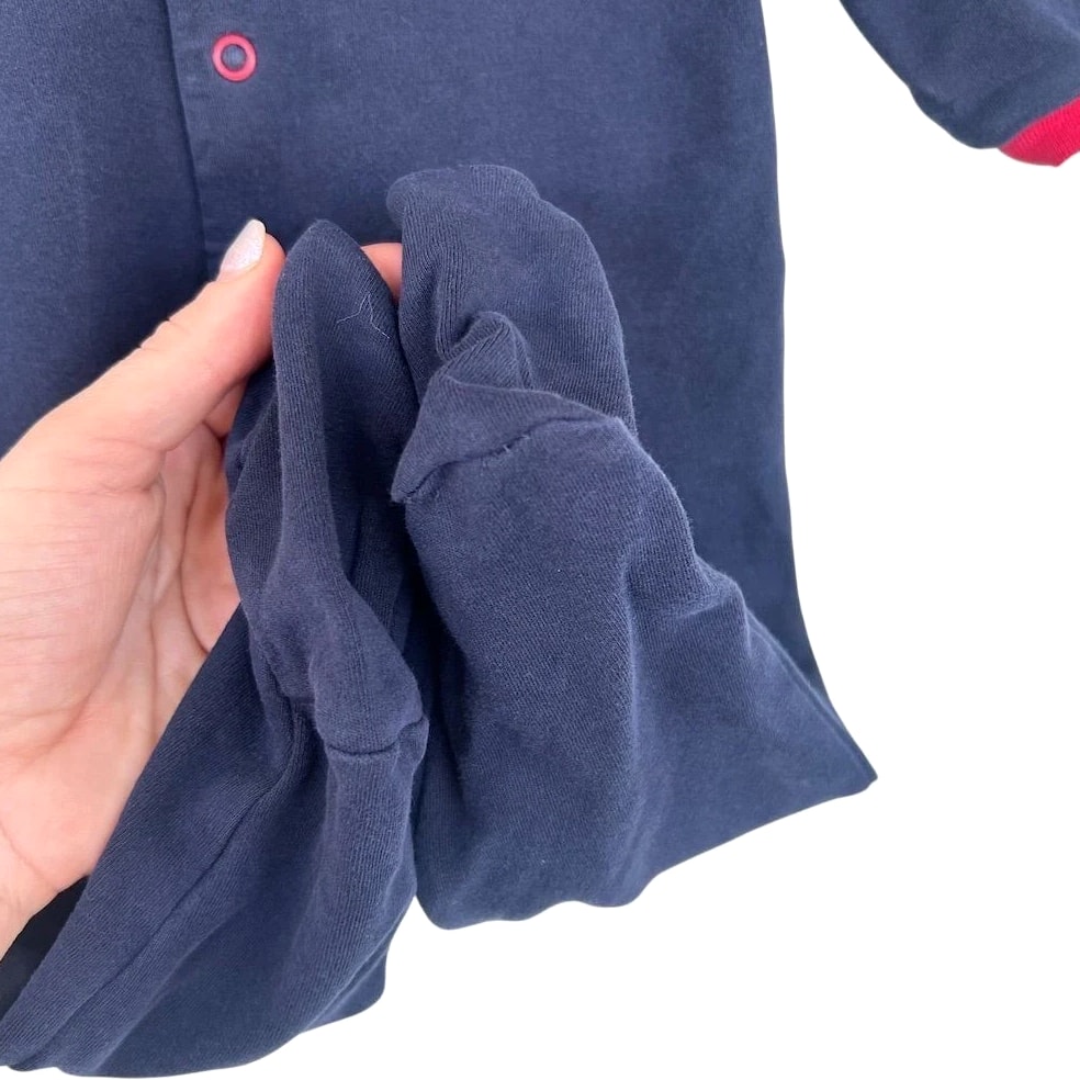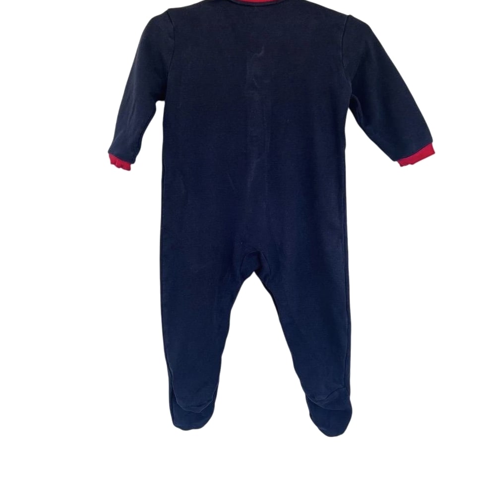 A charming navy blue footed sleepsuit adorned with a delightful Paddington Bear applique. This cozy one-piece features a red collar and cuffs, with snap closure down the front for easy dressing. Perfect for naptime or bedtime adventures. Fading present on graphics. See pics Measurements: • Chest (flat): 11 in • Sleeve Length: 11 in • Inseam: 9 in • Length (shoulder to heel): 25 in Department: Unisex Baby & Toddler Type: One Piece Theme: Animals Material: Cotton Fabric Type: Knit Closure: Snap Style: Footie Pajamas Pattern: Graphic Print Season: Fall, Winter, Spring Number of Pieces: 2 Piece Accents: Embroidered, Button Sleeve Length: Long Sleeve Features: All Seasons Keywords: Paddington Bear, sleepsuit, footed pajamas, baby boy, baby girl, infant, nightwear, character, appliques, cozy, comfortable, twins, gift, baby shower All items come from a smoke free, pet friendly home. All items are washed with Tide. We try our best to disclose any flaws with items, if we miss something please reach out. Combined shipping available on all items. Measurements provided for clothing listed.