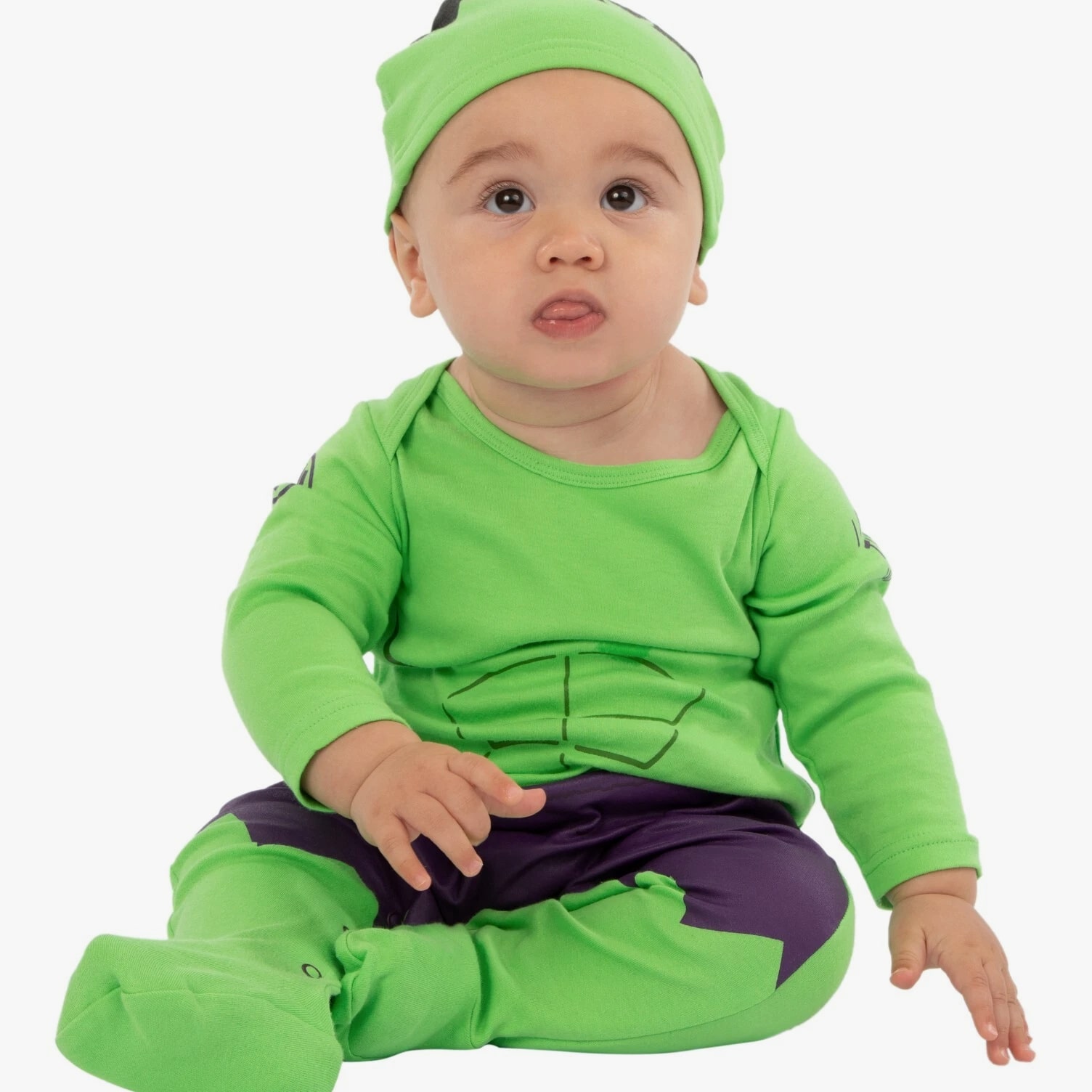 Marvel The Incredible Hulk Baby Sleepsuit Welcome your little superhero on their first day at the Avengers Tower with this cute baby sleepsuit, designed to look like The Hulk! Complete with a matching green baby hat featuring Hulk's hair, these baby PJs are sure to delight any young fan. Made from 100% ultra soft cotton, these baby two piece pyjamas provide maximum comfort for the next generation of The Avengers. Finished with easy popper fastening, these awesome baby pyjamas will ensure your little one stays comfy and cosy all day long. Material: 100% Cotton Official Marvel Merchandise. Exclusively designed for Character UK.