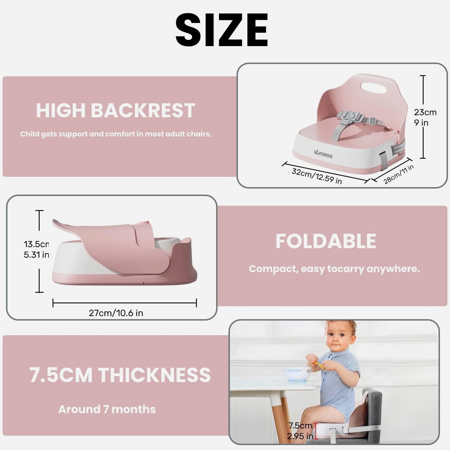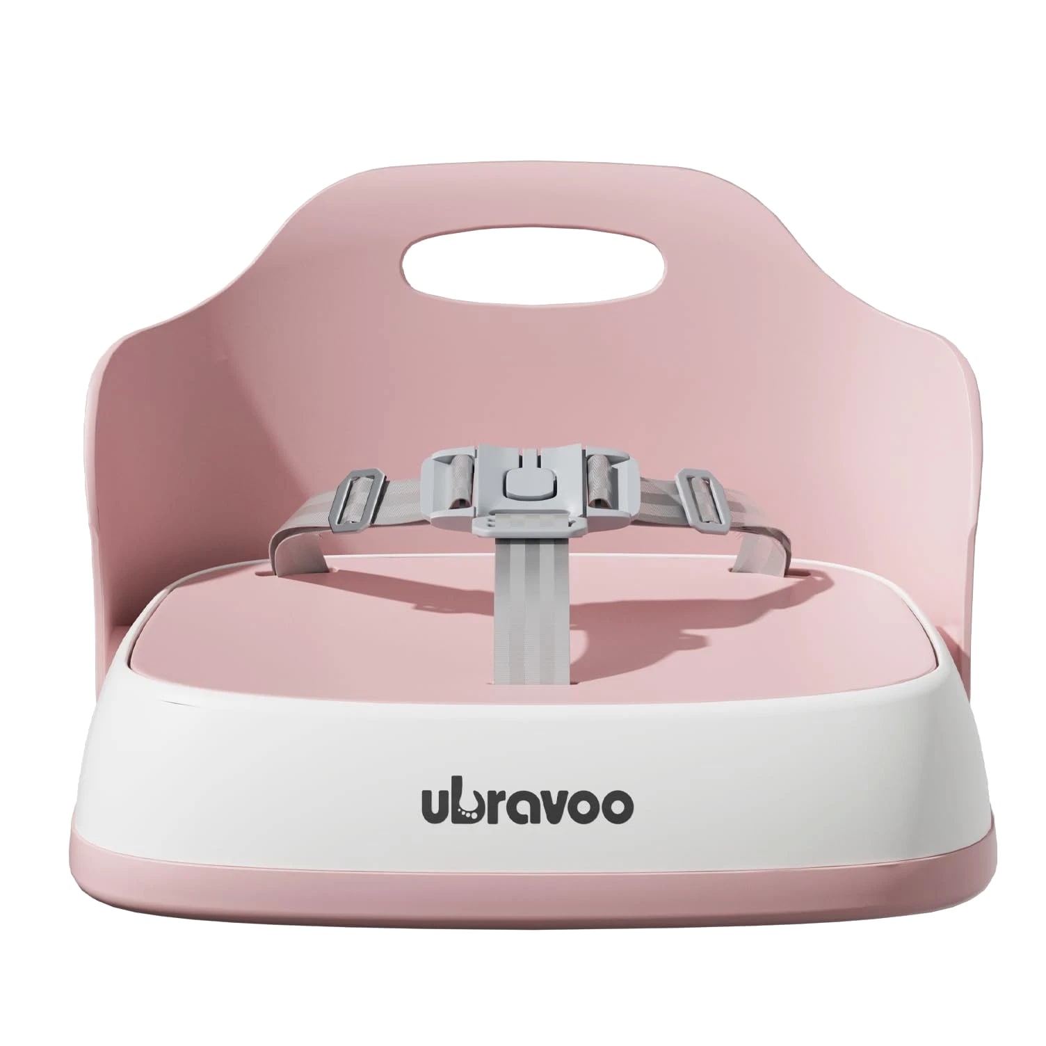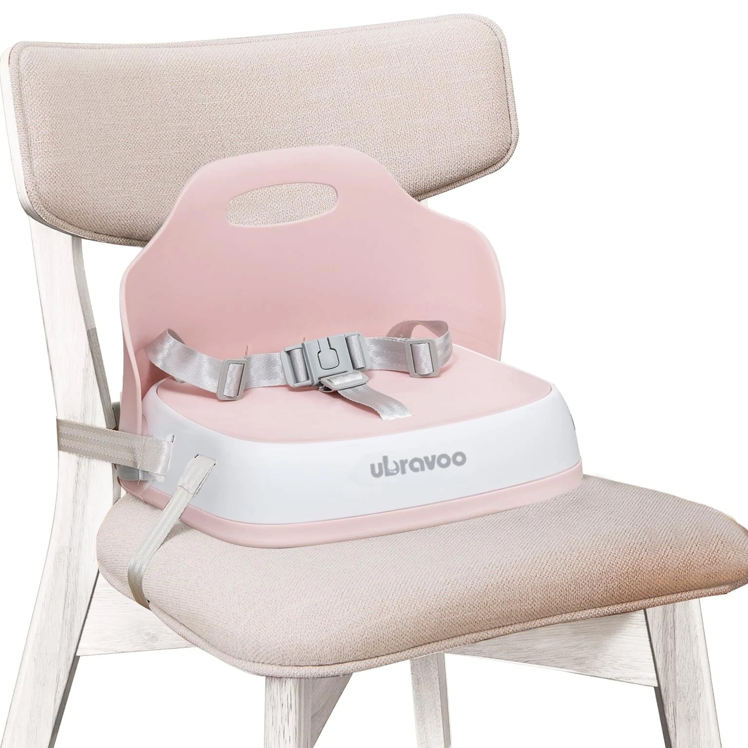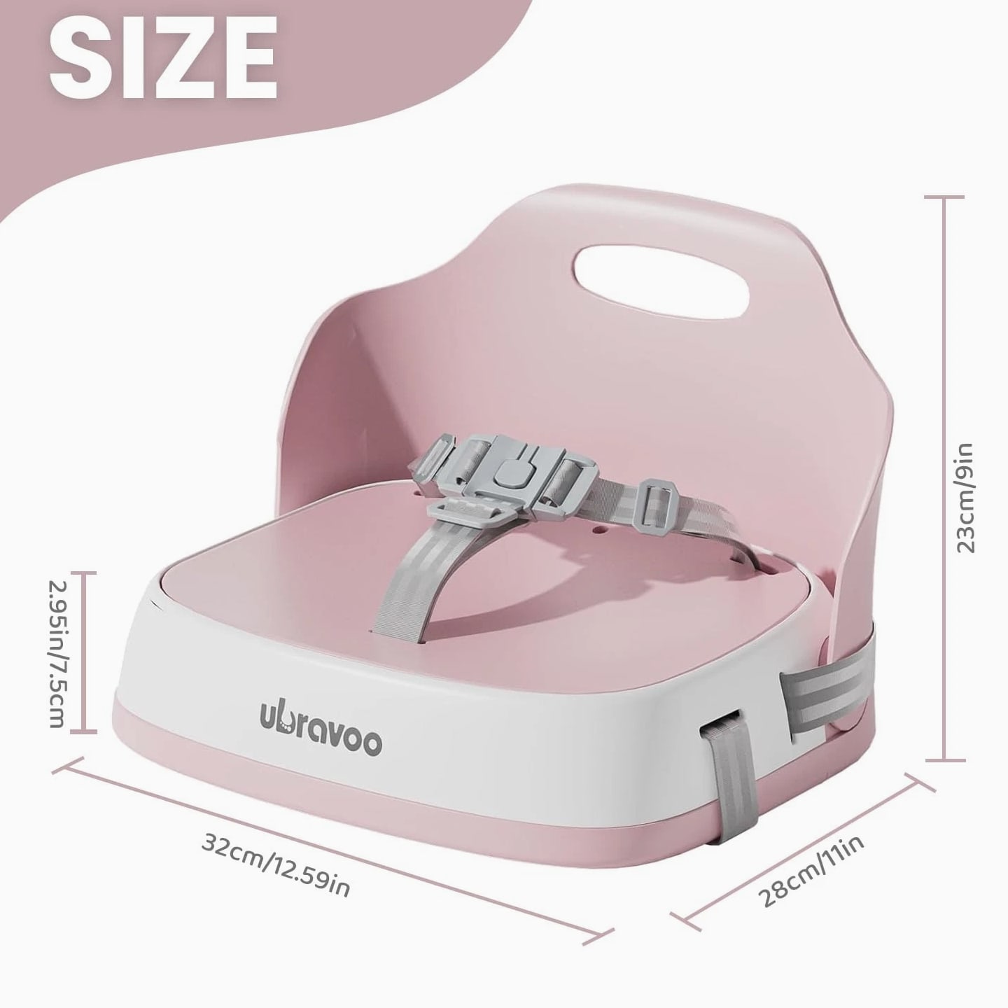UBRAVOO Baby Booster Seats, Portable High Chairs for Babies and Toddlers, HighChair for Baby from 6 Months to 3 Years, Sitting Up to 15 kg (Pink) 【Child Feeding Solution】The UBRAVOO Child Height-Adjustable Booster Seat is compatible with most chairs. It features two adjustable straps and a three-point safety harness for secure attachment to larger chairs; maximum weight capacity is 33 pounds. 【SAFETY & NON-SLIP】Baby booster seat has two safety straps on the cushion, which can be fixed on the back and bottom of the chair, providing double protection of children's feeding safety. 【COMFORTABLE MATERIAL】Our Toddler booster seat made of high-quality PP plastic, gets stronger support and resists deformation. 【WASHABLE】High back design gives your toddler a comfortable seat at the table. Simply clean the base by wiping with a damp cloth and mild soap, giving yourself a break from cleaning. 【LIGHTWEIGHT & PORTABLE】The feeding chair is very lightweight at only 3.31 LB, can be taken anywhere at any time. Built-in portable handle is easy to access; works at home and for outdoor picnics.