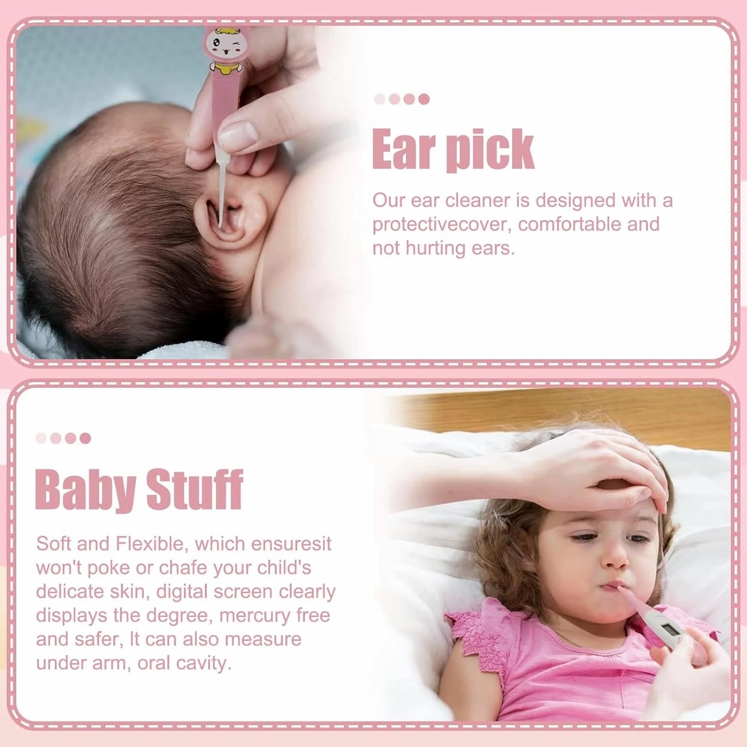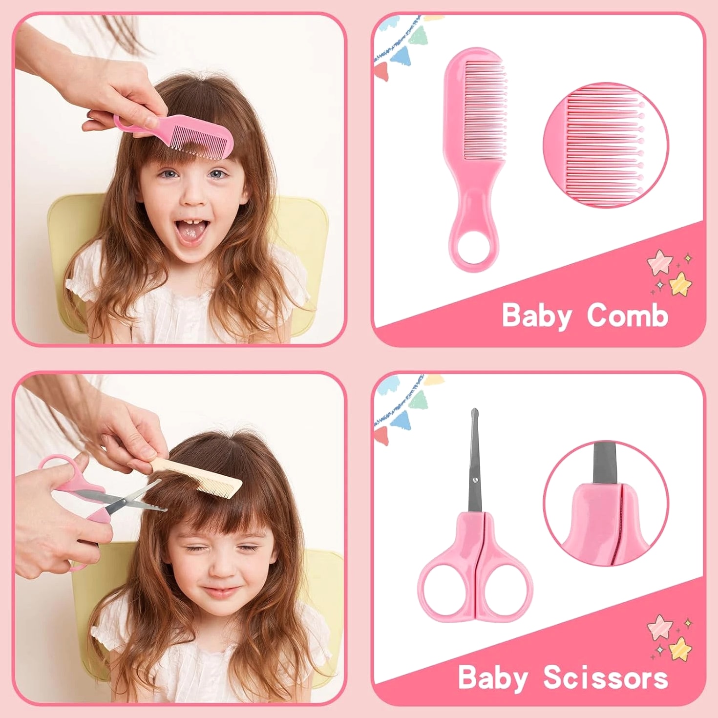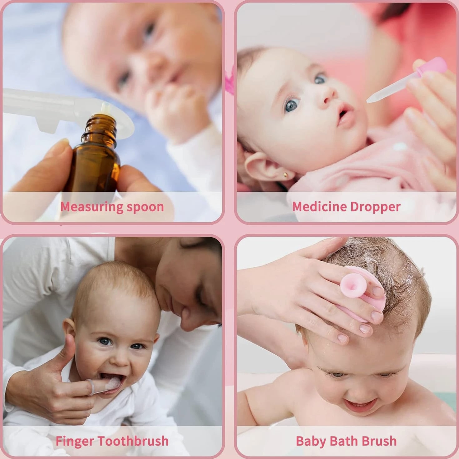 Baby Healthcare & Grooming Kit 20 in 1 Baby Safety Set Newborn Nursery Health 【20 in 1 BABY CARE SET】baby grooming set includes baby comb, baby brush, baby silicone brush, baby nail clipper, nail file, baby tweezers, medicine dropper, measuring spoon, nasal aspirator, baby scissors, finger toothbrush, disposable cleaning wipes, and more. Each of them has great practical value. All products are carefully prepared for newborns to fully meet babies' daily needs! 【SPECIALLY DESIGNED FOR BABY】1. Grooming set: scissors with round blades, round teeth, comb with soft brush and silicone brush, gentle and non-irritating, suitable for baby's hair grooming and bath use; 2. Plastic tweezers, nasal aspirator and nail clipper with stopper to ensure baby's safety and comfort when using; 3. Dropper and measuring spoon with scale, convenient for you to measure the amount accurately, featuring comfortable silicone finger toothbrush to clean baby's teeth and tongue. 【MATERIAL SAFETY】 Newborn baby essentials set made of food-grade silicone and ABS high-quality plastic, free of BPA and harmful substances for babies, to provide the best safety and health protection for babies. The baby care set is safe for babies and suitable for the delicate skin of newborns. Provide your baby with intimate care and grooming for a healthier baby. 【THE PERFECT BABY CARE GIFT】The Baby Grooming Set contains individual sets for baby's body care and is very practical for use with an age range from newborn to toddler use. It is suitable for both baby girls and baby boys. This baby set is simply the ideal gift for moms-to-be or first-time parents. 【TRAVEL MUST HAVE PORTABLE】The Baby Safe Care Kit comes with a sturdy, waterproof storage bag, packs 6.3*4.3*1.57inches and weighs about 0.8lbs, making it easy to carry and store at home or for travel, and is suitable for use from newborn to toddler! High-end nursery care kit perfect as a birthday gift, baby shower gift or newborn gift! Product Description Esonto 20 in 1 Portab