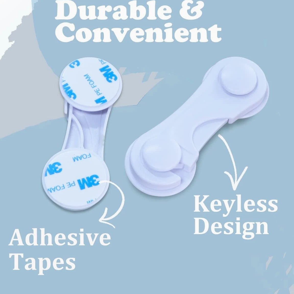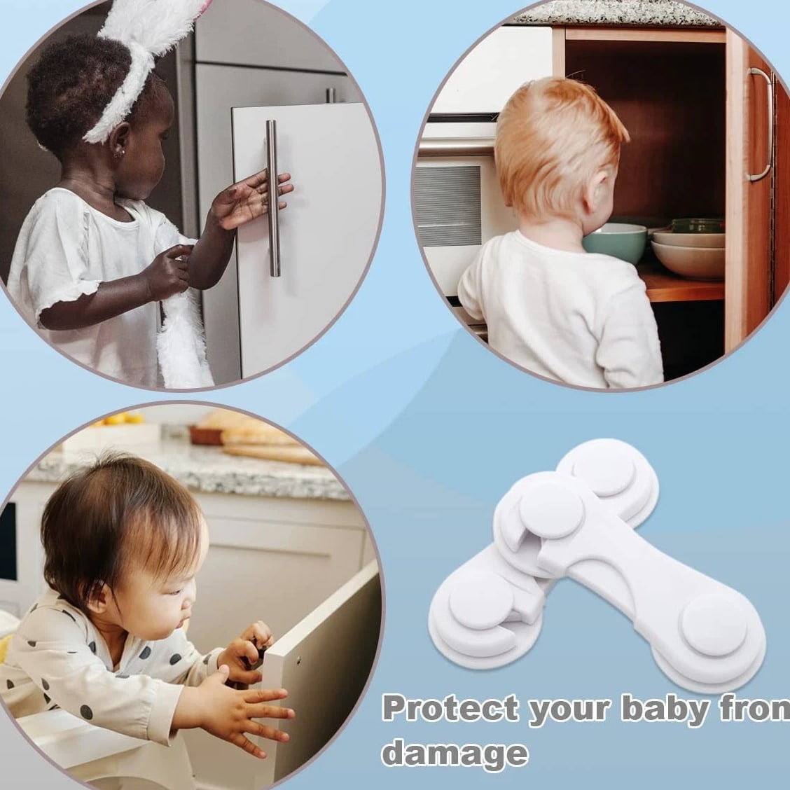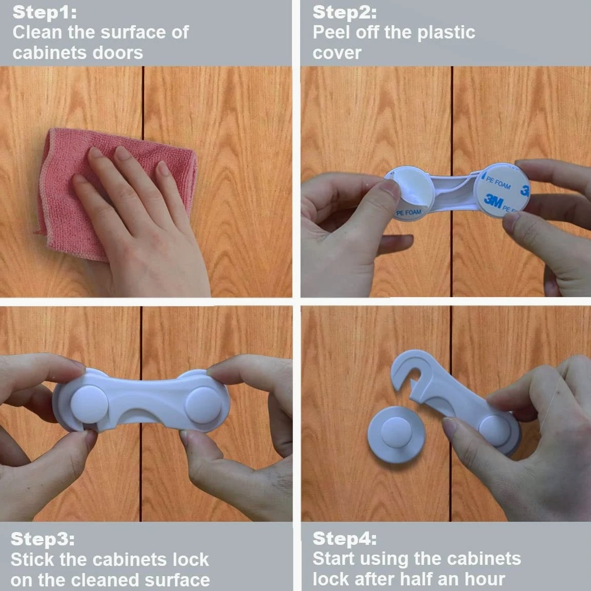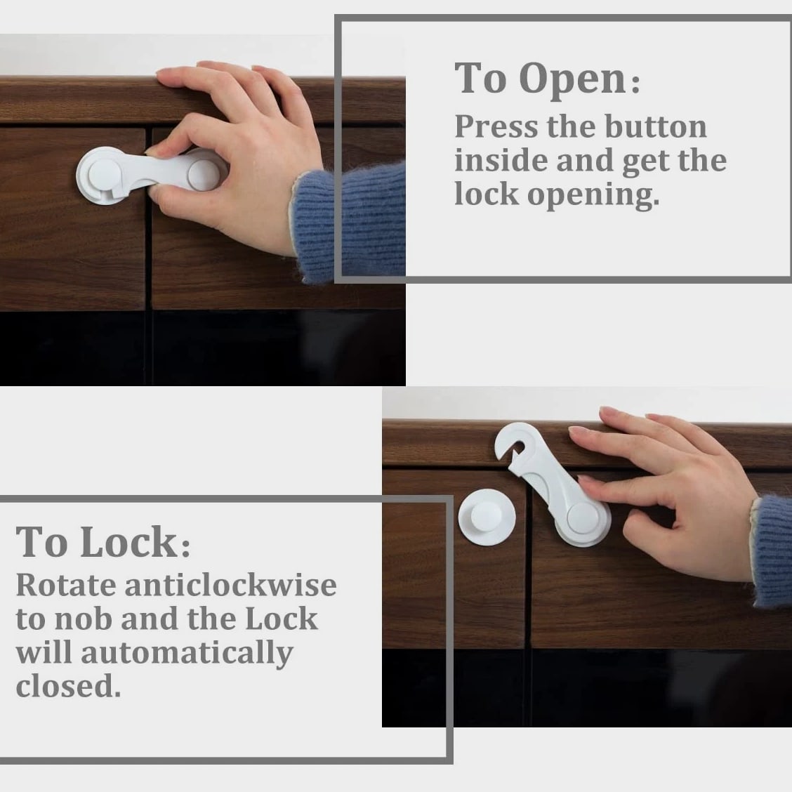 Cabinet Door Locks for Baby Proofing & Child Safety, 4 Pack Childproof Cabinet Locks with Adhesive for Drawer Cupboards Fridge Closet and Pantry, Child Proof Latch for Protecting Kids (White-4 Pcs) Keep Kids Safe: KongNai cabinet locks designed for preventing children from opening cupboards drawers closets easily and being hurt by dangerous items inside. Compared with straps locks, this latch lock has no sharp edges and is more safety for kids. Easy To Install: This baby proofing gadget comes with adhesive tapes, making installation simple. Just peel off the film of adhesive and stick the child lock on the cleaned surfaces of door; no drills or tools needed. The installation process is very simple. Pre-Purchase Notice: 1.This adhesive cabinet lock not suitable for cabinet doors with uneven or rough surfaces; 2.The dimensions of this cabinet lock are 3.93 x 1.48 x 0.39 inches. Please confirm that these dimensions are compatible with your cabinet. Ensure that the gap between the two cabinet doors does not exceed 1 inch; 2.This adhesive cabinet lock not suitable for cabinet doors with uneven or rough surfaces. One-Handed Operation: KongNai Drawer latches for child safety features a keyless design. The home safety tools are easy to open and close for adults; you can just use one hand to press the button and lift the latch to open it. For children, it is not easy to open. High Quality: The child proof cabinet latches are made of superior ABS Resin. Durable, nontoxic and odorless. The baby proof tool is difficult to be broken by toddlers. Provides maximum protection for baby boys and girls. Do you have a cute baby who likes to empty your closet cabinet or drawer? Or a pet who has a tendency to open closets and pantry? Are you worried about your baby having access to open closet door and play with damage items? KongNai baby proofing cabinet locks will provide you peace of mind as these locks either limit or completely stop the opening of a cabinet door. Essential Baby Sa