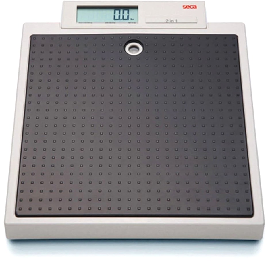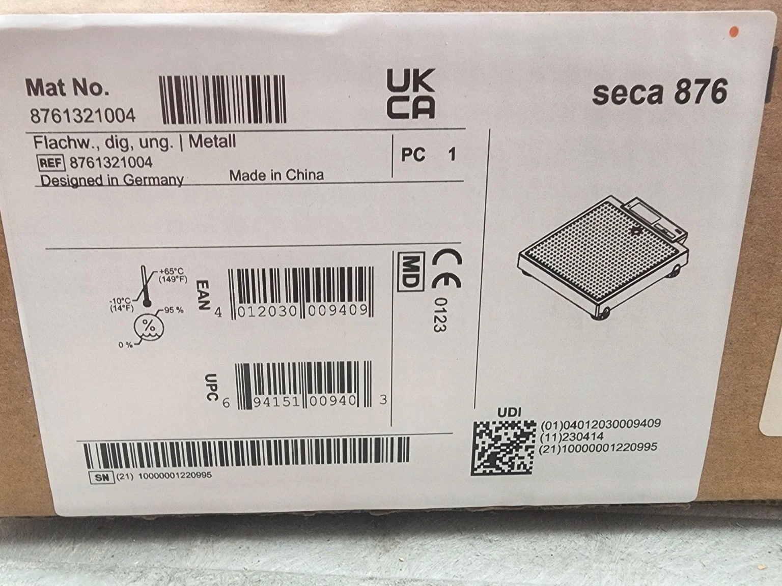 New, Model Seca 876 Precise weighing technology for medical use May be used standing up thanks to the foot pedals and tap-on function Can weigh 10,000 times with a single set of batteries Mother/child function to weigh toddlers Capacity: 550 lbs / 250 kg Graduation: 0.2 lb < 330 lbs > 0.5 lb / 100 g < 150 kg > 200 g Accuracy of the first calibration ± 0.15 % Capacity 250 kg 550 lbs Unit kg/lbs/sts Graduation 100 g < 150 kg > 200 g 0.2 lb < 330 lbs > 0.5 lb Power supply Batteries Batteries, quantity and type 6 X AA Turn-off time with batteries 20 s Turn-on time with activated HOLD 120 s Digit size 0.8 inch 20 mm Net weight 8.6 lbs 3.9 kg Product width 12.6 inch 321 mm Product height 2.4 inch 60 mm Product depth 14.0 inch 356 mm Platform width 11.3 inch 288 mm Platform height 2.4 inch 60 mm Platform depth 10.9 inch 278 mm