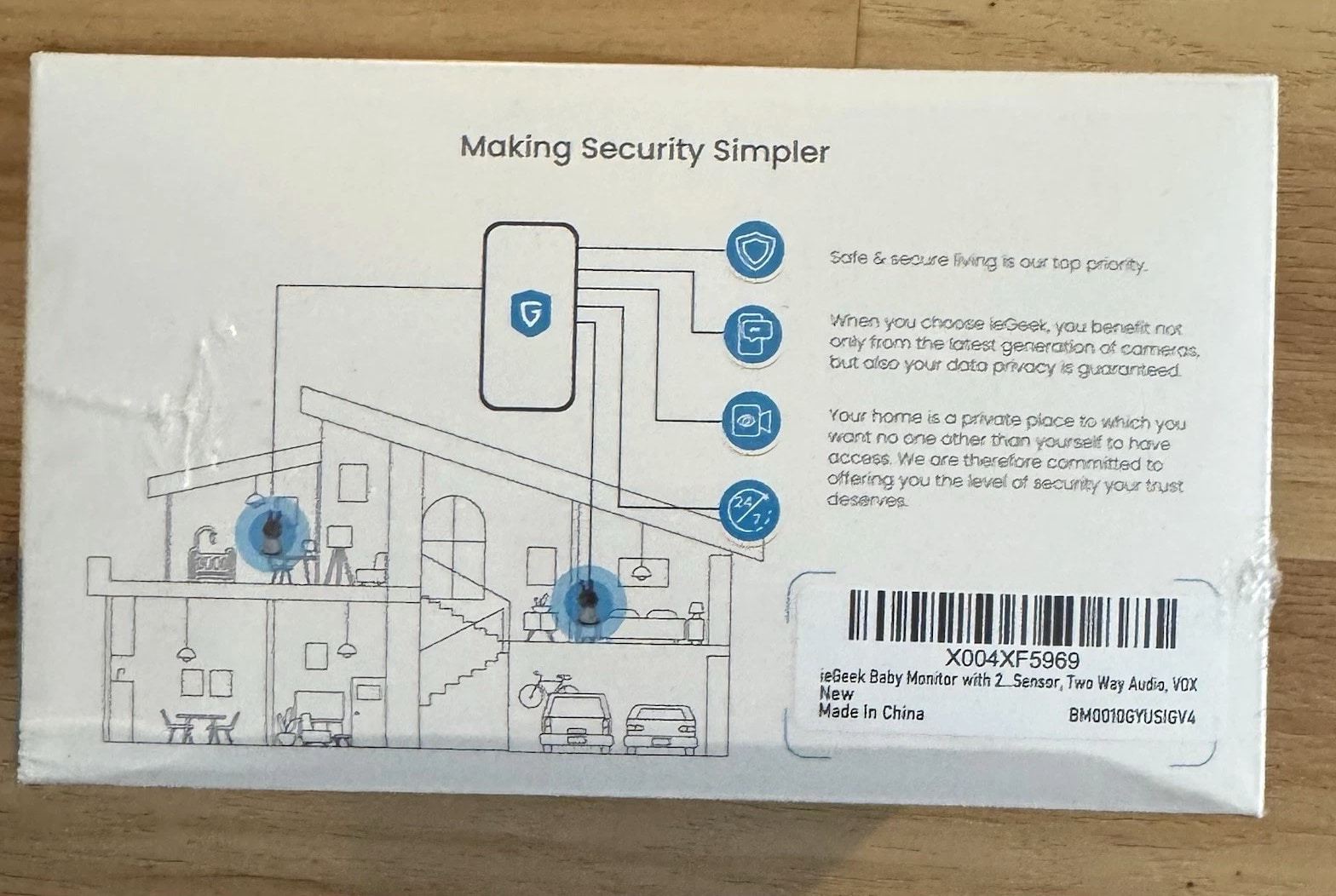 Brand new factory sealed box, pictures included The ieGeek Baby Monitor with 2K HD Resolution is a versatile and advanced video baby monitor camera that offers high-quality monitoring capabilities. With a wide viewing angle of 110° in the horizontal direction, 91° in the vertical direction, and 50° in the depth direction, along with a 1/20s to 1/10000s shutter speed, this camera provides clear images of your baby at all times. The unit also features digital wide dynamic range, built-in speaker and microphone for audio input/output, and a variety of features such as portable design, infrared vision, two-way audio, volume control, battery warning, and lullaby options. With smart alarm support for motion detection and data security measures like AES128 encryption, this baby monitor offers peace of mind for parents looking to keep a close eye on their little one.