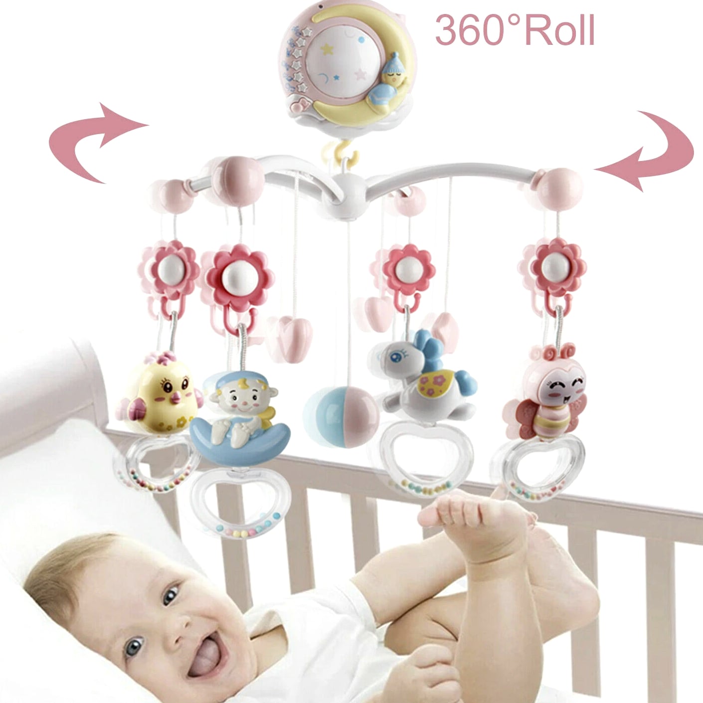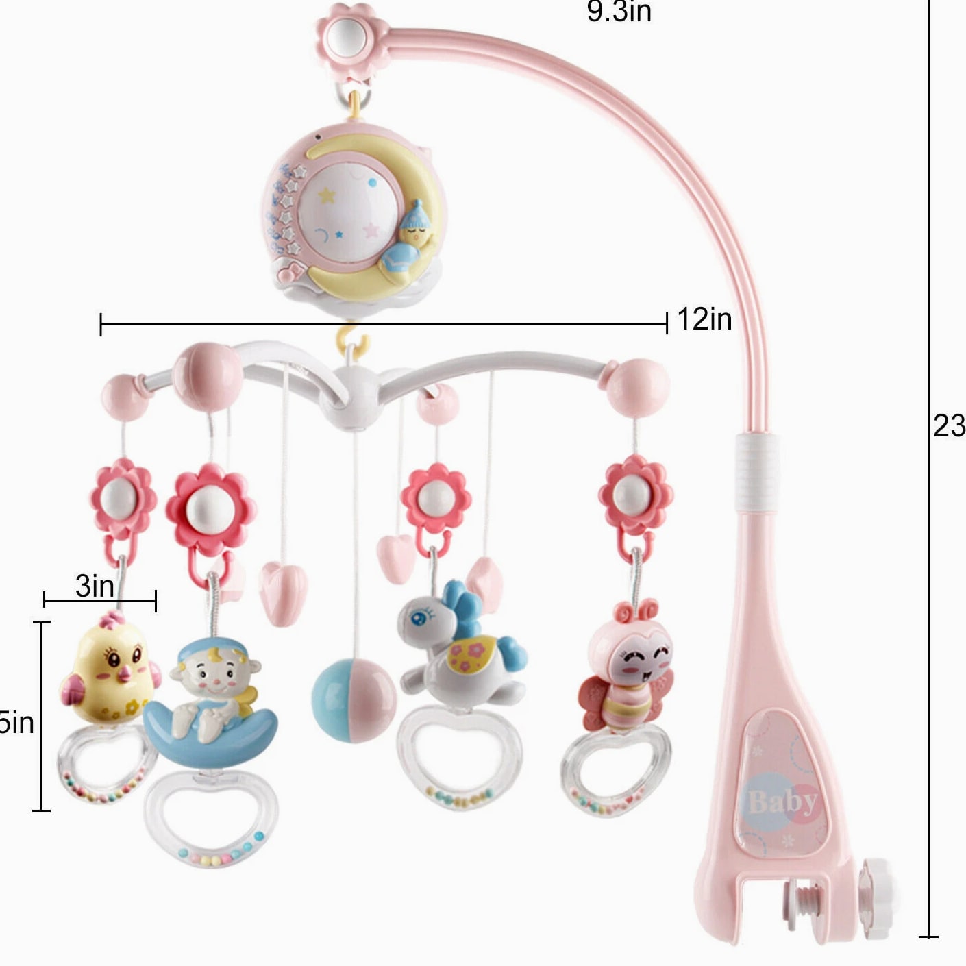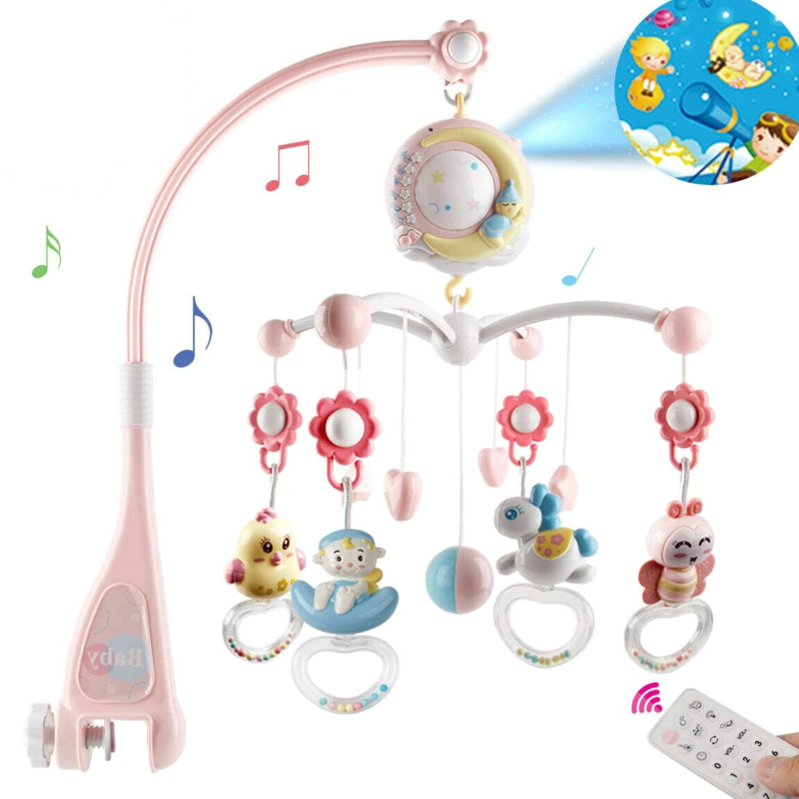 Crib Mobile Cot Music Box Projector Spinning Rattle Toy Nursery Baby Newborn Projection and night light The crib mobile has star lights and 2 types of projection and 4 scene modes. Night Light with sweet music or sounds that play along will comfort your baby during quiet times or during naps and make them feel safe at night Colorful Spinning Baby Musical Crib Mobile The music box features six buttons with which you can switch between the functions. This will help babies determine the cause and effect associated with pressing the buttons. Simple to install. Suitable for cots, strollers, bassinets, car seats, carry cots, etc. Mobile with music Four soothing music modes - 150 quiet lullabies, 10 organ, 10 baby song and 5 nature sounds stored in the music box. Volume adjustable by long press. Timing sleep mode The music box can be set to 20/40/60 minutes and then automatically closed at the time you specify. Let the baby fall asleep in a comfortable and calm environment Simple to install Only fits for cribs with square rails. The maximum width of the cot rail is 1.8 inches. Please check whether it fits your cot. The clamp is not suitable for round or soft rails. Remote control It's very convenient to control the Mobile hanging toy by remote. Pink Kid Baby Sleep Crib Cot Pram Music Light Hanging Bell Toy Mobiles Decor Removable music box No matter where baby goes, the music box is easy to take with you in the baby seat, pram or bassinet, etc. When the mother takes the baby out, she can simply attach the music box to the baby seat. Let your baby have fun anywhere! Night lightsComfort your baby with sweet music or sounds and a glowing night light during quiet times or during naps. It makes the baby feel safe at night Package Contents: Color: pink 1 x crib movement arm; 1 x support arm 1 x music box 1 x doorbell ring 1 x pylon 1 x infrared remote control; 4 x hanging toys; 1 x screwdriver (as a gift)