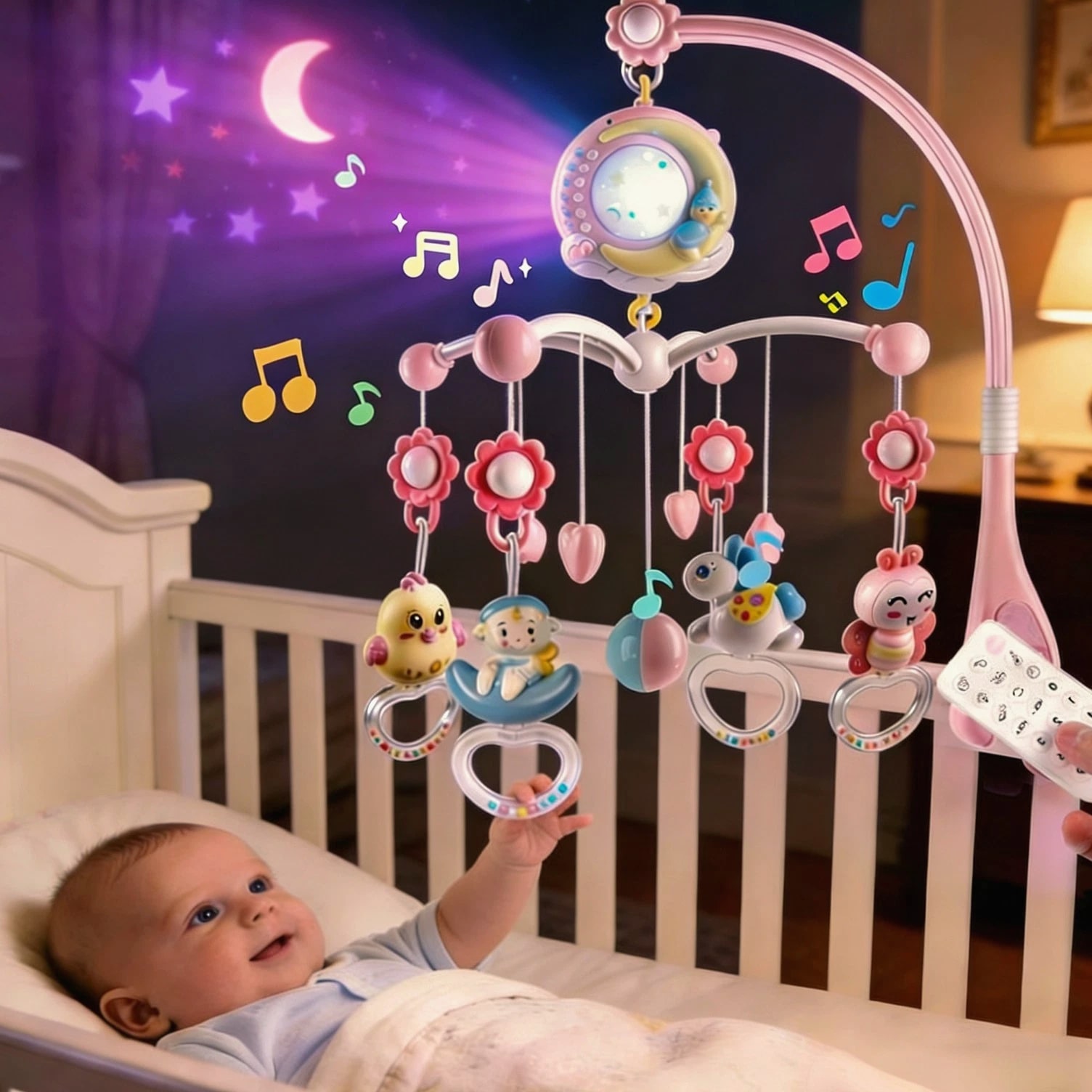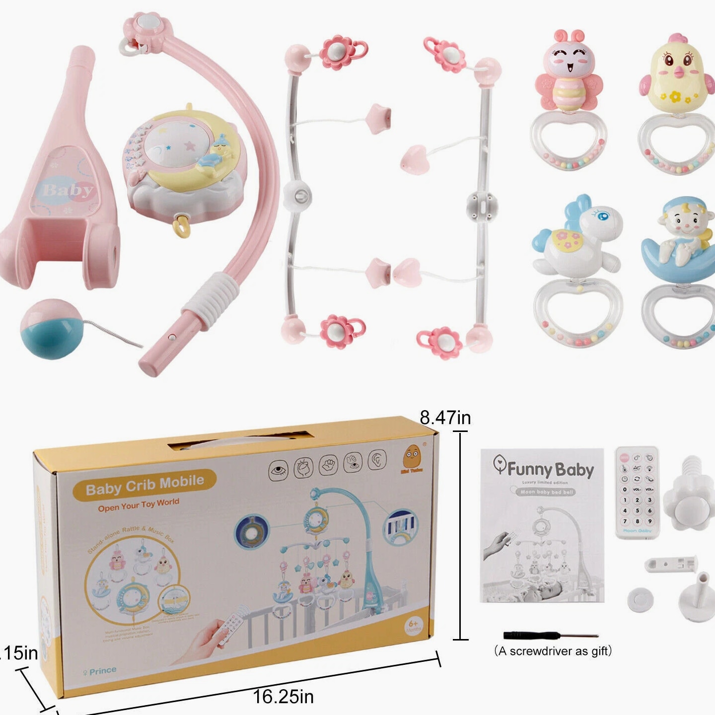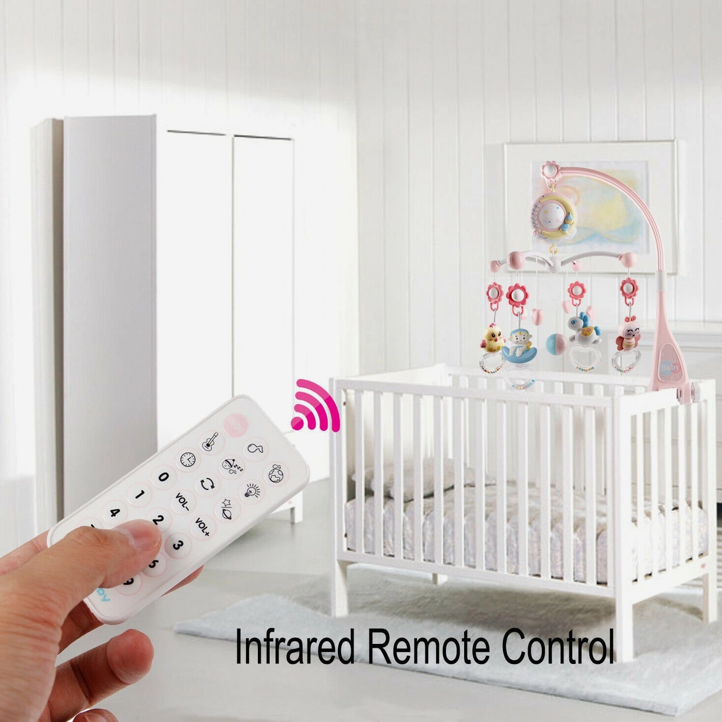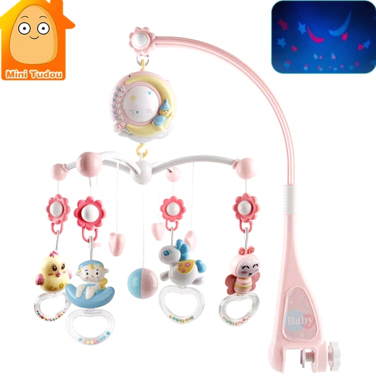 Crib Mobile Cot Music Box Projector Spinning Rattle Toy Nursery Baby Newborn Projection and night light The crib mobile has star lights and 2 types of projection and 4 scene modes. Night Light with sweet music or sounds that play along will comfort your baby during quiet times or during naps and make them feel safe at night Colorful Spinning Baby Musical Crib Mobile The music box features six buttons with which you can switch between the functions. This will help babies determine the cause and effect associated with pressing the buttons. Simple to install. Suitable for cots, strollers, bassinets, car seats, carry cots, etc. Mobile with music Four soothing music modes - 150 quiet lullabies, 10 organ, 10 baby song and 5 nature sounds stored in the music box. Volume adjustable by long press. Timing sleep mode The music box can be set to 20/40/60 minutes and then automatically closed at the time you specify. Let the baby fall asleep in a comfortable and calm environment Simple to install Only fits for cribs with square rails. The maximum width of the cot rail is 1.8 inches. Please check whether it fits your cot. The clamp is not suitable for round or soft rails. Remote control It's very convenient to control the Mobile hanging toy by remote. Pink Kid Baby Sleep Crib Cot Pram Music Light Hanging Bell Toy Mobiles Decor Removable music box No matter where baby goes, the music box is easy to take with you in the baby seat, pram or bassinet, etc. When the mother takes the baby out, she can simply attach the music box to the baby seat. Let your baby have fun anywhere! Night lightsComfort your baby with sweet music or sounds and a glowing night light during quiet times or during naps. It makes the baby feel safe at night Package Contents: Color: pink 1 x crib movement arm; 1 x support arm 1 x music box 1 x doorbell ring 1 x pylon 1 x infrared remote control; 4 x hanging toys; 1 x screwdriver (as a gift)