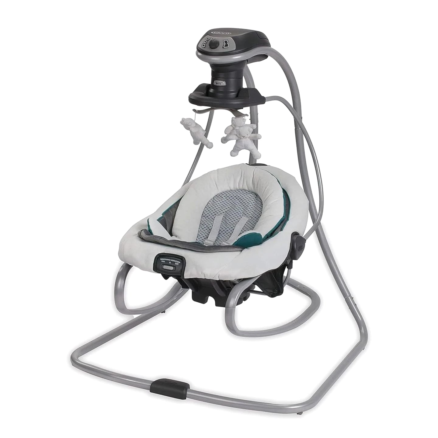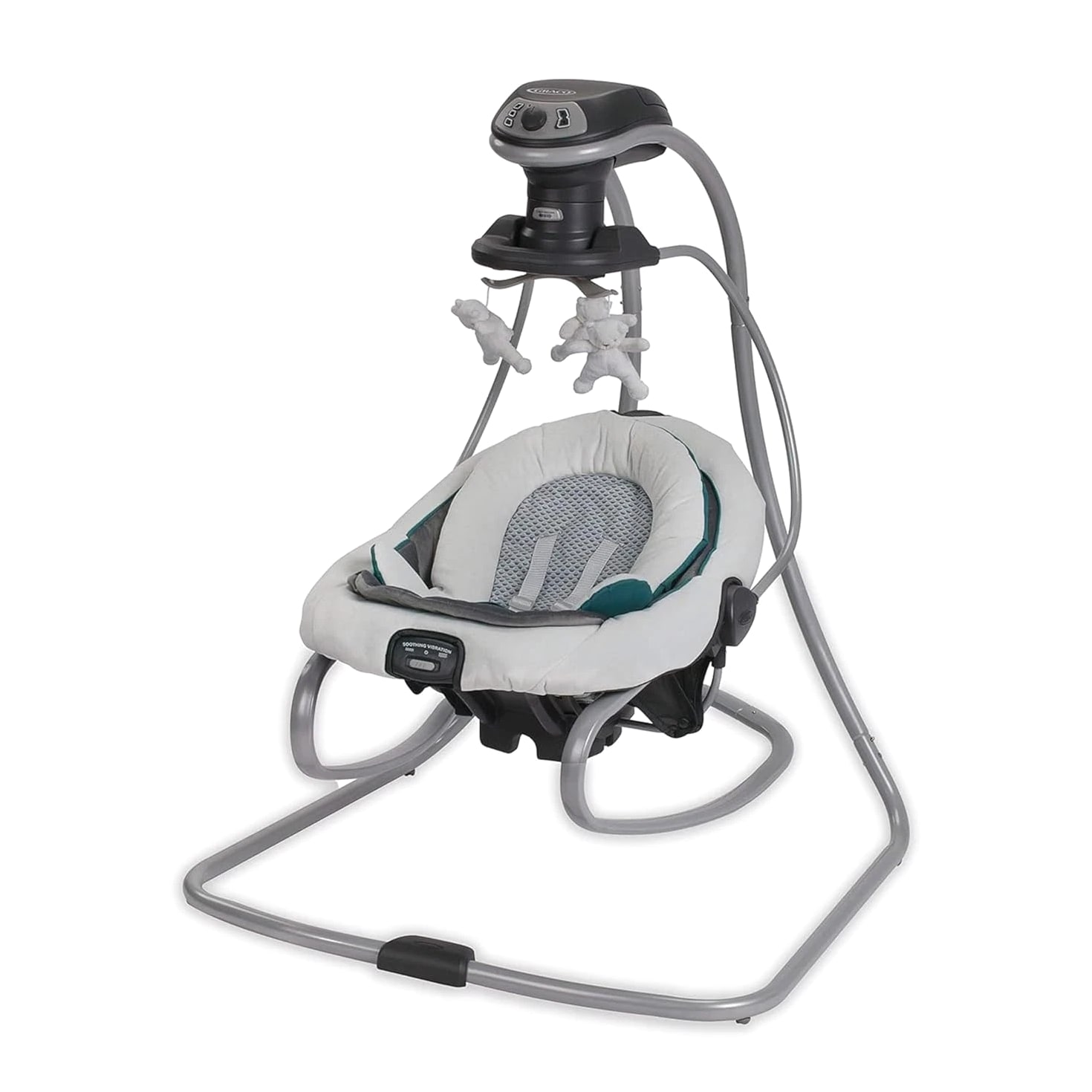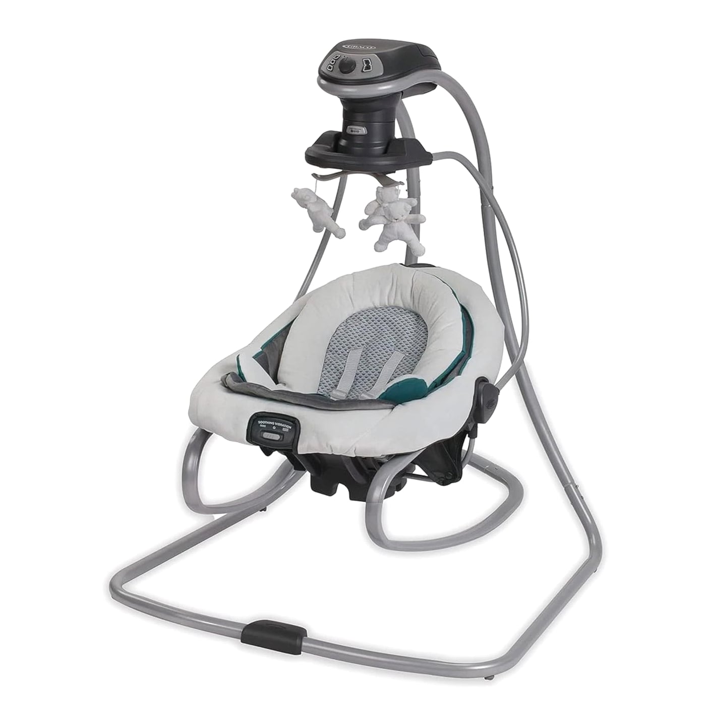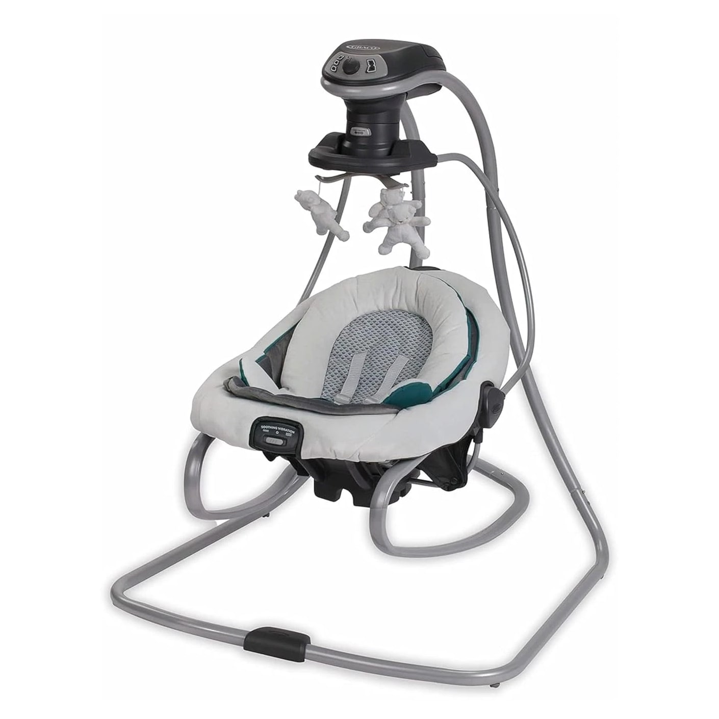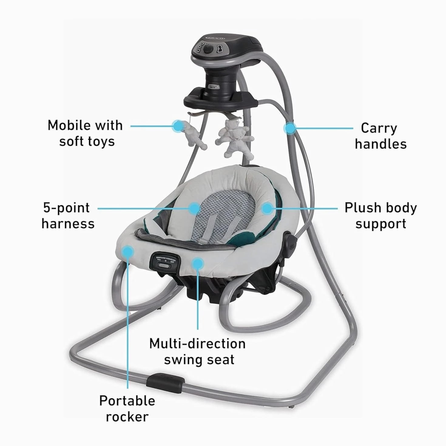 Graco DuetSoothe Product Description The Graco® DuetSoothe™ Swing and Rocker features an ingenious seat that doubles as a portable rocker, giving you the flexibility to move around the house while keeping baby cozy and close by. In swing mode, 3 swinging directions and 6 speeds allow you to customize the swing to match baby's preferences. With additional features including 2-speed vibration, an overhead toy mobile, and soothing songs and sounds, the Graco® DuetSoothe™ Swing and Rocker gives you even more options to keep baby content. Brand Story By Graco