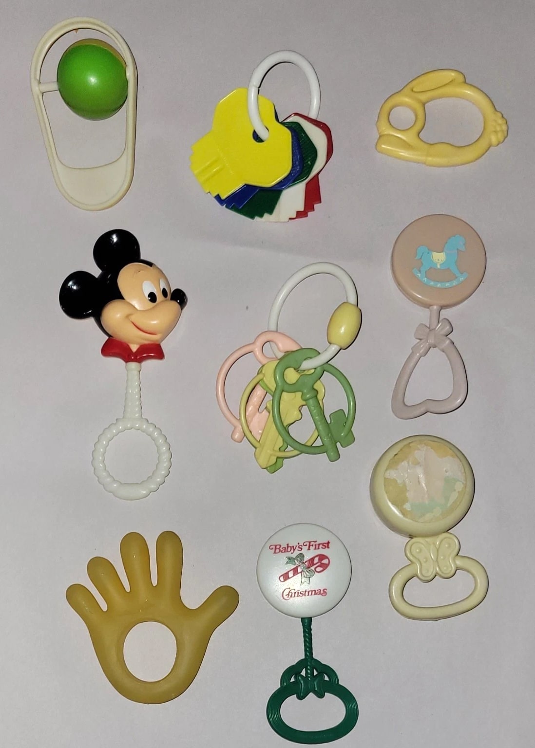 Vintage Lot Of 9 Baby Rattles And Teethers - Mickey Mouse, Keys, Rattle