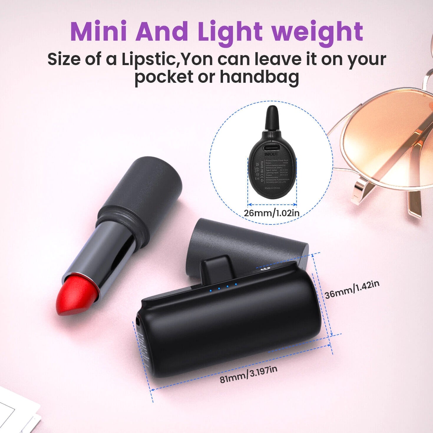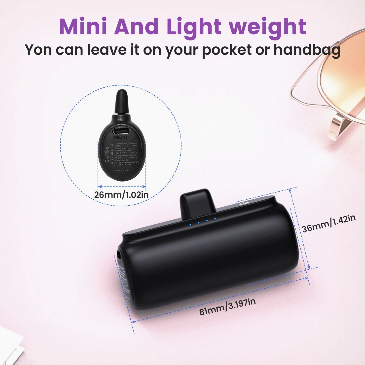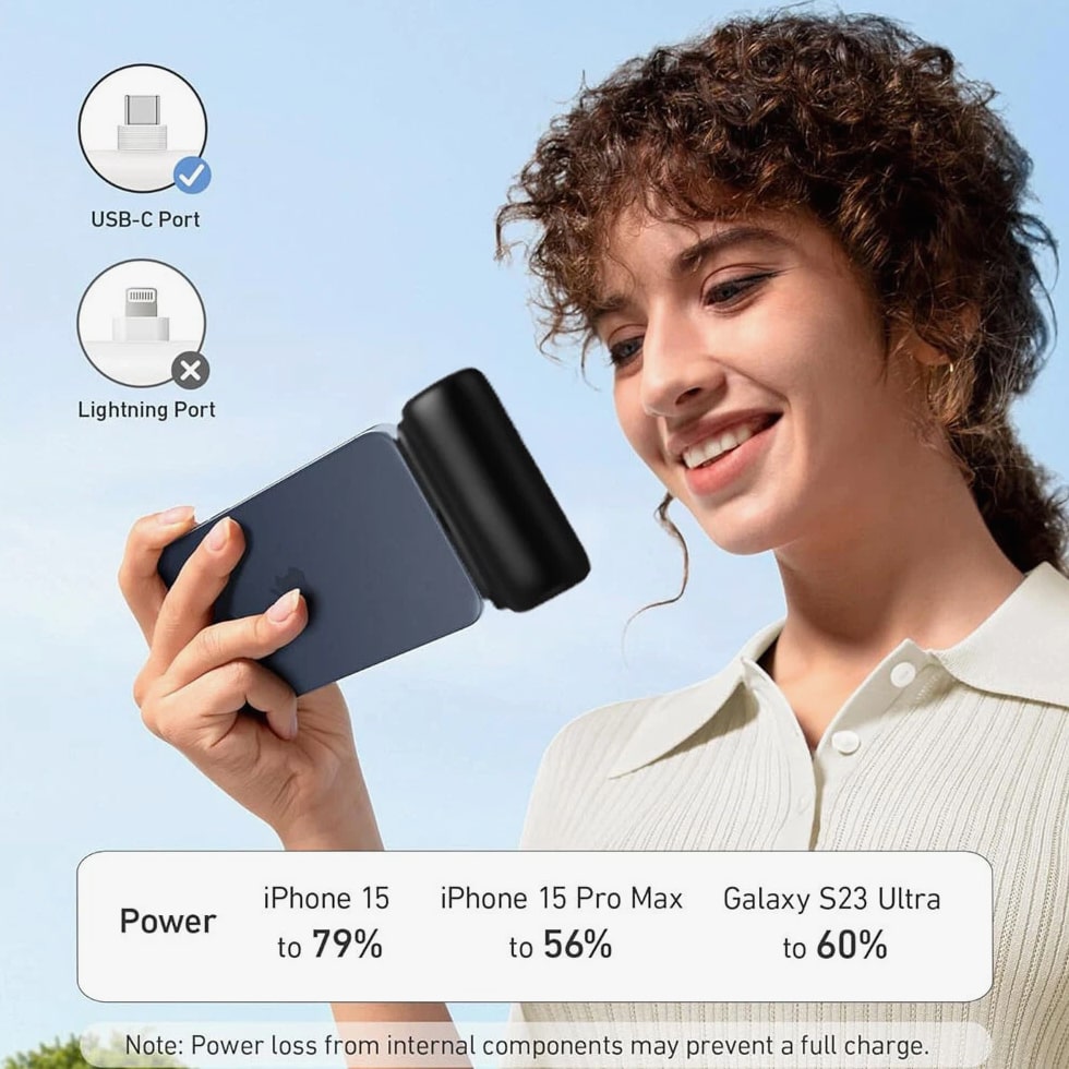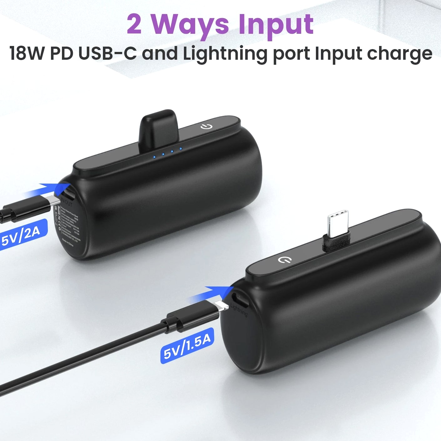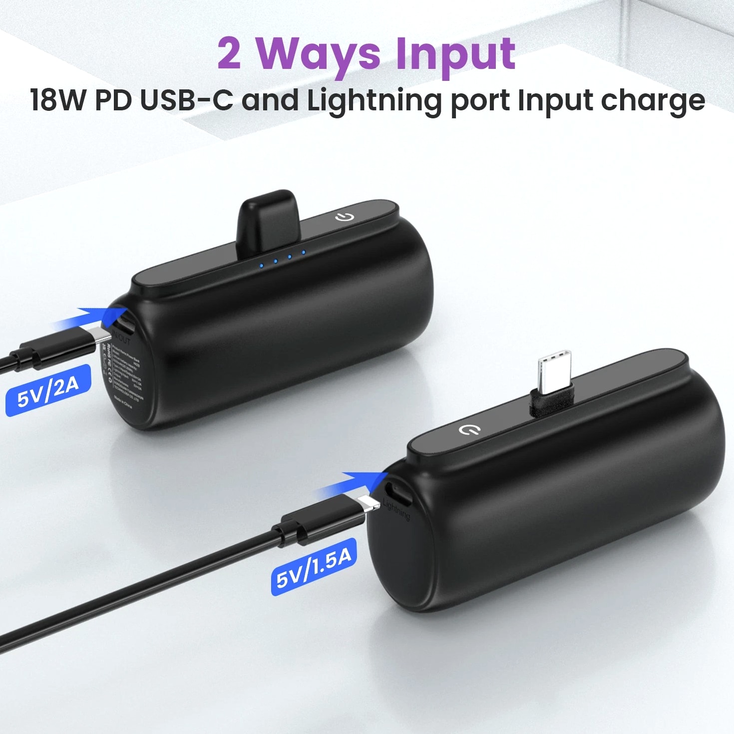 Feature: Built in Connector: Just plug into your iPhone to charge. No need for any cable and also no need to take off the phone case; attaches to phone easily. A small cap protects the connector when not in use. Compatible with any types of phones. High Capacity: Contains 5500 mAh of power. Enough to provide 1.1 times charge for Samsung Galaxy S22 S21 S20 S10 or for iPhone 15/15Pro/15plus/15 Pro max, 1.2 times for other phones. The capacity is sufficient for emergency use when going out. Ultra-Compact: Remarkably small and lightweight. So mini it's just like a lipstick or lighter. Very tiny to fit into your purse, pocket, etc. Requires less space, allows you to carry everywhere. High-Speed Charging: Fast-Charging Technology provides the fastest possible charge to any phone or tablet. Equipped with Pass-Through Function, you can charge your phone while recharging the power bank. Super Safety: Intelligent controlling IC effectively prevents your power bank from overvoltage, overcurrent and short circuit. Product Specification: - Capacity: 5500mAh / 20.35Wh - USB C Input: 5V / 2.0A (18W PD) - IOS Input: 5V / 1.5A - USB C Output: 5V / 1.5A (18W PD) - IOS Output: 5V / 1.5A - Size: 3.16''x1.42''x1.01'' - Weight: 3.15oz Package includes: 1 x 5500mAh Small Portable Charger Power Bank 1 x USB C Cable 1 x User Manual