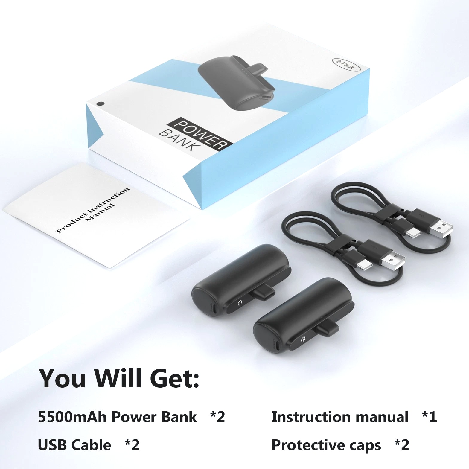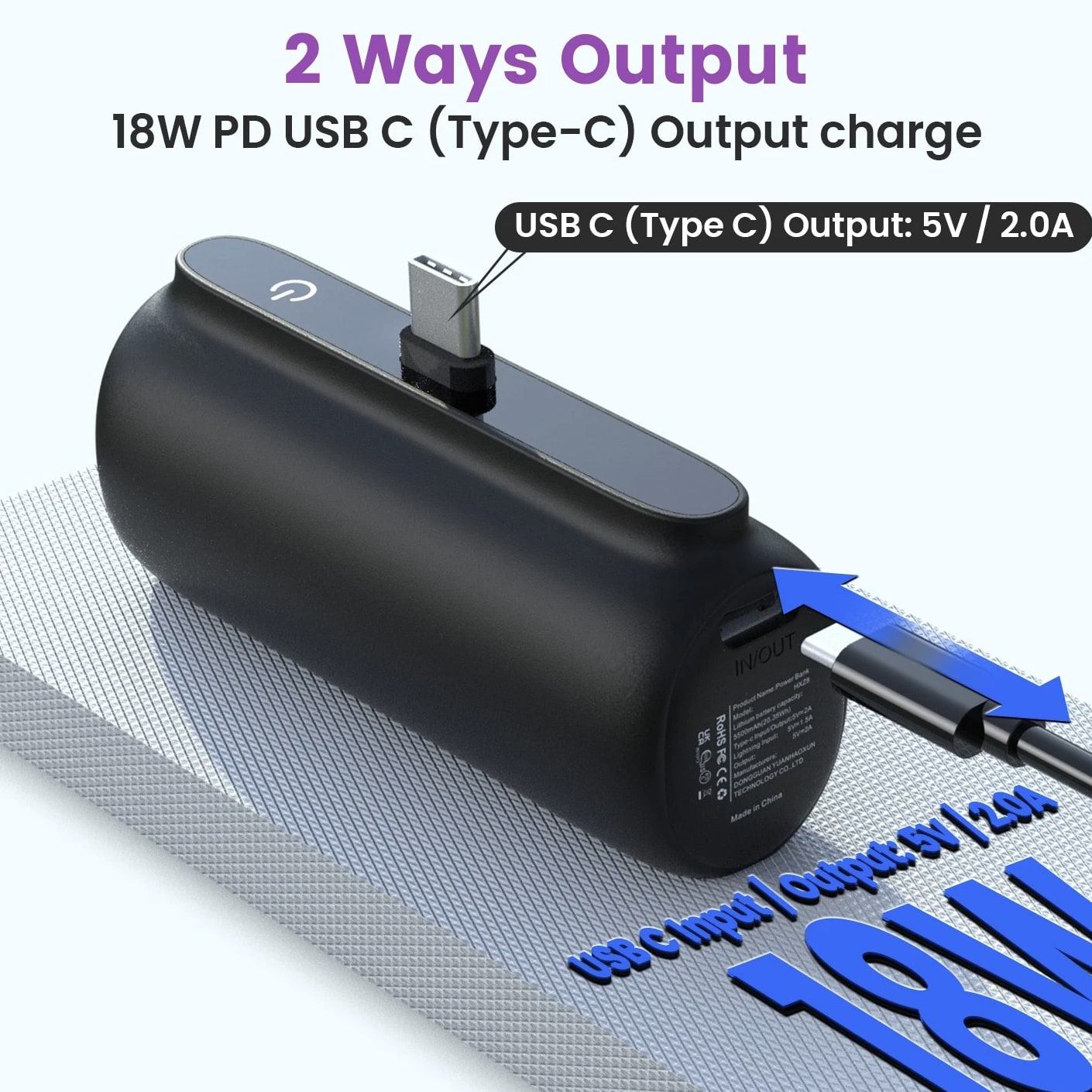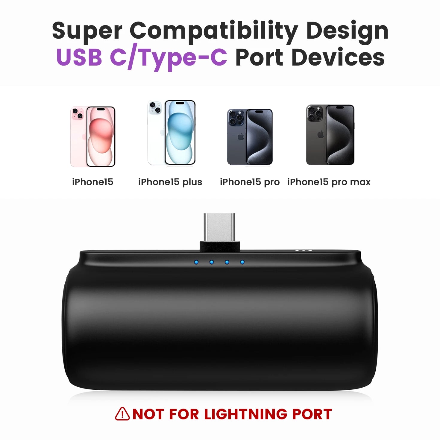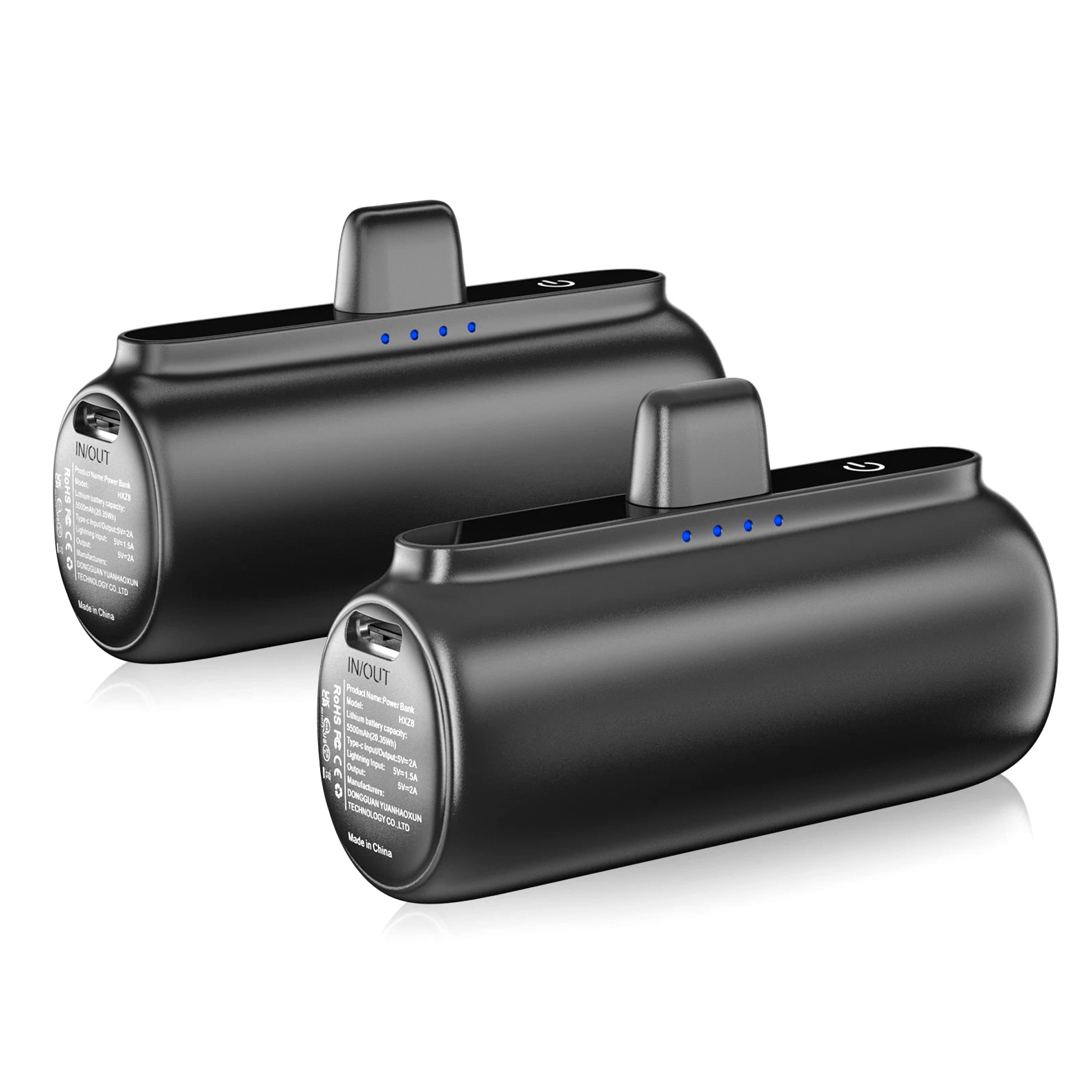 Feature: Built in Connector: Just plug into your iPhone to charge. No need for any cable and also no need to take off the phone case; attaches to phone easily. A small cap protects the connector when not in use. Compatible with any types of phones. High Capacity: Contains 5500 mAh of power. Enough to provide 1.1 times charge for Samsung Galaxy S22 S21 S20 S10 or for iPhone 15/15Pro/15plus/15 Pro max, 1.2 times for other phones. The capacity is sufficient for emergency use when going out. Ultra-Compact: Remarkably small and lightweight. So mini it's just like a lipstick or lighter. Very tiny to fit into your purse, pocket, etc. Requires less space, allows you to carry everywhere. High-Speed Charging: Fast-Charging Technology provides the fastest possible charge to any phone or tablet. Equipped with Pass-Through Function, you can charge your phone while recharging the power bank. Super Safety: Intelligent controlling IC effectively prevents your power bank from overvoltage, overcurrent and short circuit. Product Specification: - Capacity: 5500mAh / 20.35Wh - USB C Input: 5V / 2.0A (18W PD) - IOS Input: 5V / 1.5A - USB C Output: 5V / 1.5A (18W PD) - IOS Output: 5V / 1.5A - Size: 3.16''x1.42''x1.01'' - Weight: 3.15oz Package includes: 1 x 5500mAh Small Portable Charger Power Bank 1 x USB C Cable 1 x User Manual