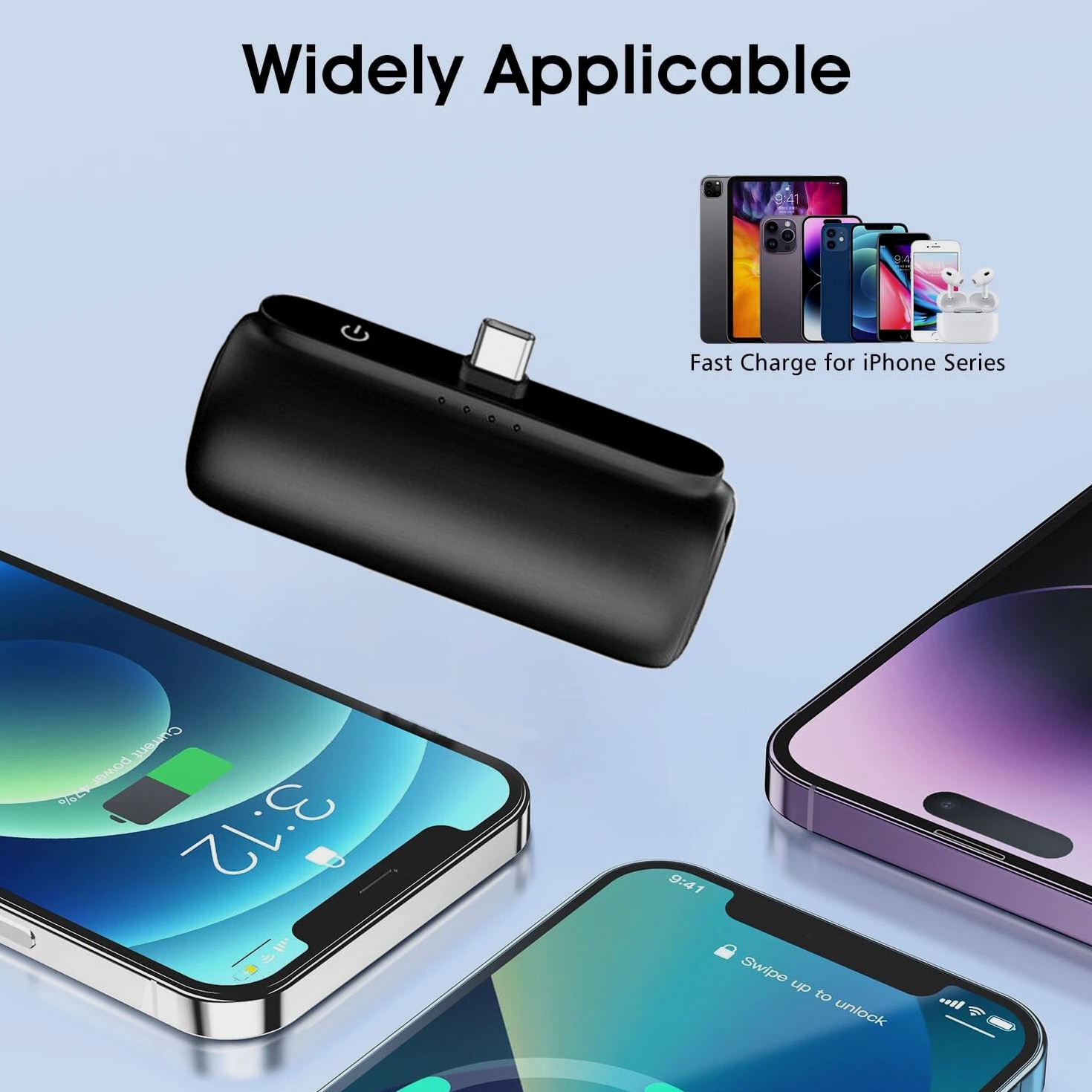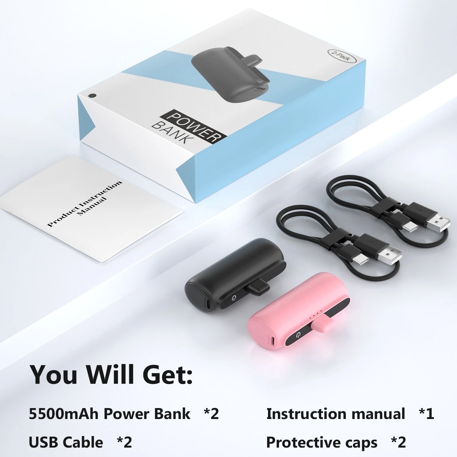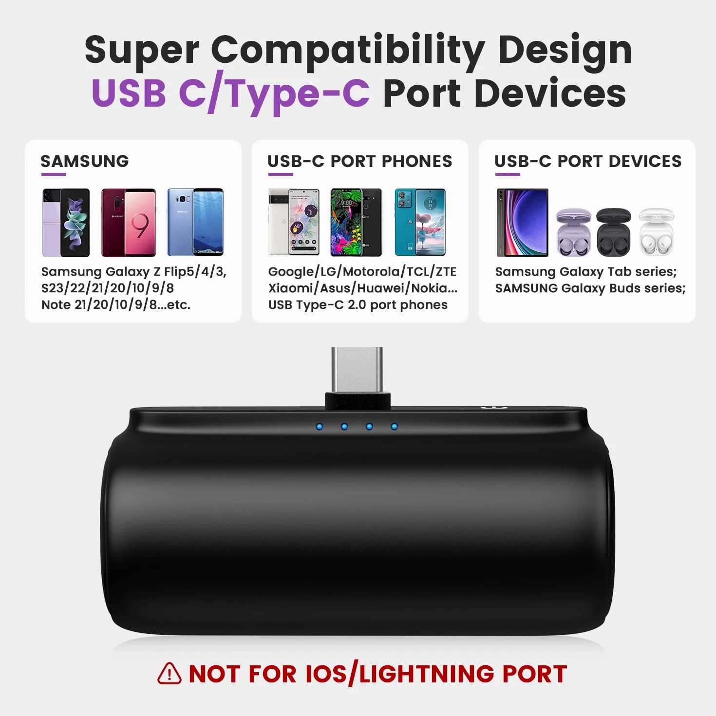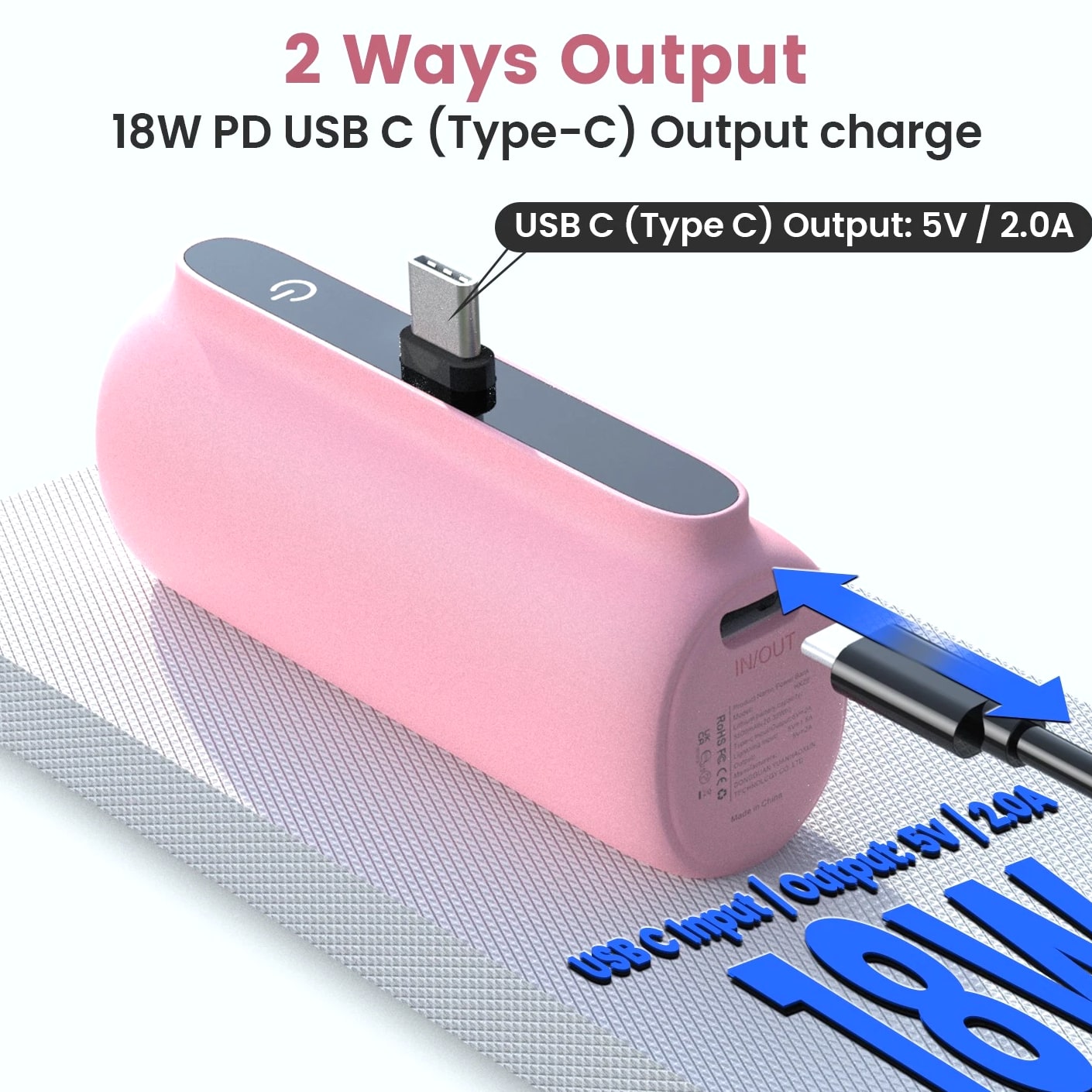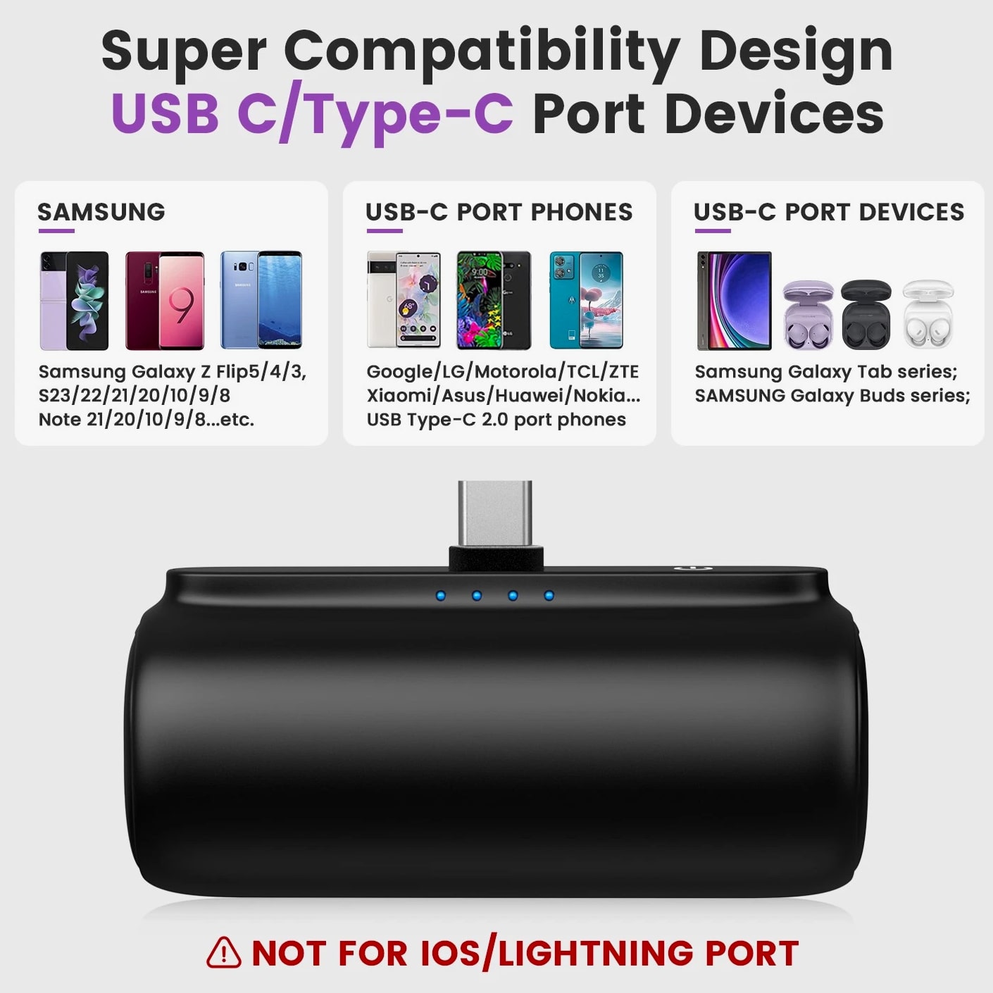 Feature: Built in Connector: Just plug into your iPhone to charge. No need for any cable and also no need to take off the phone case; attaches to phone easily. A small cap protects the connector when not in use. Compatible with any types of phones. High Capacity: Contains 5500 mAh of power. Enough to provide 1.1 times charge for Samsung Galaxy S22 S21 S20 S10 or for iPhone 15/15Pro/15plus/15 Pro max, 1.2 times for other phones. The capacity is sufficient for emergency use when going out. Ultra-Compact: Remarkably small and lightweight. So mini it's just like a lipstick or lighter. Very tiny to fit into your purse, pocket, etc. Requires less space, allows you to carry everywhere. High-Speed Charging: Fast-Charging Technology provides the fastest possible charge to any phone or tablet. Equipped with Pass-Through Function, you can charge your phone while recharging the power bank. Super Safety: Intelligent controlling IC effectively prevents your power bank from overvoltage, overcurrent and short circuit. Product Specification: - Capacity: 5500mAh / 20.35Wh - USB C Input: 5V / 2.0A (18W PD) - IOS Input: 5V / 1.5A - USB C Output: 5V / 1.5A (18W PD) - IOS Output: 5V / 1.5A - Size: 3.16''x1.42''x1.01'' - Weight: 3.15oz Package includes: 1 x 5500mAh Small Portable Charger Power Bank 1 x USB C Cable 1 x User Manual
