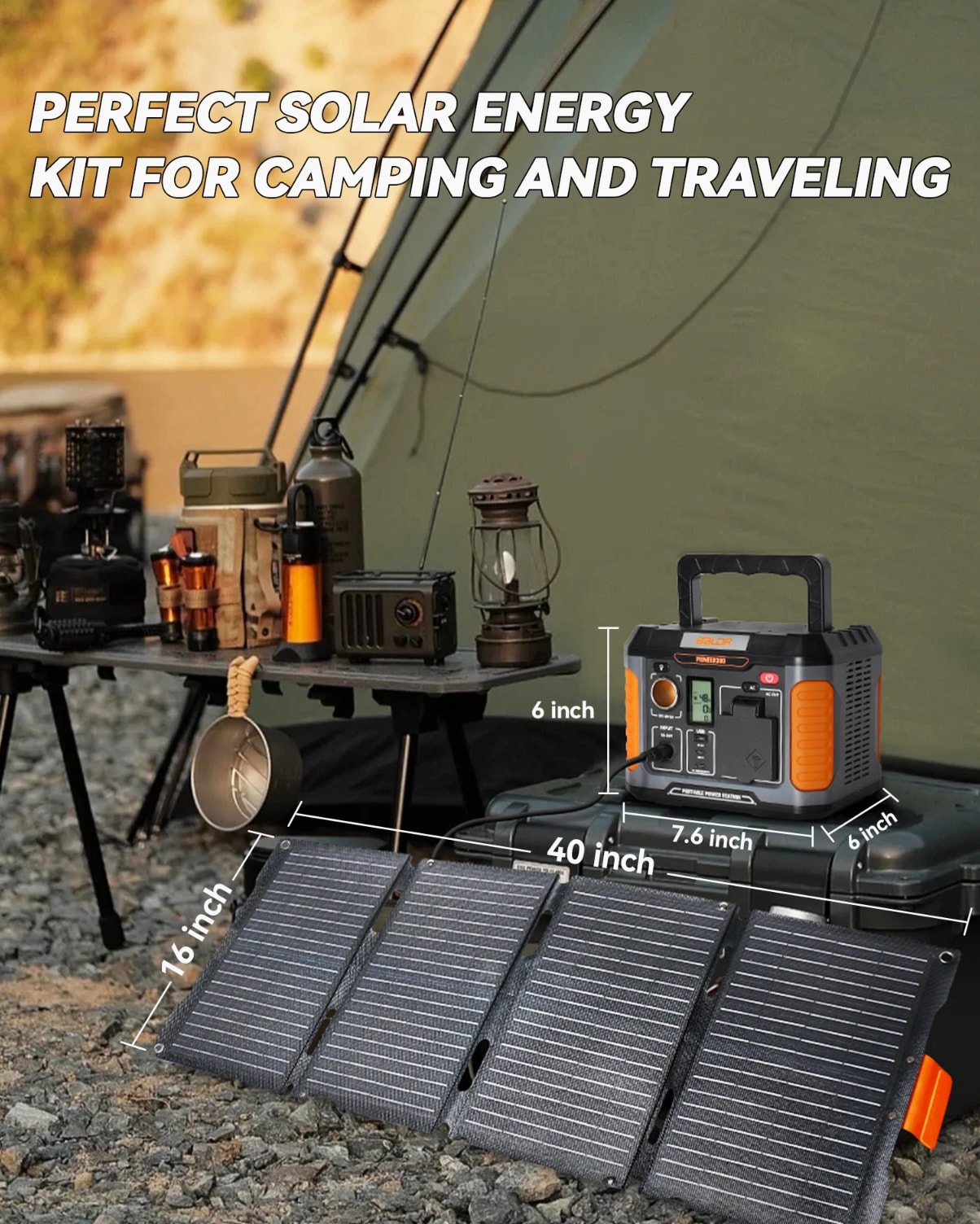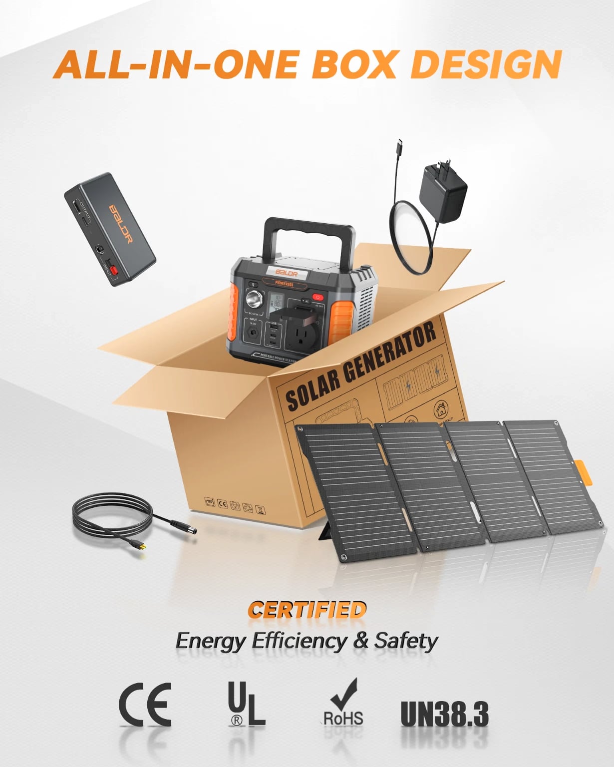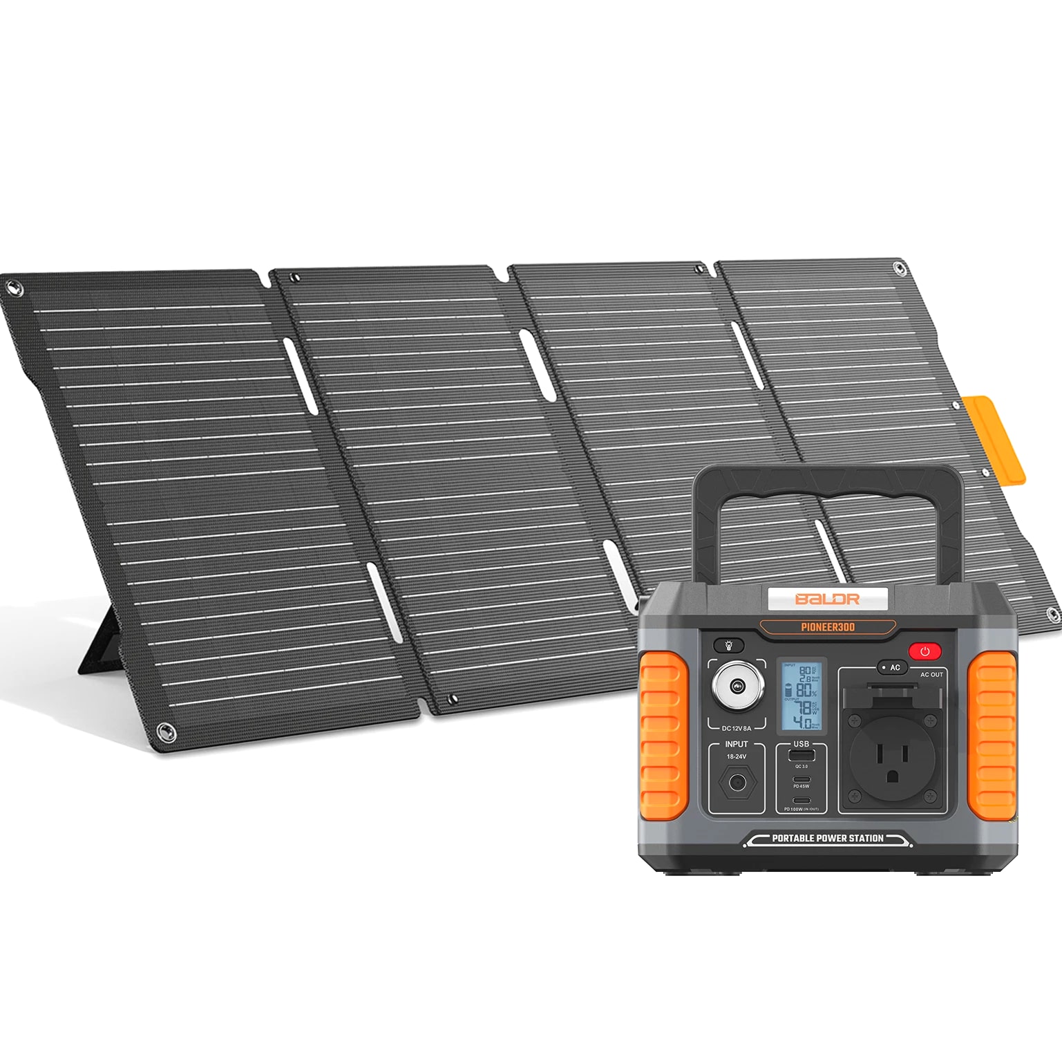 BULLET POINTS: PORTABLE SOLAR GENERATORS: 300W power station + 60W Solar Panel Energy Storage System. POWERFUL SOLAR INPUT: The BALDR 60W solar panel can charge the 300W Portable Power Station from 0% to 100% in 4.2 hours. PORTABLE POWER STATION FEATURES: ①Multiple output ports options. ②USB-C PD 100W, USB-A QC 18W fast charging. ③Support pass through charging. ④Built-in MPPT controller achieves max-charging efficiency ⑤Intelligent LCD Display ⑥7 Safety Protections ⑦ Lightweight, compact and silent operation. PORTABLE SOLAR PANEL FEATURES: ①High-efficient 23.5% energy conversion. ②Advanced monocrystalline solar cell technology. ③Dual kickstands & corner grommets ④Dust-proof & Water-resistant IP65 rating. ⑤Equipped with a removable solar charge controller, this panel features a USB-C PD60w output port and a USB-A 24w output port. ⑥Integrated storage pouch. ⑦Foldable, lightweight & portable. ⑧Durable Construction. OFF GRID ADVENTURES: This convenient and compact solar generator is the perfect addition to your next adventure. Charge devices and power essentials anywhere you go. A PORTABLE SOLAR GENERATOR A portable solar generator uses solar panels to capture the sun's energy, then stores that energy in a battery for later use. You can use this energy to power devices or appliances in your home. Solar-powered generators do not require any fuel, or there might be no need to add fuel during the usage period. Most solar generators are used for RV camping, boats, and as backup power sources in case of grid power outages. BALDR Solar Generator with Panel Included BALDR portable power station with solar panel kit includes a 300w portable power station and a 60w solar panel; this perfect match helps meet the demand of different power needs for outdoor tent camping, travel, trips, hiking, fishing and RV use. During power outages or hurricanes.