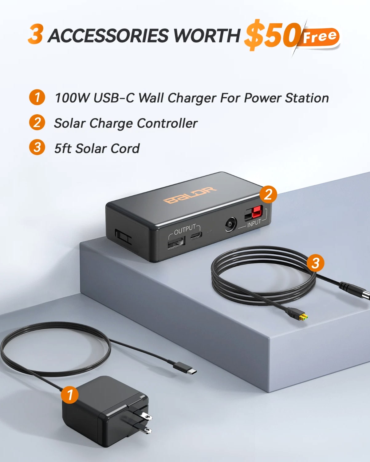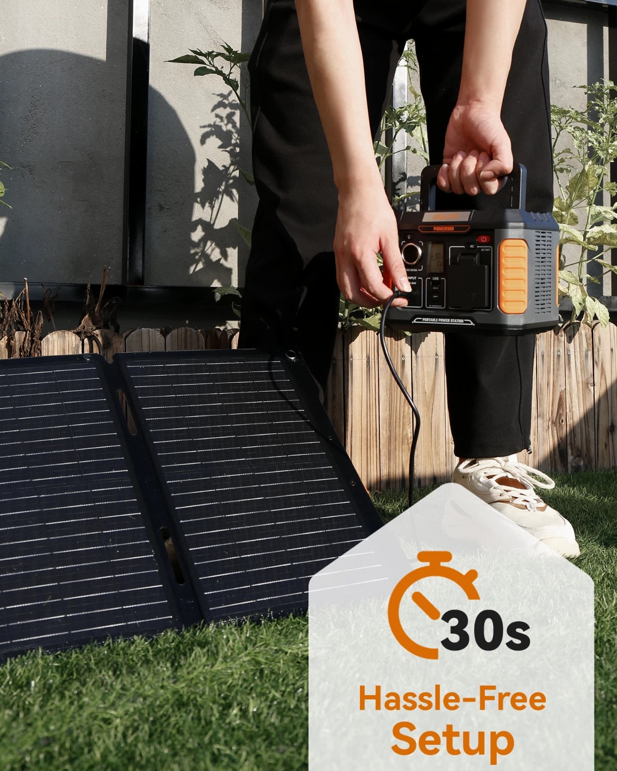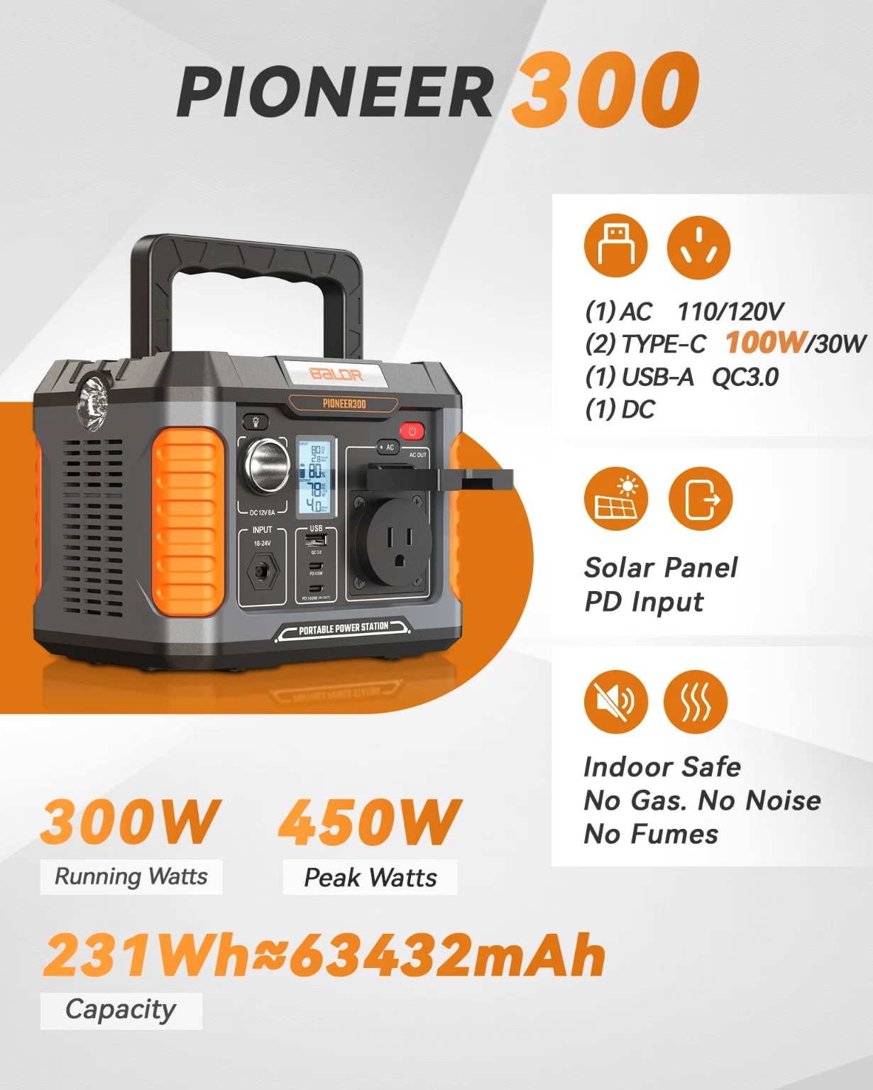 BULLET POINTS: PORTABLE SOLAR GENERATORS: 300W power station + 60W Solar Panel Energy Storage System. POWERFUL SOLAR INPUT: The BALDR 60W solar panel can charge the 300W Portable Power Station from 0% to 100% in 4.2 hours. PORTABLE POWER STATION FEATURES: ①Multiple output ports options. ②USB-C PD 100W, USB-A QC 18W fast charging. ③Support pass through charging. ④Built-in MPPT controller achieves max-charging efficiency ⑤Intelligent LCD Display ⑥7 Safety Protections ⑦ Lightweight, compact and silent operation. PORTABLE SOLAR PANEL FEATURES: ①High-efficient 23.5% energy conversion. ②Advanced monocrystalline solar cell technology. ③Dual kickstands & corner grommets ④Dust-proof & Water-resistant IP65 rating. ⑤Equipped with a removable solar charge controller, this panel features a USB-C PD60w output port and a USB-A 24w output port. ⑥Integrated storage pouch. ⑦Foldable, lightweight & portable. ⑧Durable Construction. OFF GRID ADVENTURES: This convenient and compact solar generator is the perfect addition to your next adventure. Charge devices and power essentials anywhere you go. A PORTABLE SOLAR GENERATOR A portable solar generator uses solar panels to capture the sun's energy, then stores that energy in a battery for later use. You can use this energy to power devices or appliances in your home. Solar-powered generators do not require any fuel, or there might be no need to add fuel during the usage period. Most solar generators are used for RV camping, boats, and as backup power sources in case of grid power outages. BALDR Solar Generator with Panel Included BALDR portable power station with solar panel kit includes a 300w portable power station and a 60w solar panel; this perfect match helps meet the demand of different power needs for outdoor tent camping, travel, trips, hiking, fishing and RV use. During power outages or hurricanes.