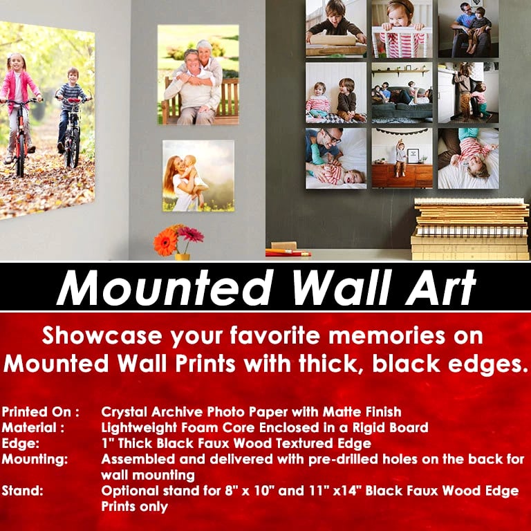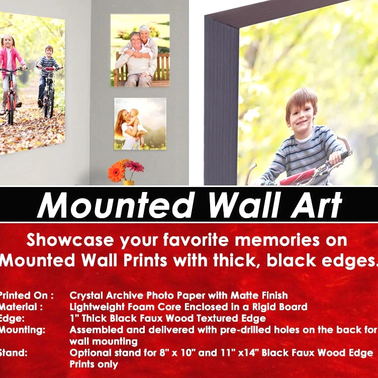 20"x30" Personalized Vertically Mounted Wall Art Prints Printed On: Crystal Archive Photo Paper with Matte Finish Material: Lightweight Foam Core Enclosed in a Rigid Board Edge: 1" Thick Black Faux Wood Textured Edge Mounting: Assembled and delivered with pre-drilled holes on the back for wall mounting Stand: Optional stand for 8" x 10" and 11" x14" Black Faux Wood Edge Prints only Mounted Wall Prints: Display Your Favorite Moments & Memories Whether for your home or office, our premium Mounted Wall Prints will enhance any room with your favorite photographs and memories. Printed on high-quality archival photo paper with matte finish, the prints are then mounted on a durable yet lightweight foam core and enclosed in a rigid board. All of our Mounted Wall Prints have pre-drilled holes on the back and are ready to be hung vertically or horizontally. Moreover, the 8" x 10" and 11" x 14" sizes for the 1" thick Black Faux Wood Textured Edge prints have an optional stand on the back for table displays. Simply install the stand by inserting it into one of the pre-drilled holes on the back and it's ready for display on your desk, shelf or table. (OTHER SIZES AND SETUPS AVAILABLE) After your Purchase, you will be contacted via email. Step 1: E-mail us any artwork, logos, pictures and text you would like printed on your order. Step 2: We will design a layout and send you a proof via email. Step 3: Once the proof is approved, we will Print & Ship your order! Custom Design Available at No Additional Charge! • Send us your photos, logos or info you want to appear on your order. • We will make a custom design at no additional charge. • You approve the proof/layout or request as many changes as you like. • After all changes have been made and you are 100% satisfied, we will Print & Ship your order!
