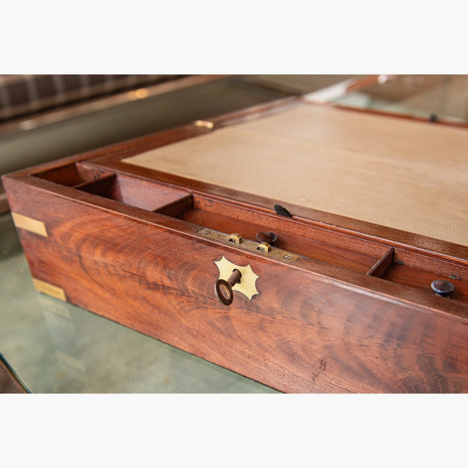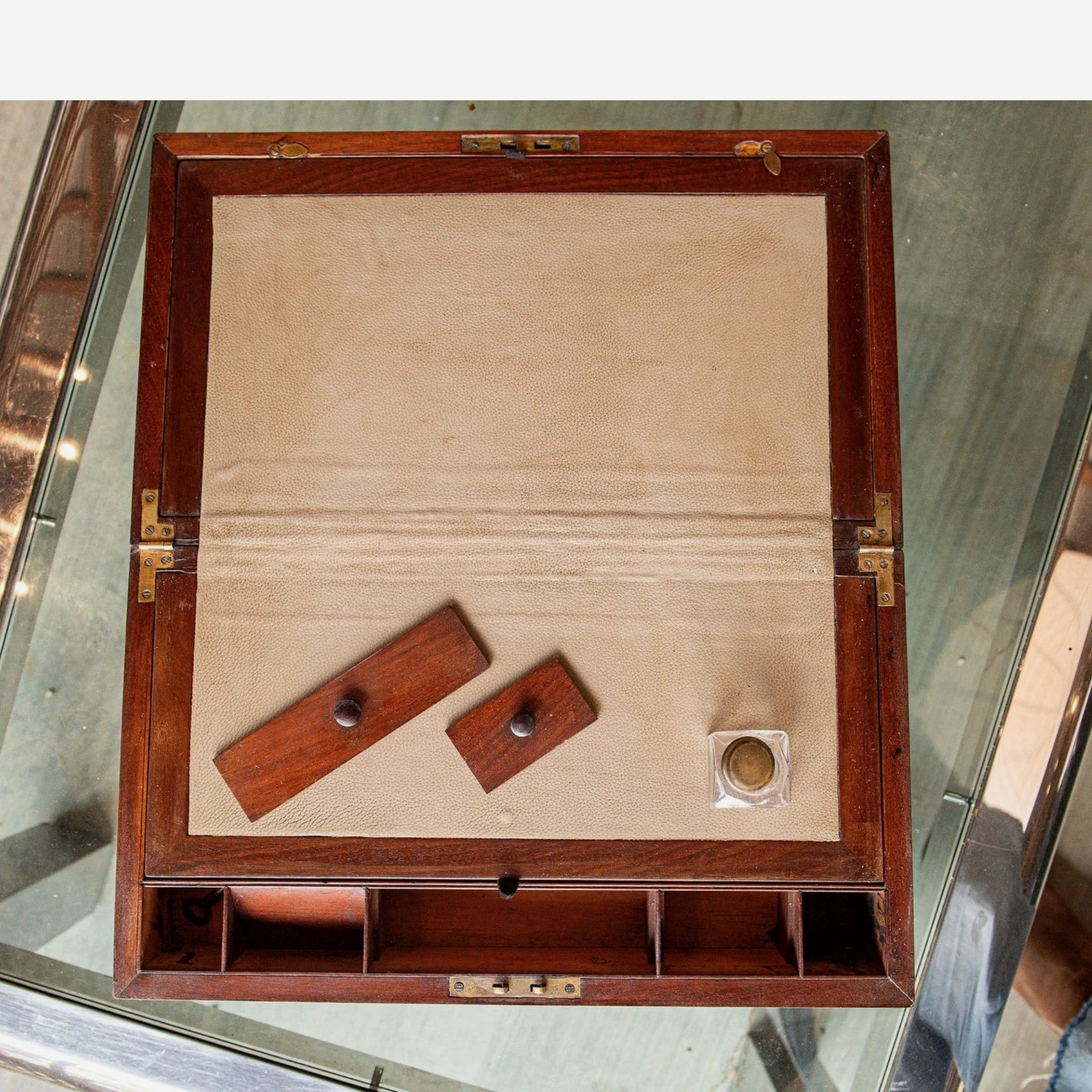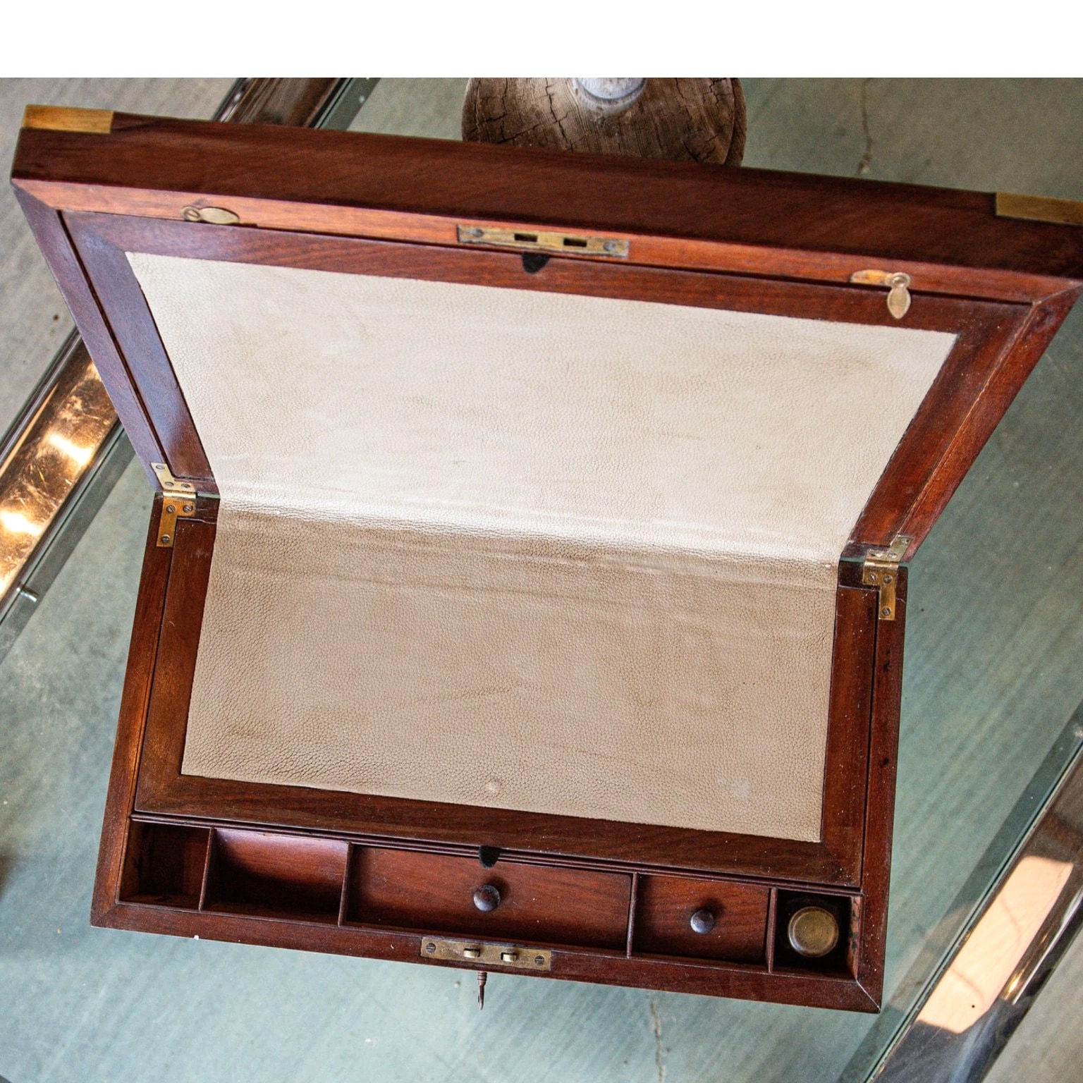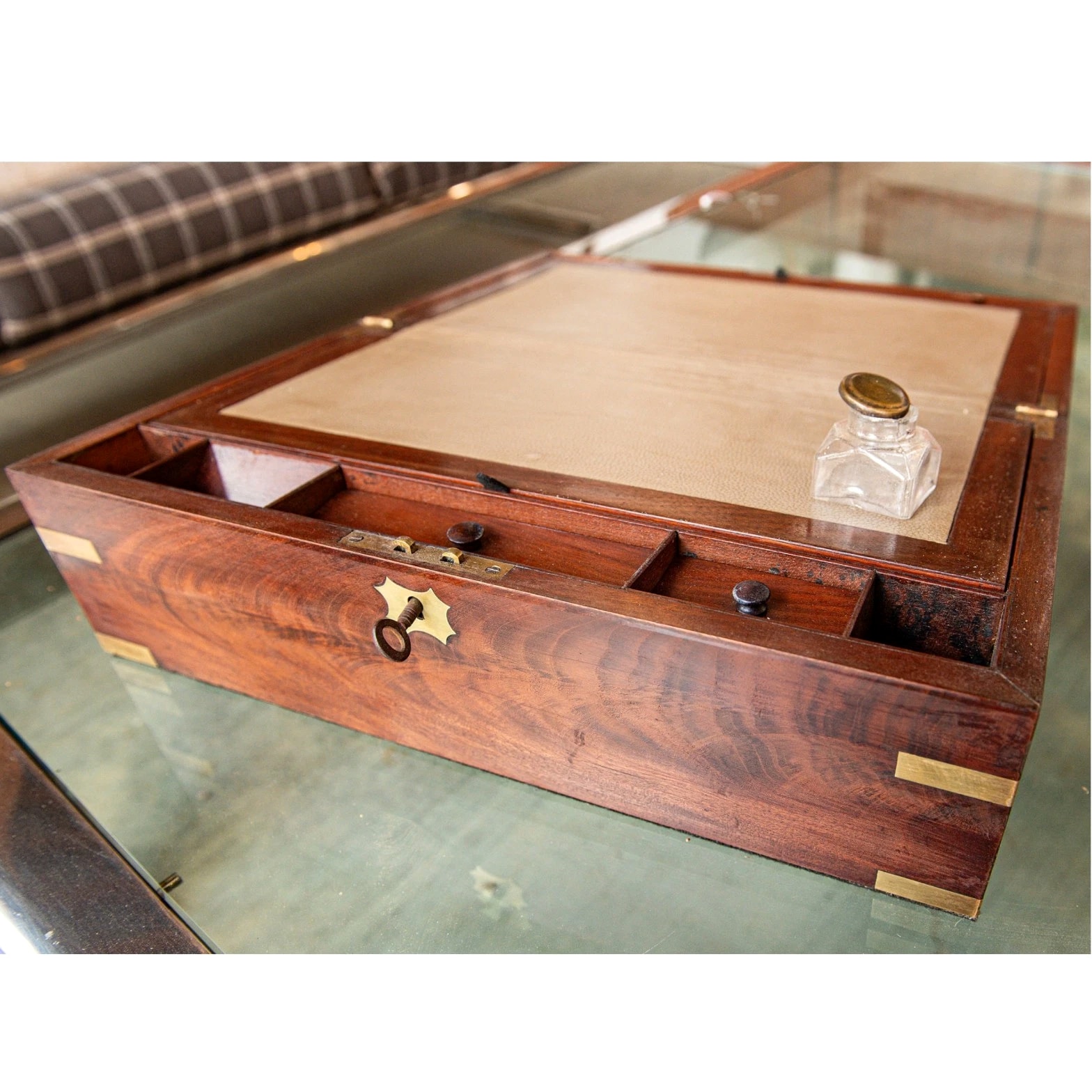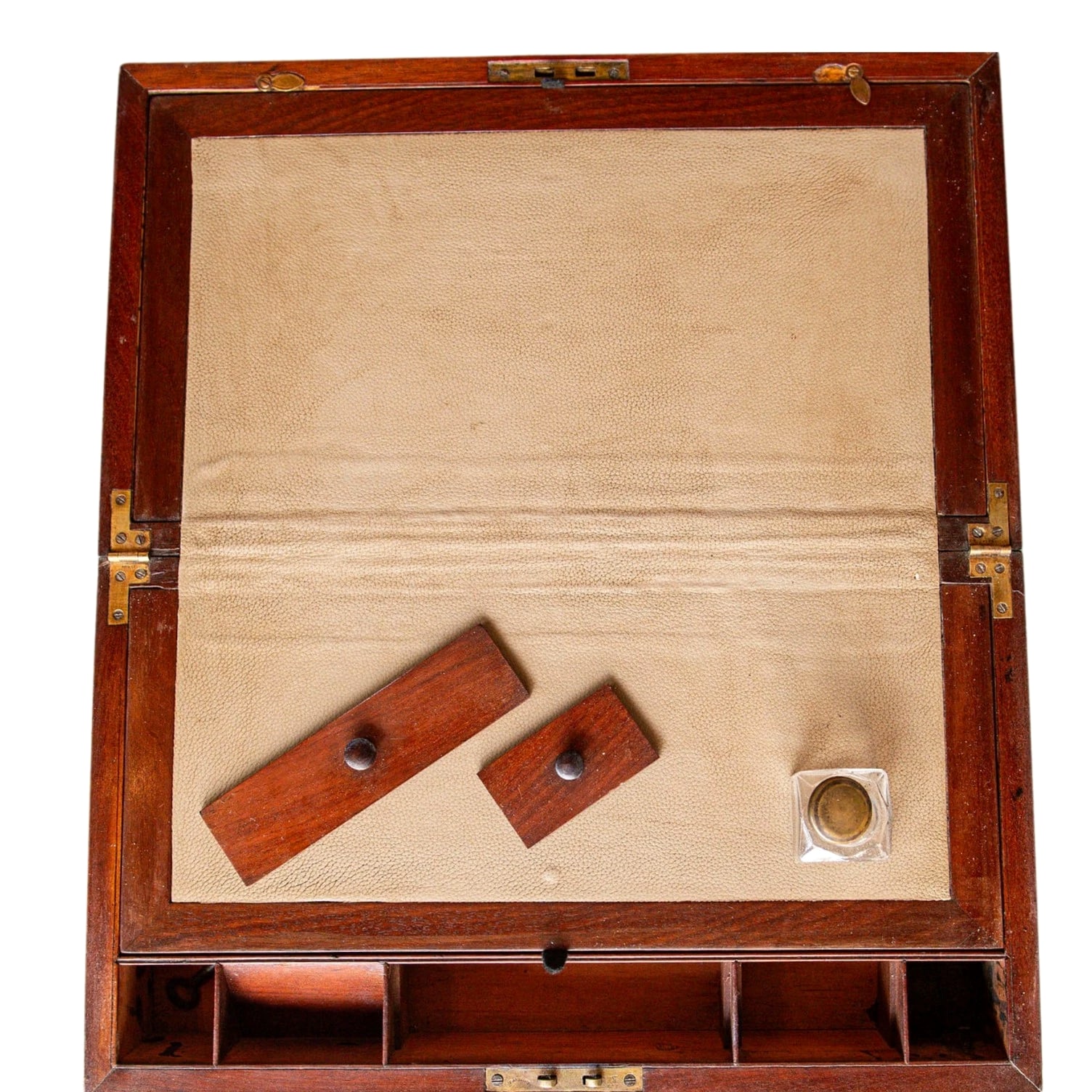 An authentic late 19th century English brass-bound mahogany writing slope, also known as a travel desk, crafted with traditional construction and period detailing. This example reflects the functionality and refined craftsmanship typical of Victorian-era portable writing boxes. The exterior is constructed from richly toned mahogany, reinforced with brass banding at the edges for durability and visual contrast. The rectangular form opens to reveal a paneled writing surface, traditionally used for correspondence during travel. The interior retains its original layout, including compartments for writing implements and ink storage. Beneath the sloped writing panels are concealed storage sections on both sides, designed for organizing documents and personal effects. The interior fittings include pen trays and ink receptacles, with one original glass inkwell still present. The lock plate is stamped with a "VR" monogram beneath a crown, denoting the reign of Queen Victoria (Victoria Regina), while the hinges are marked "PM & Co." for Paul Moore and Company, a known English maker. Key Features: Antique English writing slope / travel desk from the late 19th century Constructed from solid mahogany with brass-bound edges Hinged lid opening to a paneled writing surface Concealed storage compartments beneath both writing panels Interior fitted with pen trays and ink compartments Retains one original glass inkwell Lock plate marked "VR" with crown (Victoria Regina period) Hinges stamped "PM & Co." (Paul Moore and Company) Original hardware and structural components intact Specifications: Origin: England Period: Late 19th Century (Victorian era) Materials: Mahogany wood, brass fittings, glass inkwell Finish: Original finish with visible age and wear Maker's Marks: "PM & Co." on hinges; "VR" with crown on lock plate Interior: Paneled writing surface with storage compartments and fitted sections Dimensions: 6.25 inches (H) x 18 inches (W) x 10.25 inches (D) Condition: Antique