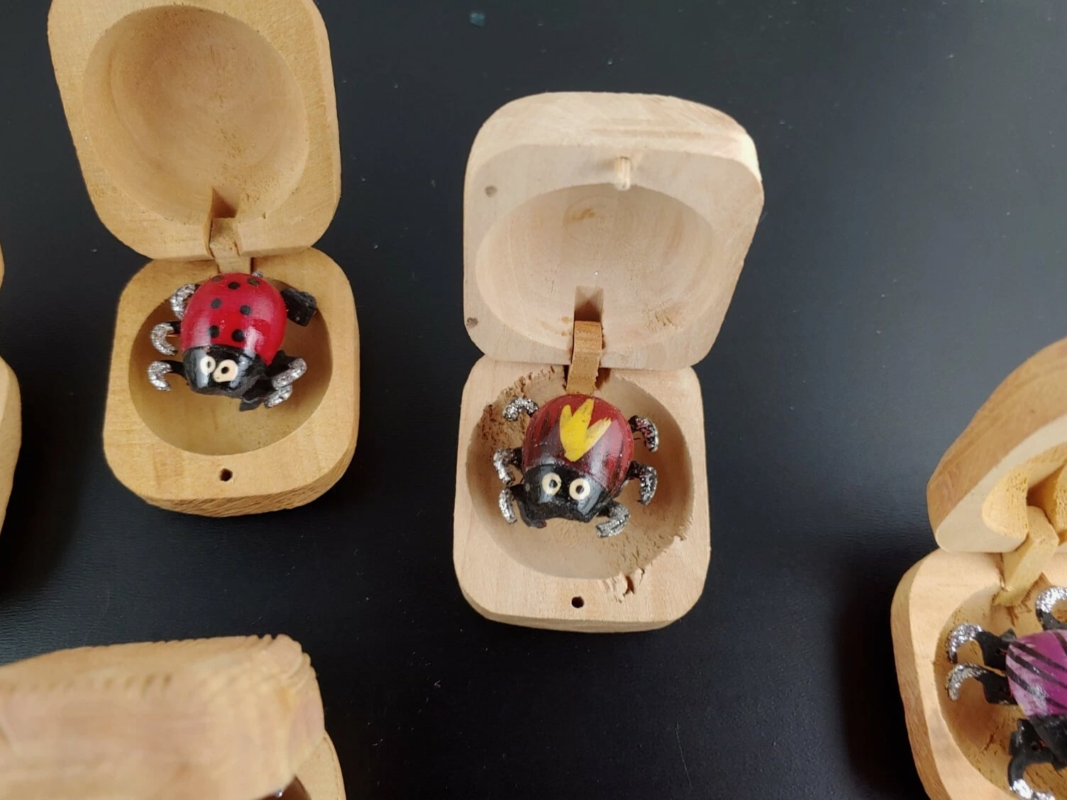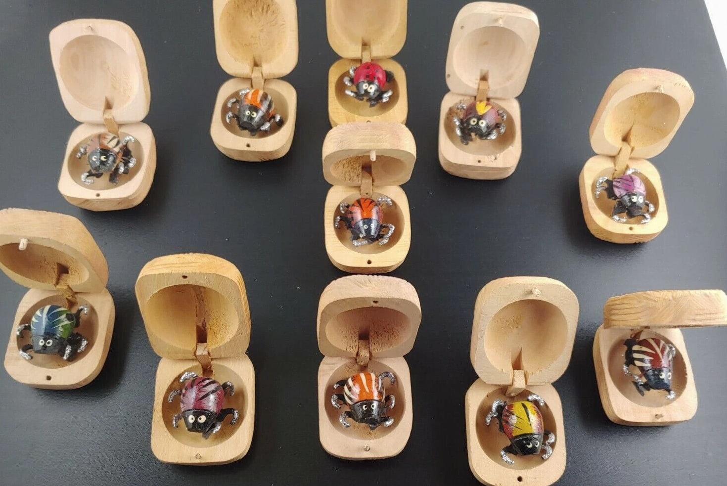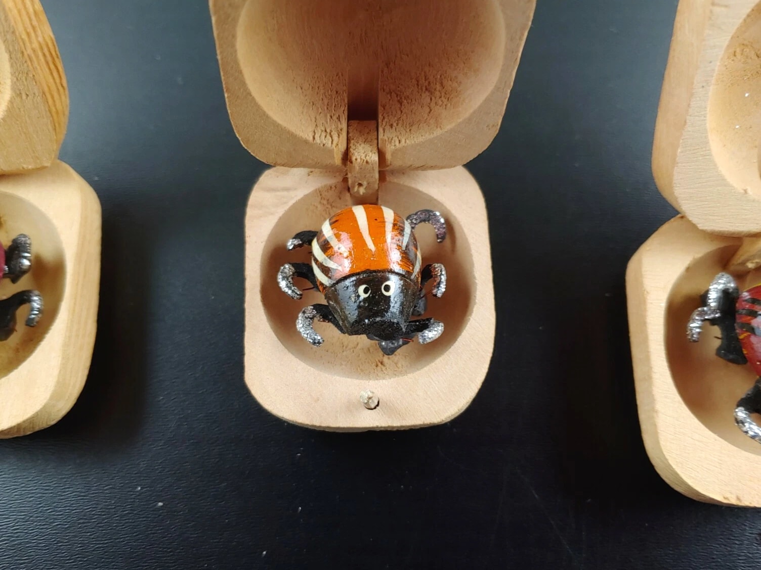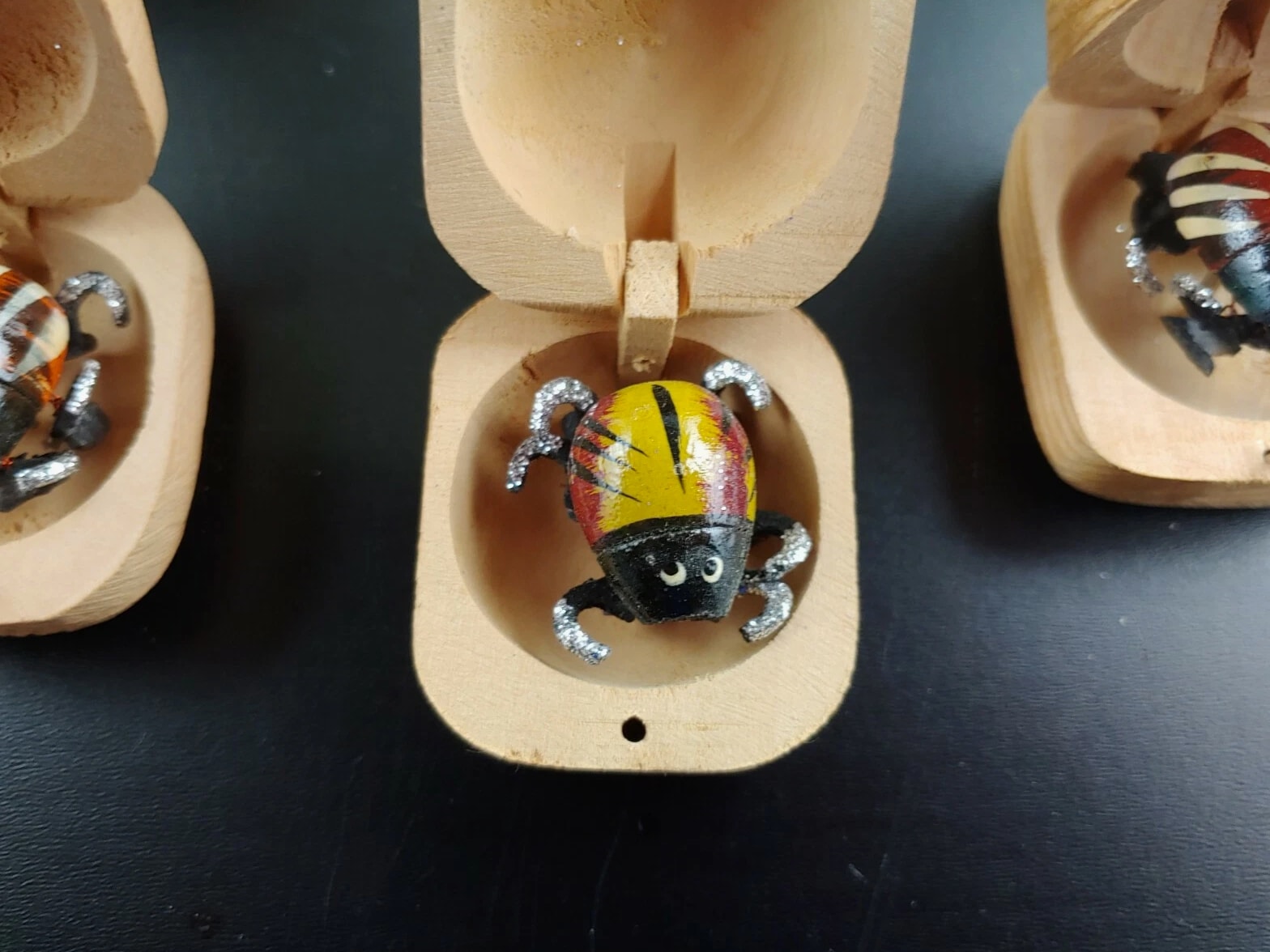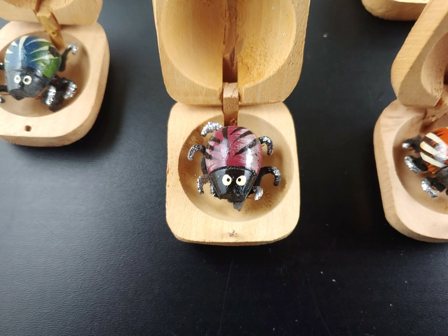 Handmade Bug In A Box Gag Toy Gift - Moving Legs Novelty Bug in a nut Vintage wood Vintage (new) - stored for over 15 years. Each one is different in shape and color! One (1) Bug in a wood nut box In the QUANTITY BOX put your desired amount, will calculate the discount price for you. If you put in 2 you will get 10% off. Put in 3 you will get 15% off. Put in 4 or more you will get a huge 20% off each one. 1= $6.95 each 2= $6.26 each (10% off) 3= $5.91 each (15% off) 4 or more = $5.56 each (20% off) SHIPPING IS ONLY $5 NO MATTER HOW MANY YOU BUY! Legs move when the box is open Wood nut box closes tightly Too cute novelty toy Measures 1 5/8" x 1 3/8" x 1" closed NOT recommended for young children. Leftover stock from shows years ago. NO bug was harmed for this toy - all different colors. Random pick for ONE bug in a nut. If buying more than 2 and want different colors just ask! Get 20% off each one when you buy 4 or more! $5 flat rate shipping no matter how many you buy. WE ALSO HAVE THE SNAKE IN THE BOX - SEE OUR OTHER LISTINGS!