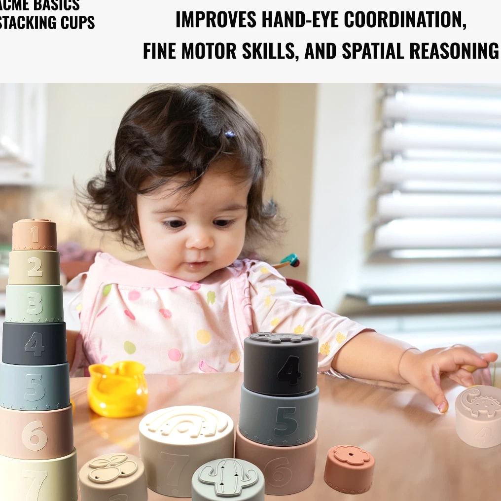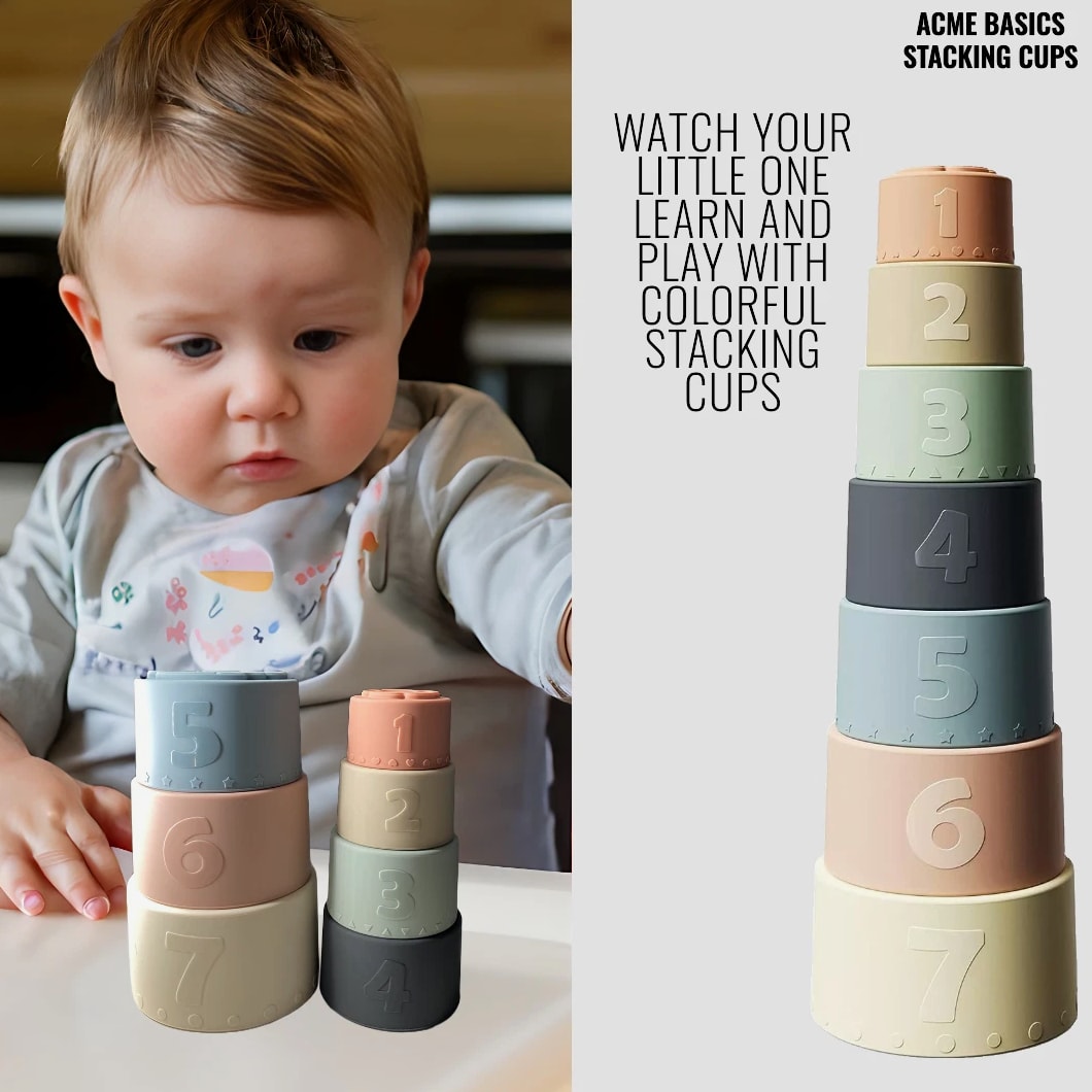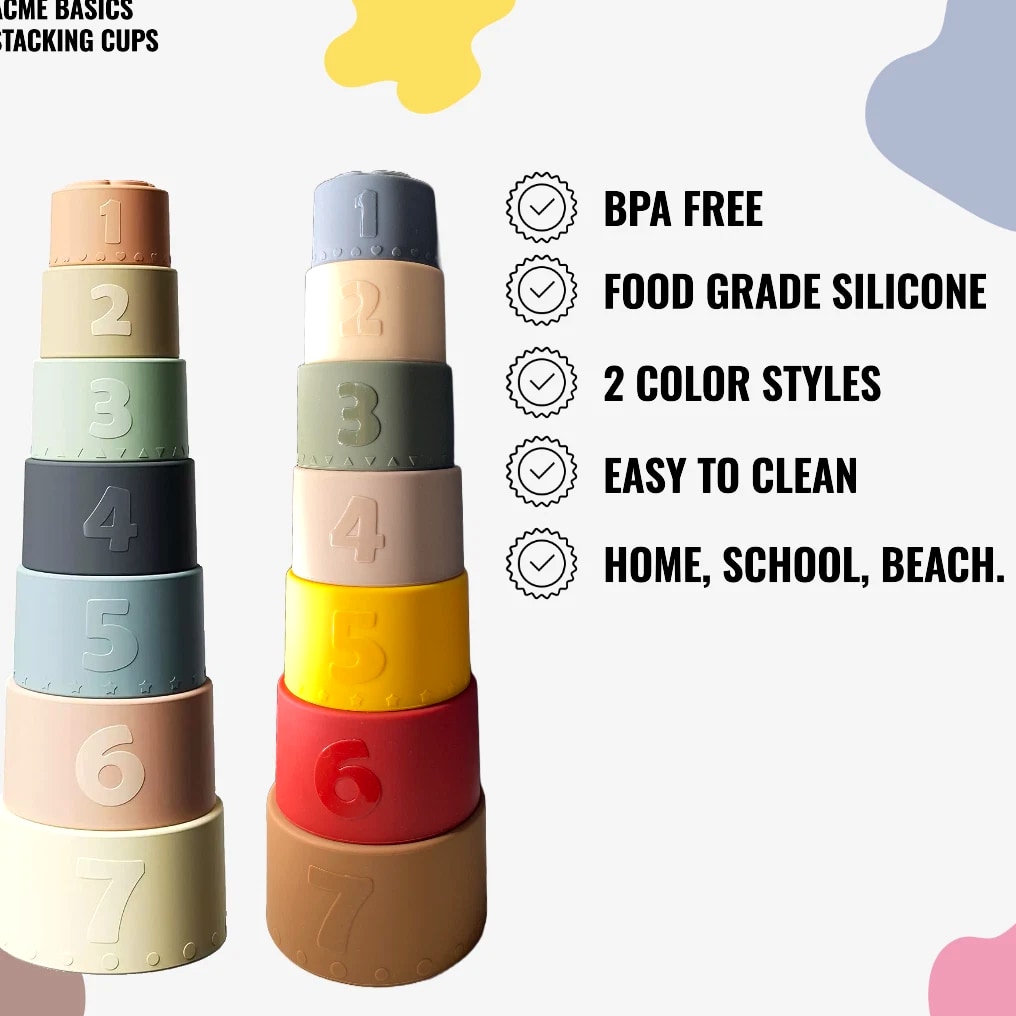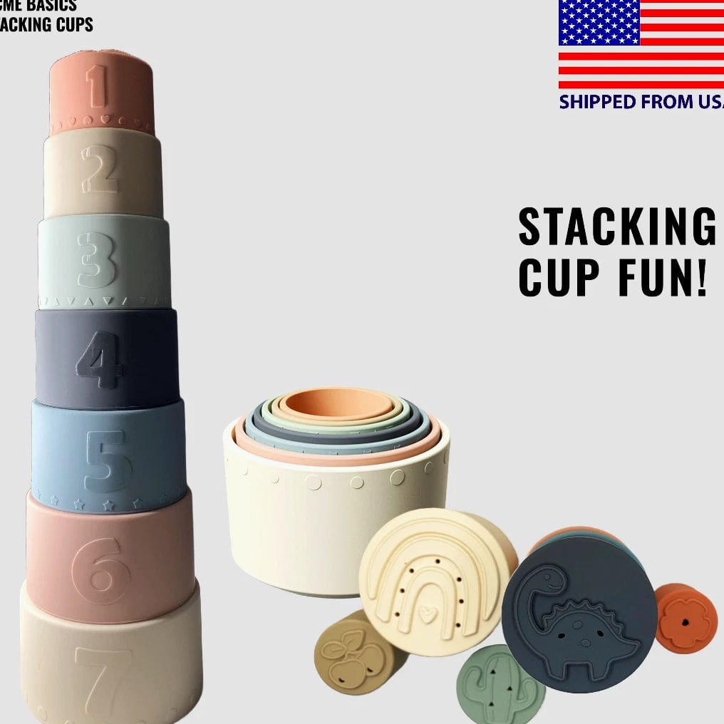 Acme Basics Silicone Stacking Cups Baby Toys for Toddlers & Early Education (7 pcs set) NEW Product Description: Acme Basics Silicone Stacking Cups are the perfect toy for your baby 6+ months! With its Montessori-inspired design, this activity set provides stimulating learning experiences with every interaction. Each piece includes bright colors and patterns to help develop your little one's visual skills. Plus, each of the stacking cups has a different shape that can be used as both teethers and building blocks, helping to boost cognitive development and fine motor skills as they play. Product Features: Early Education: These Montessori toys are designed for use by babies 0-12 months and 2+ year olds, introducing shapes, colors, numbers, and hands-on activities in a safe developmentally appropriate way. In addition to being fun and educational, these silicone stacking cups also help to develop your baby's fine motor skills 100% Safe Material: These BPA-free, non-toxic cups are made of soft, flexible silicone that is safe for babies to chew on. They are also dishwasher safe and easy to clean. Colorful Design: The Acme Basics Silicone Stacking Cups are perfect for baby toys ages 6+ months, featuring bright and colorful designs to engage toddlers. Fun Activity: These silicone stacking cups are a great way to keep your baby entertained and engaged. The cups can be used for a variety of other activities, such as filling with water, sand, or rice. They can also be used as bath toys or as teething rings. What's in the box: 7 Pcs Baby Silicone Stacking Cups Return Policy: 100% MONEY BACK GUARANTEE. We hope you'll love our Stacking Cups. If you're not completely satisfied, or if this product isn't suitable for your needs, just return them within 30 days and we'll issue a full refund