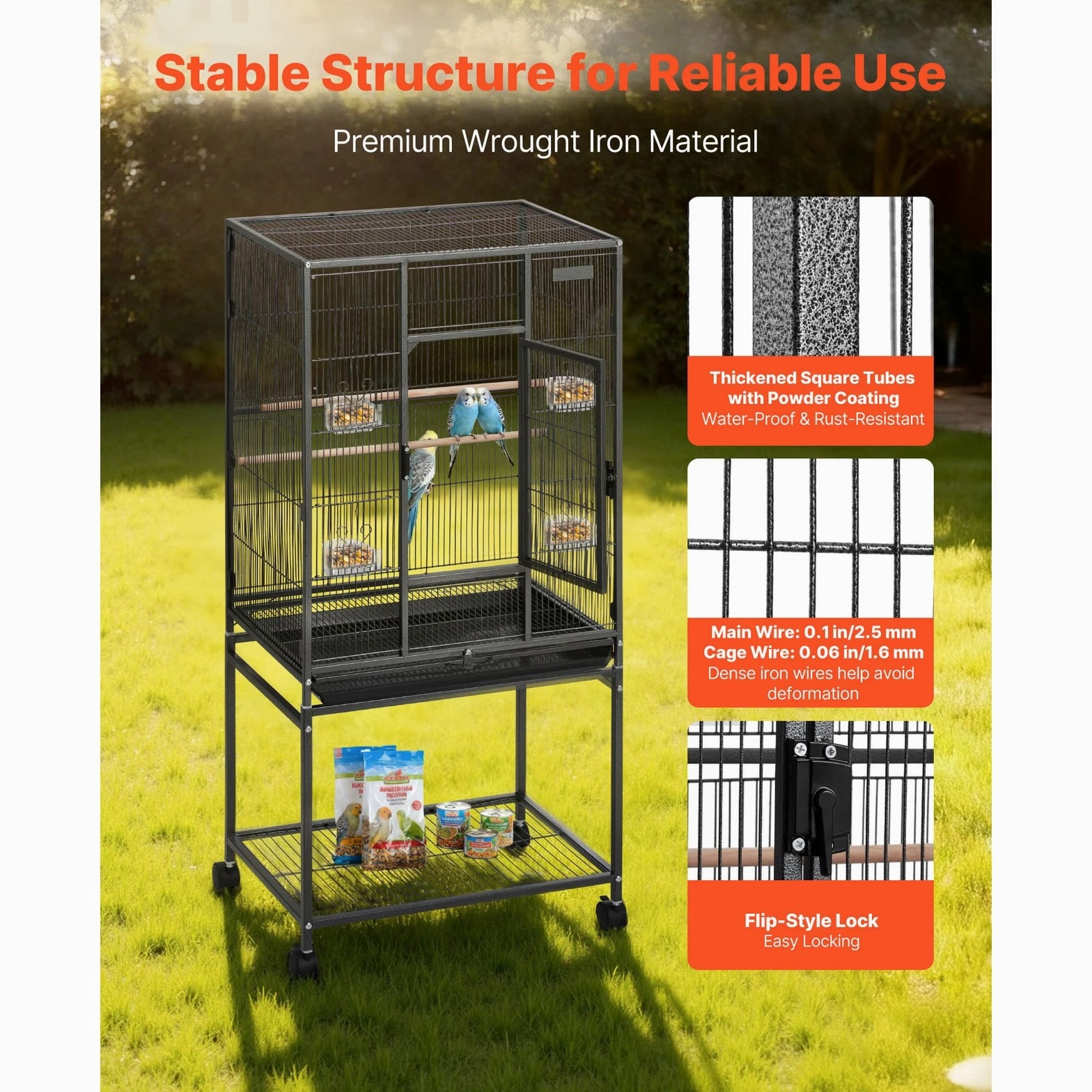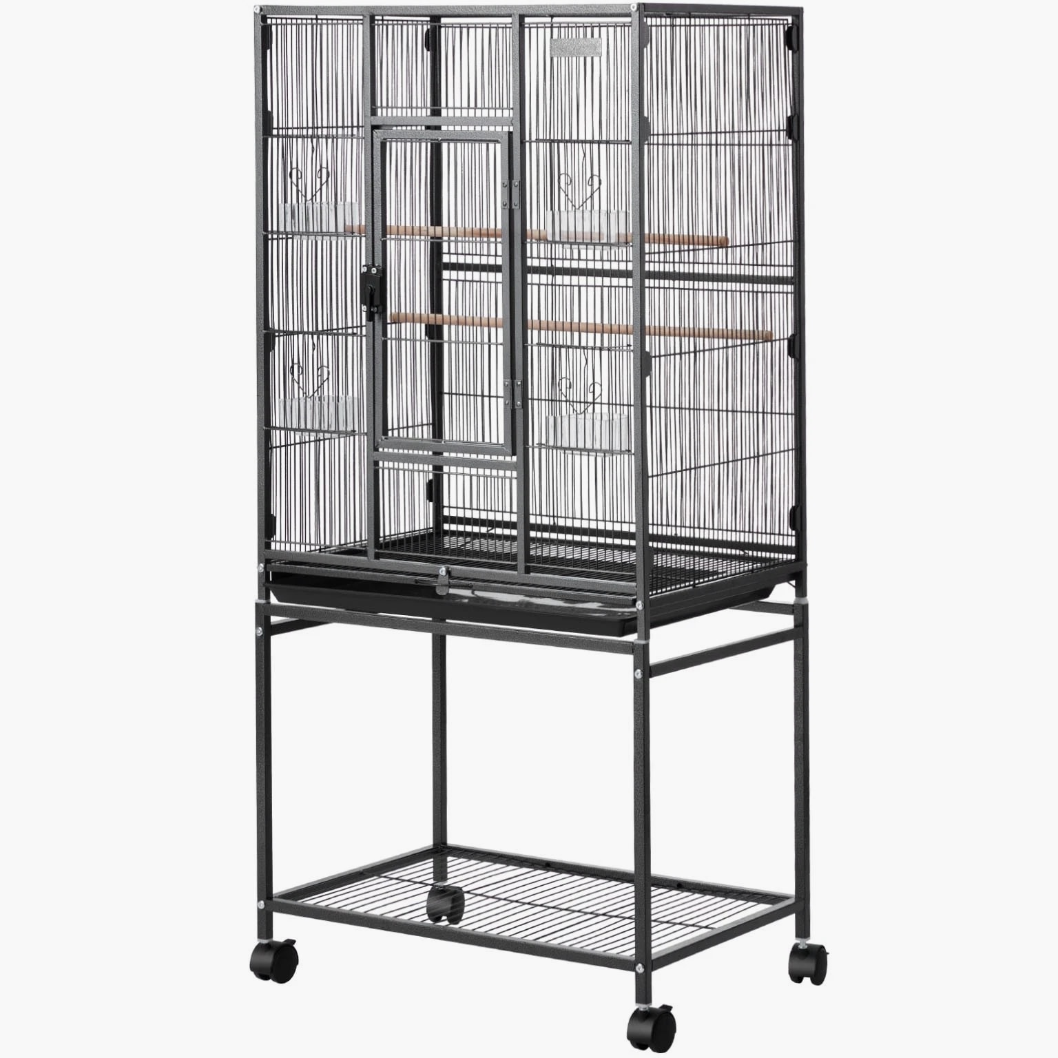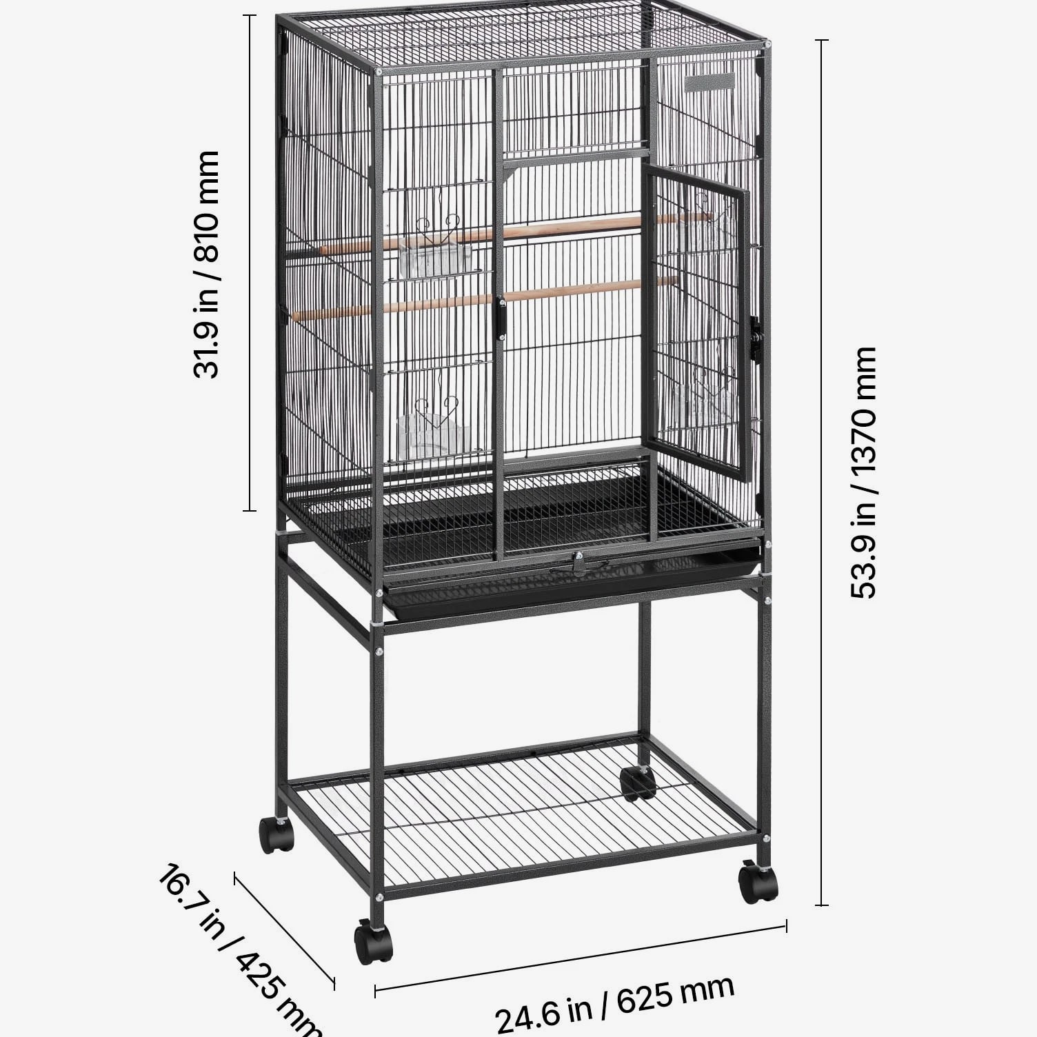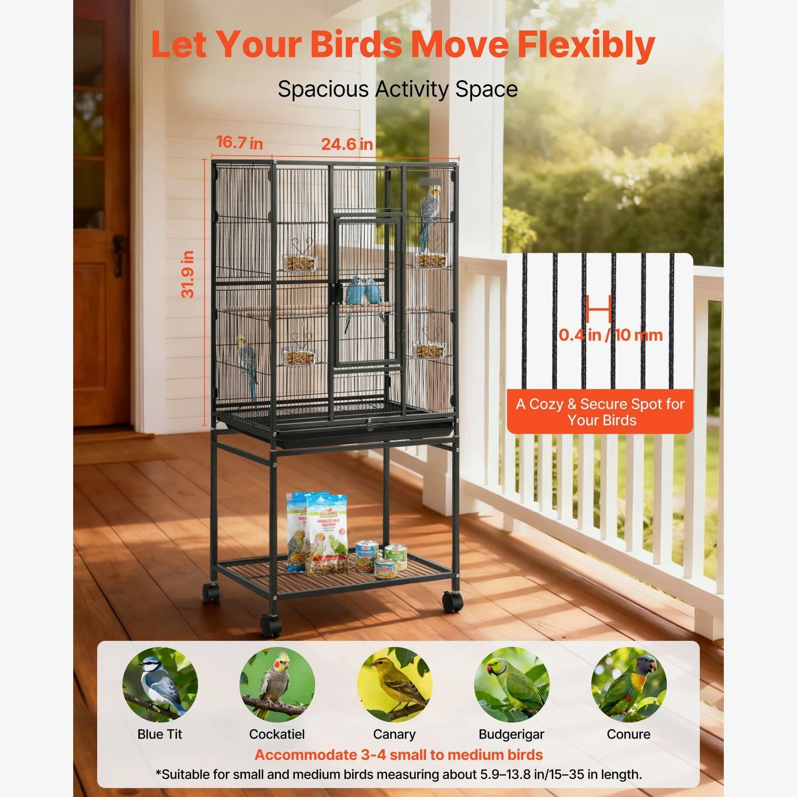 Roomy Aviary for Birds This bird cage features dimensions of 24.6 x 16.7 inches with a bar spacing of 0.4 inches, offering a spacious environment for various bird species such as conures, lovebirds, cockatiels, budgerigars, canaries, and others. SKU4 This bird flight cage is designed with an open-top structure and includes three perches to align with the natural behaviors of birds. The horizontal bars on both sides encourage interaction and play, while plastic feeding trays help protect birds' beaks. The thoughtfully included features provide a cozy and enjoyable environment for your feathered companions. This bird cage is constructed from durable wrought iron and coated with a waterproof and rust-resistant finish. Designed with reinforced square tubes, sturdy cage wiring, and a secure locking door, it provides a safe and dependable living space for your feathered companions. This parrot cage features four durable rolling wheels, allowing for effortless mobility and convenient placement in various locations. It includes a pull-out tray for hassle-free cleaning, while the mesh grate ensures separation between your pet and waste, promoting a tidy and hygienic environment. This spacious bird cage is equipped with all necessary accessories and includes clear assembly instructions. It is designed for quick setup without the need for extra tools, offering a durable and secure habitat for your pets. Features & Details Generous Room: With dimensions of 24.6 x 16.7 x 31.9 inches and bar spacing of 0.4 inches, this bird cage is designed to comfortably house 3–4 small to medium-sized birds, including conures, lovebirds, budgies, and canaries. It offers plenty of space for them to move around and spread their wings with ease. Durable and Secure: Constructed from sturdy wrought iron with a protective powder-coated surface, this bird aviary offers excellent resistance to rust and water. The robust frame, reinforced tubes, and bars are designed to prevent bending, while the