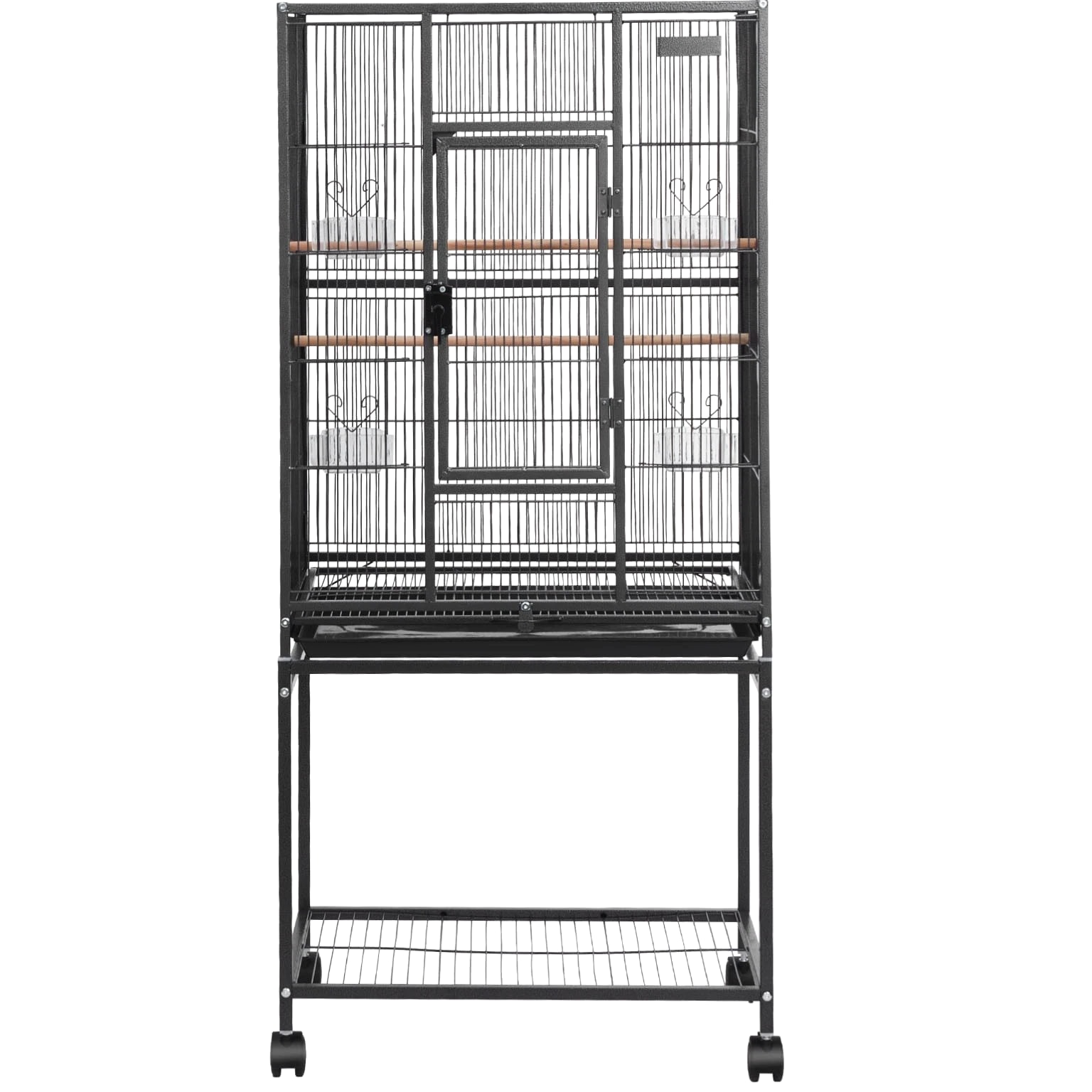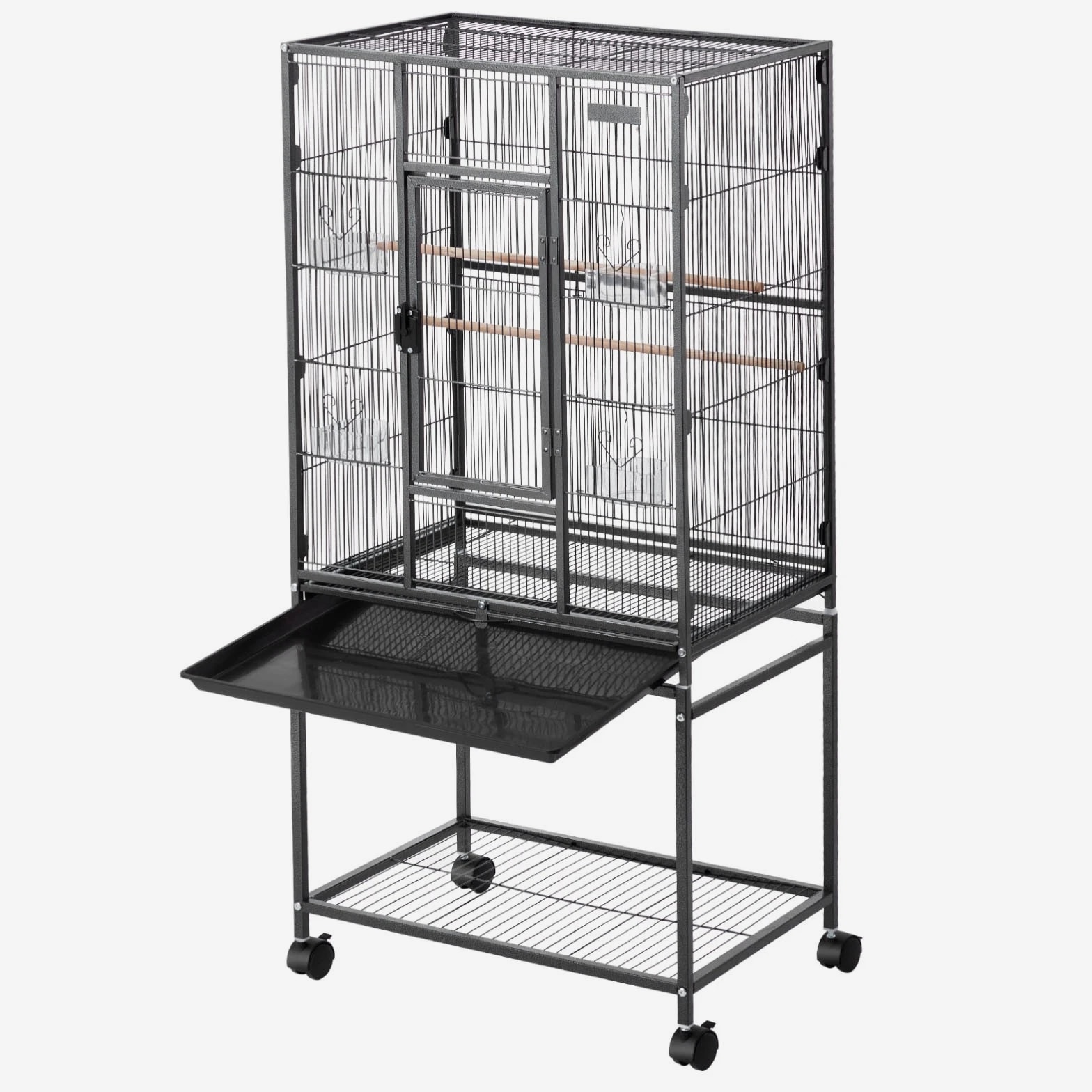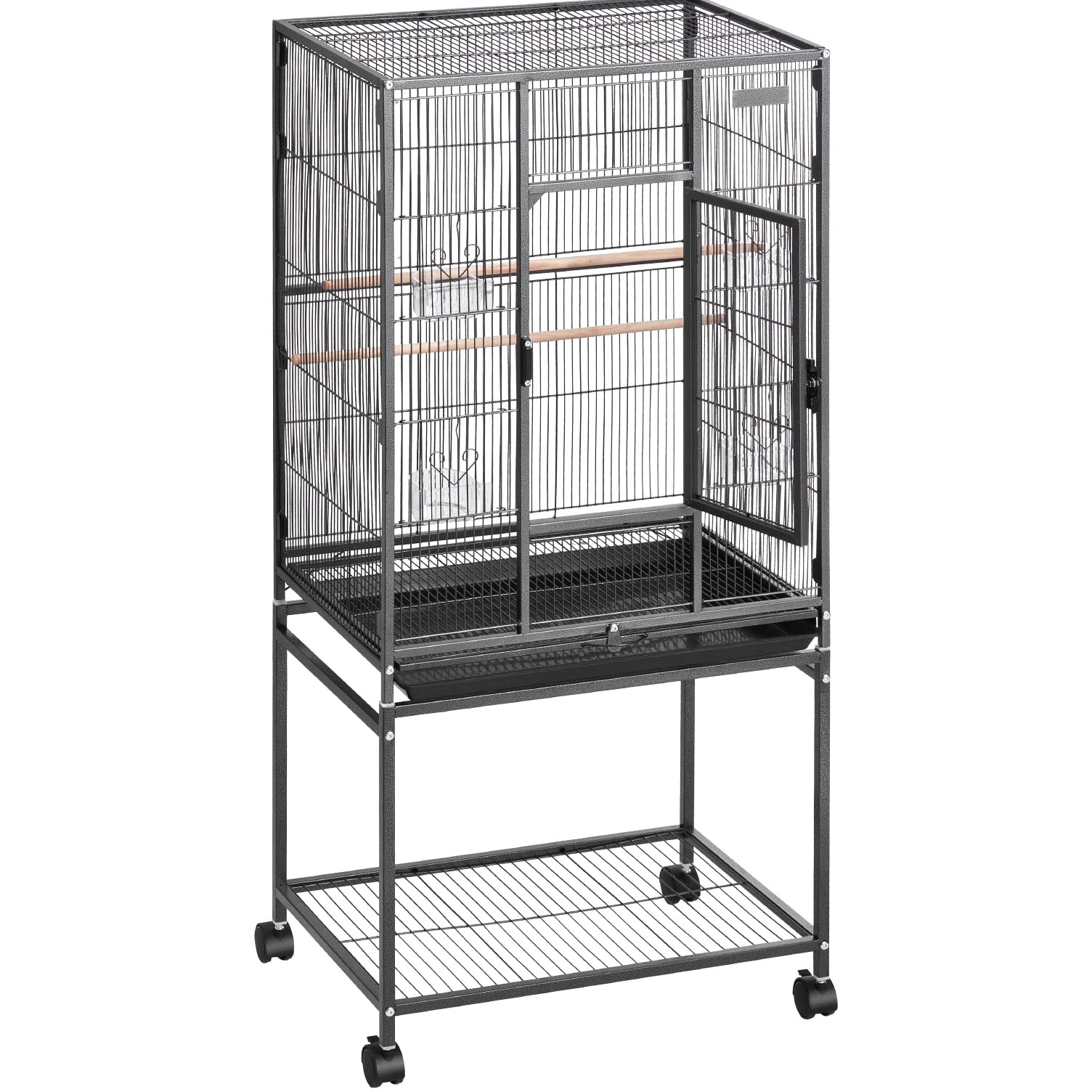 Roomy Aviary for Birds This bird cage features dimensions of 24.6 x 16.7 inches with a bar spacing of 0.4 inches, offering a spacious environment for various bird species such as conures, lovebirds, cockatiels, budgerigars, canaries, and others. SKU4 This bird flight cage is designed with an open-top structure and includes three perches to align with the natural behaviors of birds. The horizontal bars on both sides encourage interaction and play, while plastic feeding trays help protect birds' beaks. The thoughtfully included features provide a cozy and enjoyable environment for your feathered companions. This bird cage is constructed from durable wrought iron and coated with a waterproof and rust-resistant finish. Designed with reinforced square tubes, sturdy cage wiring, and a secure locking door, it provides a safe and dependable living space for your feathered companions. This parrot cage features four durable rolling wheels, allowing for effortless mobility and convenient placement in various locations. It includes a pull-out tray for hassle-free cleaning, while the mesh grate ensures separation between your pet and waste, promoting a tidy and hygienic environment. This spacious bird cage is equipped with all necessary accessories and includes clear assembly instructions. It is designed for quick setup without the need for extra tools, offering a durable and secure habitat for your pets. Features & Details Generous Room: With dimensions of 24.6 x 16.7 x 31.9 inches and bar spacing of 0.4 inches, this bird cage is designed to comfortably house 3–4 small to medium-sized birds, including conures, lovebirds, budgies, and canaries. It offers plenty of space for them to move around and spread their wings with ease. Durable and Secure: Constructed from sturdy wrought iron with a protective powder-coated surface, this bird aviary offers excellent resistance to rust and water. The robust frame, reinforced tubes, and bars are designed to prevent bending, while the