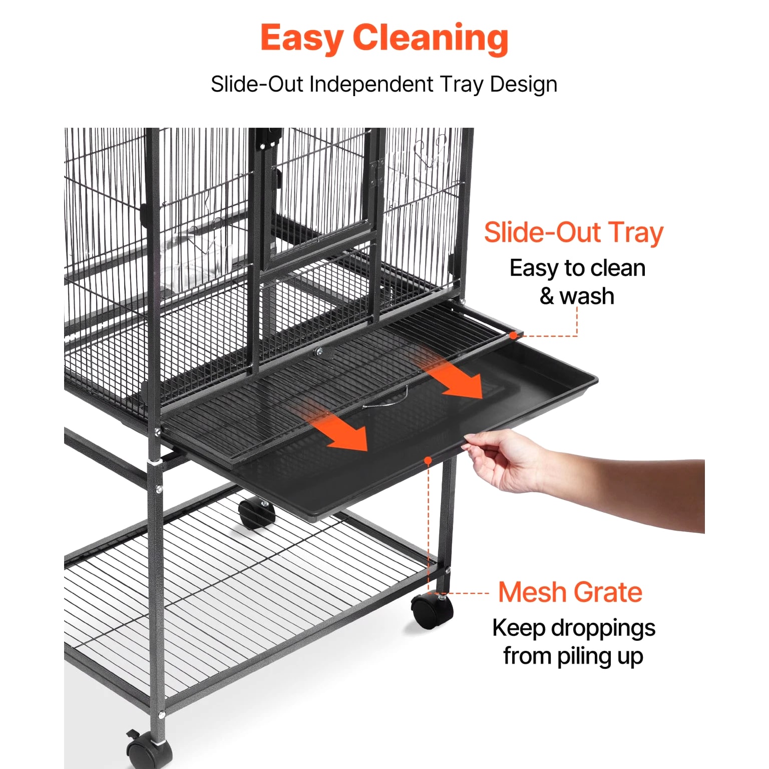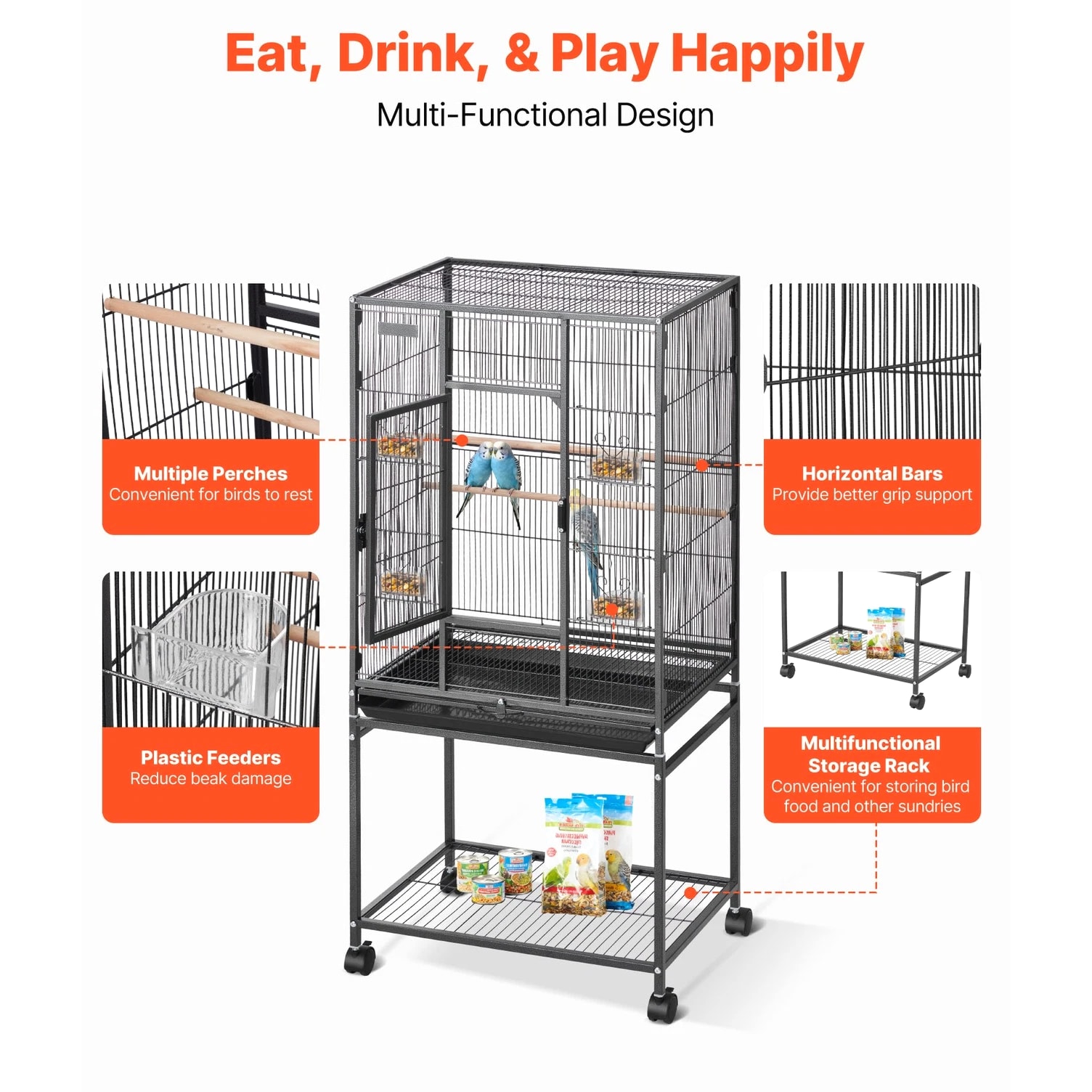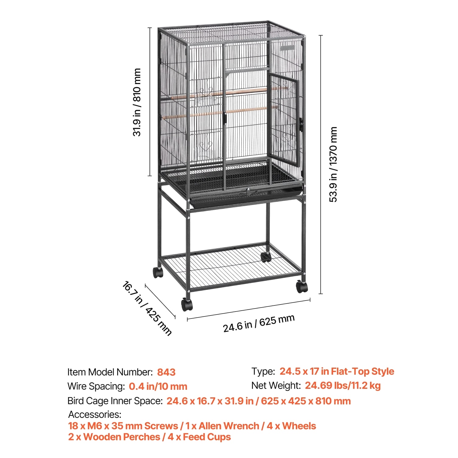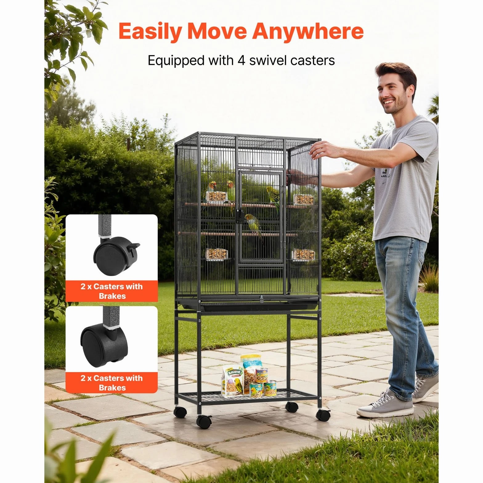 Roomy Aviary for Birds This bird cage features dimensions of 24.6 x 16.7 inches with a bar spacing of 0.4 inches, offering a spacious environment for various bird species such as conures, lovebirds, cockatiels, budgerigars, canaries, and others. SKU4 This bird flight cage is designed with an open-top structure and includes three perches to align with the natural behaviors of birds. The horizontal bars on both sides encourage interaction and play, while plastic feeding trays help protect birds' beaks. The thoughtfully included features provide a cozy and enjoyable environment for your feathered companions. This bird cage is constructed from durable wrought iron and coated with a waterproof and rust-resistant finish. Designed with reinforced square tubes, sturdy cage wiring, and a secure locking door, it provides a safe and dependable living space for your feathered companions. This parrot cage features four durable rolling wheels, allowing for effortless mobility and convenient placement in various locations. It includes a pull-out tray for hassle-free cleaning, while the mesh grate ensures separation between your pet and waste, promoting a tidy and hygienic environment. This spacious bird cage is equipped with all necessary accessories and includes clear assembly instructions. It is designed for quick setup without the need for extra tools, offering a durable and secure habitat for your pets. Features & Details Generous Room: With dimensions of 24.6 x 16.7 x 31.9 inches and bar spacing of 0.4 inches, this bird cage is designed to comfortably house 3–4 small to medium-sized birds, including conures, lovebirds, budgies, and canaries. It offers plenty of space for them to move around and spread their wings with ease. Durable and Secure: Constructed from sturdy wrought iron with a protective powder-coated surface, this bird aviary offers excellent resistance to rust and water. The robust frame, reinforced tubes, and bars are designed to prevent bending, while the