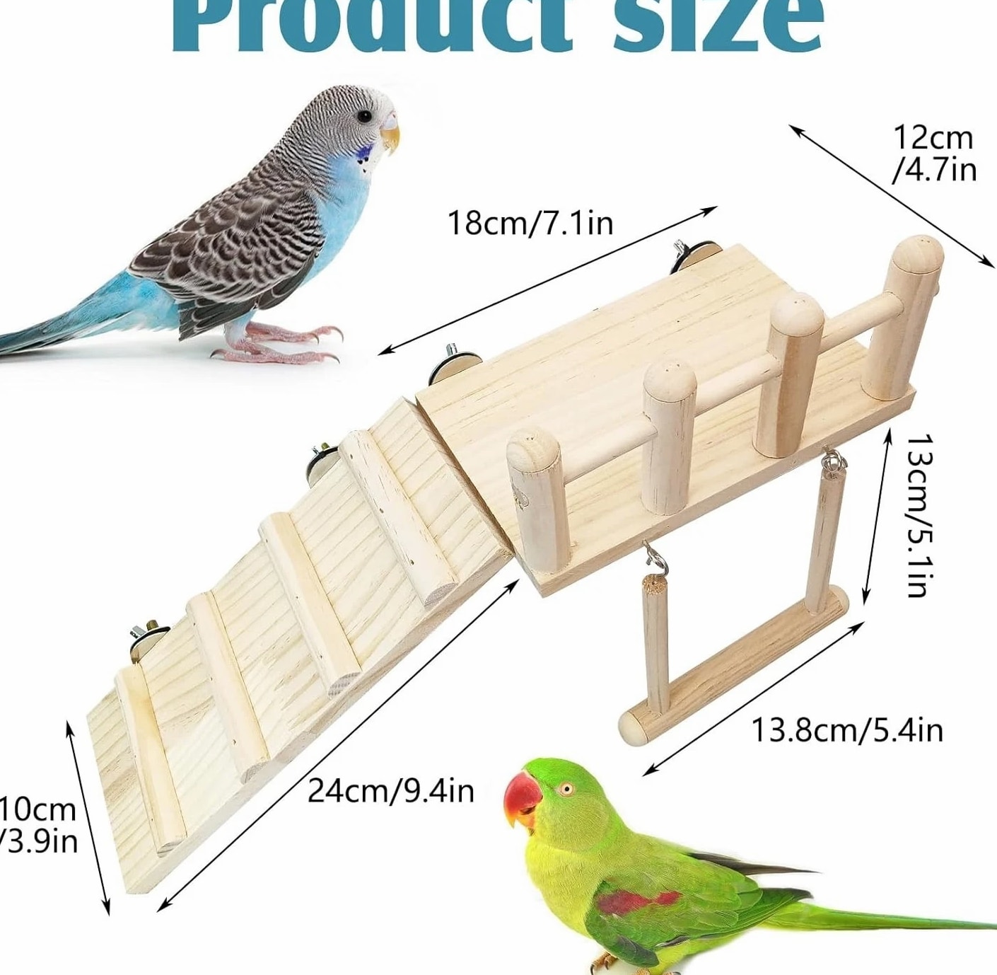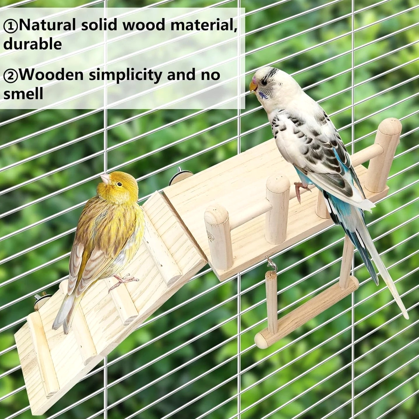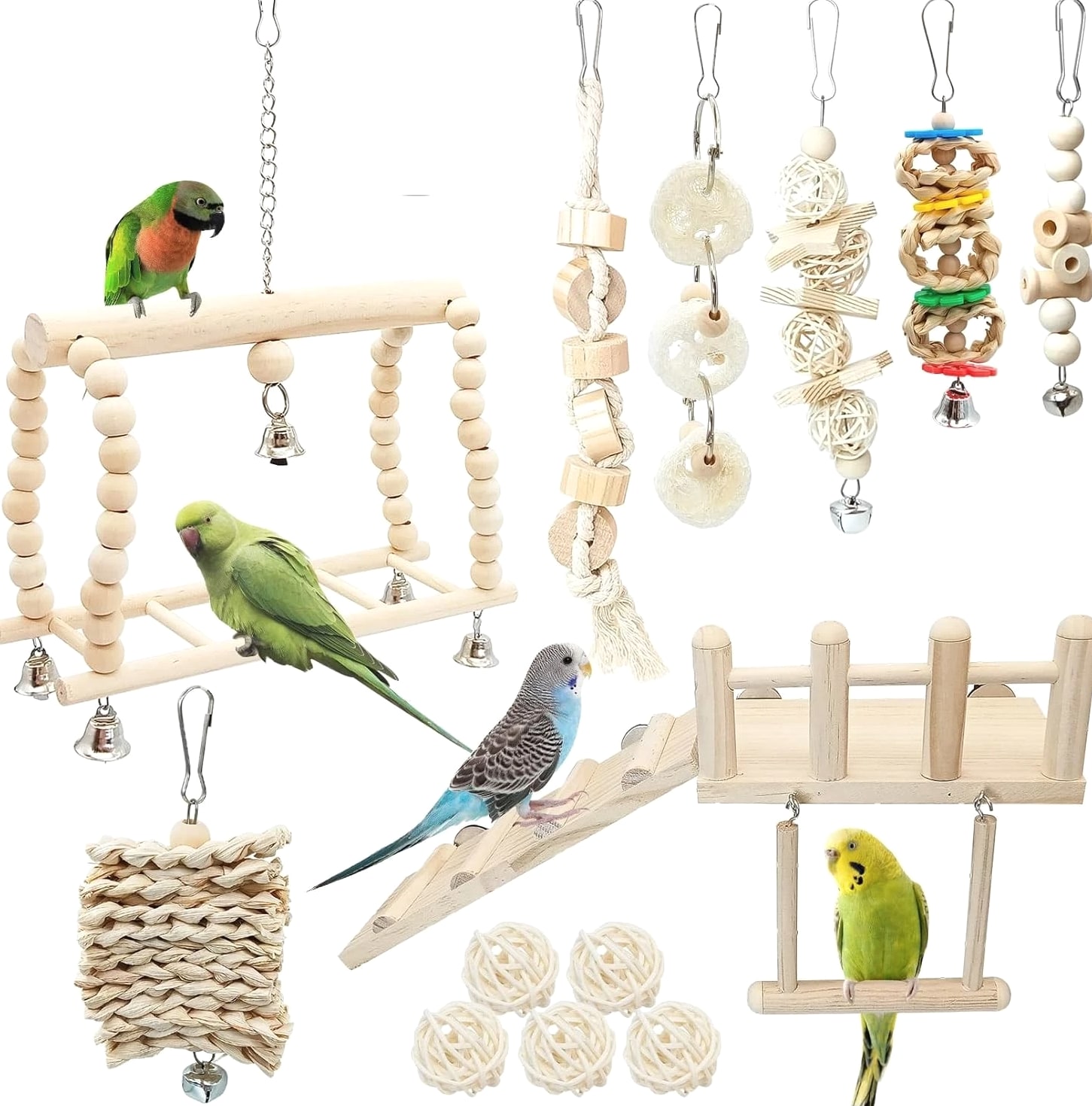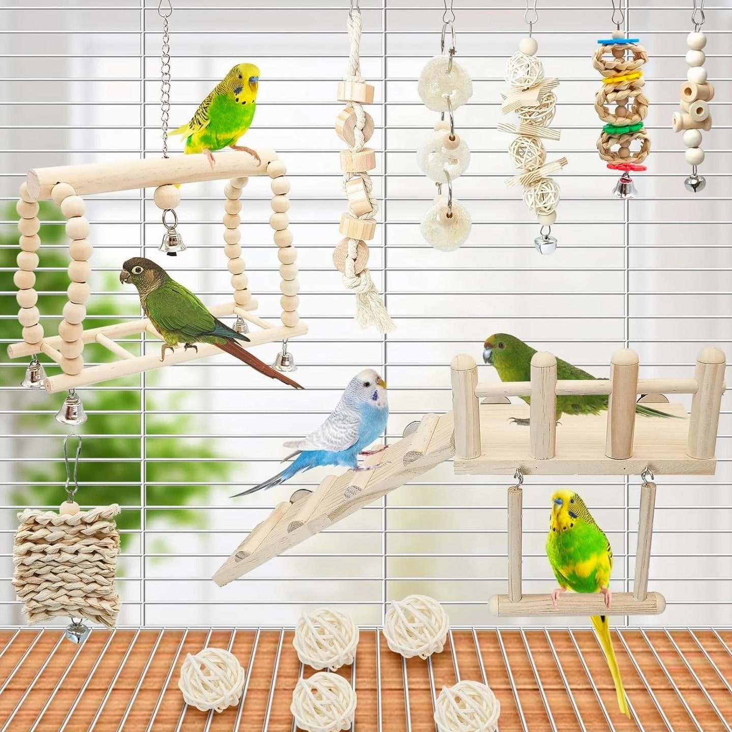 13 Pcs Hanging Bird Toys Set Enhance your pet's playtime with this vibrant and engaging bird toy set, specially designed for parakeets and a variety of small birds. What's Included: 6 Parrot Chew Toys for endless enjoyment and stimulation 1 Durable Wooden Perch Platform for secure resting 1 Swing to promote exercise and fun 5 Colorful Rattan Balls for climbing and pecking Product Features: Natural Wood Perch: Crafted from natural wood, the perch platform is securely assembled with nuts and screws, ensuring stability and safety for your feathered friend. Safe Chewing Materials: The toys are free from harmful colors, allowing birds to chew and play without worry. Durable Design: Each swing and perch is made from sturdy natural wood, creating a safe, engaging environment for climbing and exploration. Space-Saving Installation: Detachable hooks allow for easy installation in any bird cage while ensuring a tidy and fun-designed space for your pet. Versatile for All Birds: Perfectly suited for parakeets, finches, conures, lovebirds, budgies, and canaries, this set provides a stimulating experience for a variety of avian friends. Why Choose Our 13 Pcs Bird Toy Set? Your pet deserves the best! This thoughtfully curated toy set allows your bird to indulge in natural behaviors, from chewing to climbing, while exploring their surroundings safely. With each component made from non-toxic materials, you can have peace of mind knowing your pet is playing happily and healthily. Transform your bird's environment into a haven of joy and activity. Elevate your bird's lifestyle with our 13 Pcs Hanging Bird Toys Set — the perfect combination of style, functionality, and safety!