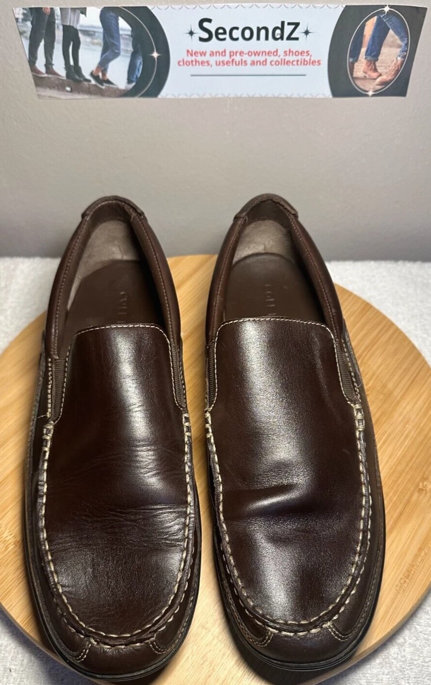 Cole Haan CO4059 Tucker Venetian Dark Leather Slip-On Loafers, Men's Size 9.5M. Gently worn and well cared for with minimal signs of wear; feel and smell nearly new. Check out my other items! All shoes are cleaned and disinfected. Some may have staining, scuffs or blemishes. Some may have stubborn pet hair that was difficult to remove. I sell new, like new, and gently used shoes, clothing, and useful items. Once you receive your item and are happy with your purchase, please leave positive feedback. I will do the same. If you need to return an item, it must be in the condition and packaging you received it in. Lighting conditions may affect the actual color of the item.
