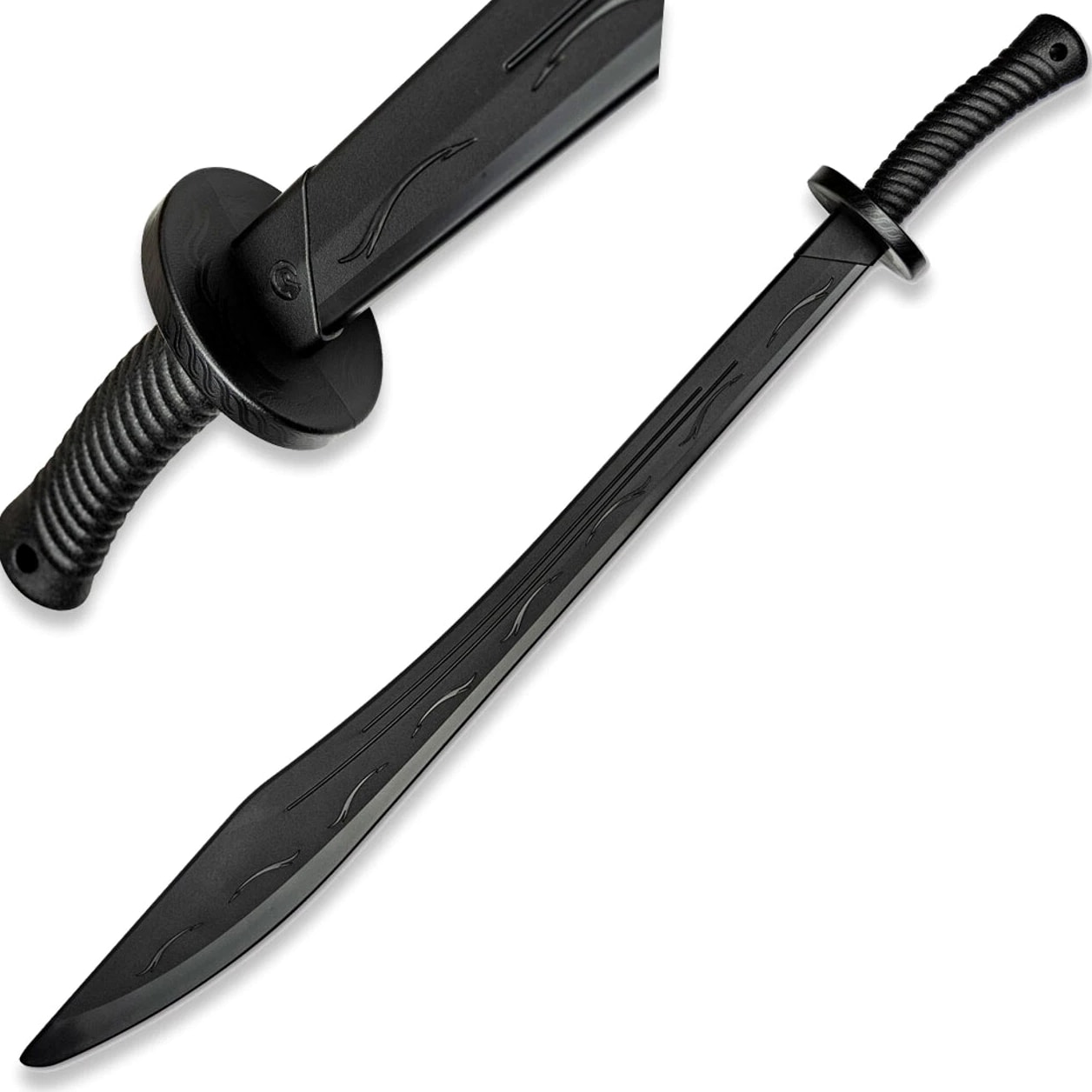 Polymer Training Sword Specifications: OVERALL LENGTH: 38 inches HIGH QUALITY BLACK POLYPROPYLENE BLADE WITH POINTED TIP PERFECT WEIGHT AND BALANCE FOR MARTIAL ART TRAINING SPIRAL CURVE HANDLE POLYPROPYLENE GUARD MADE IN TAIWAN