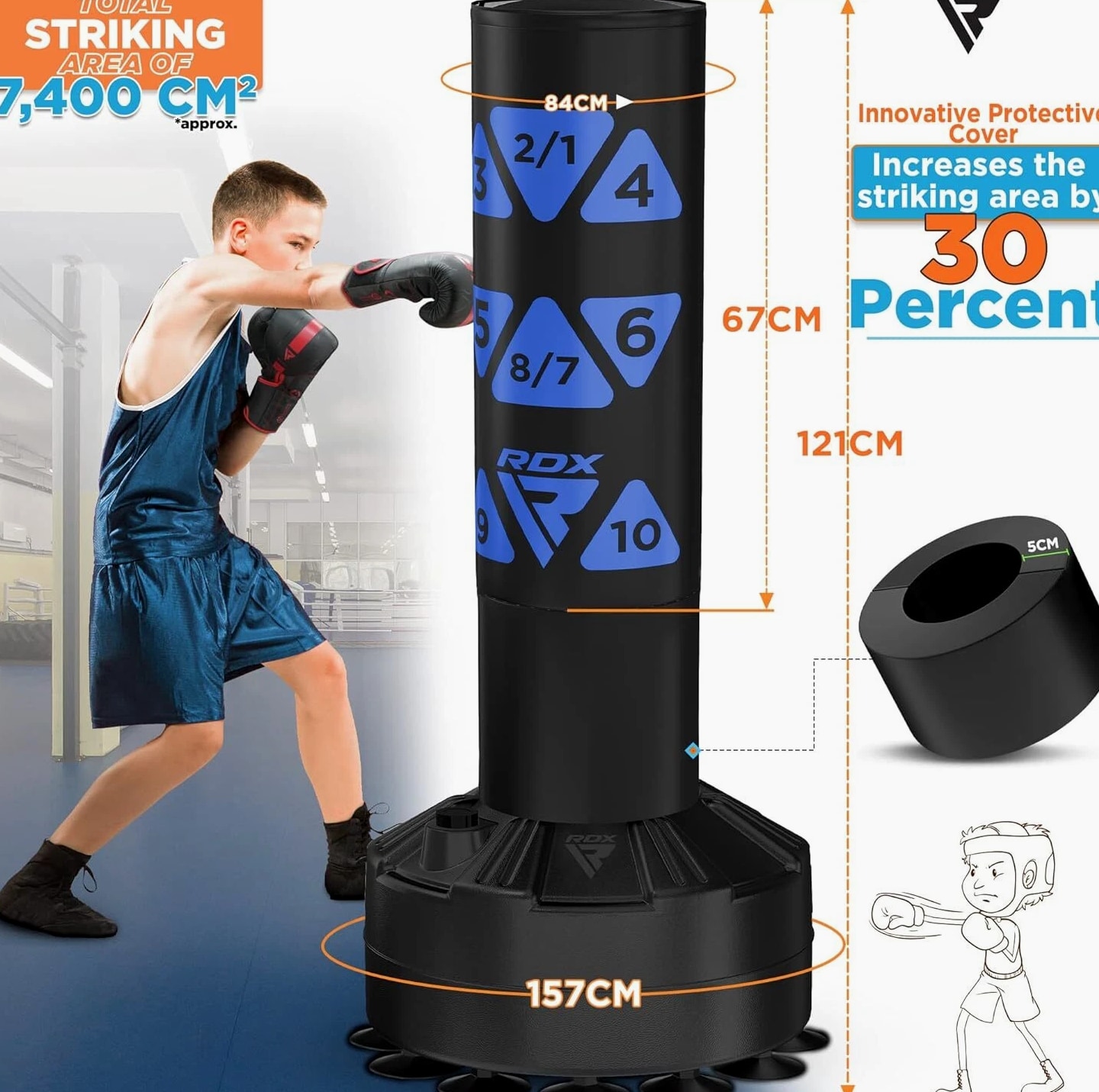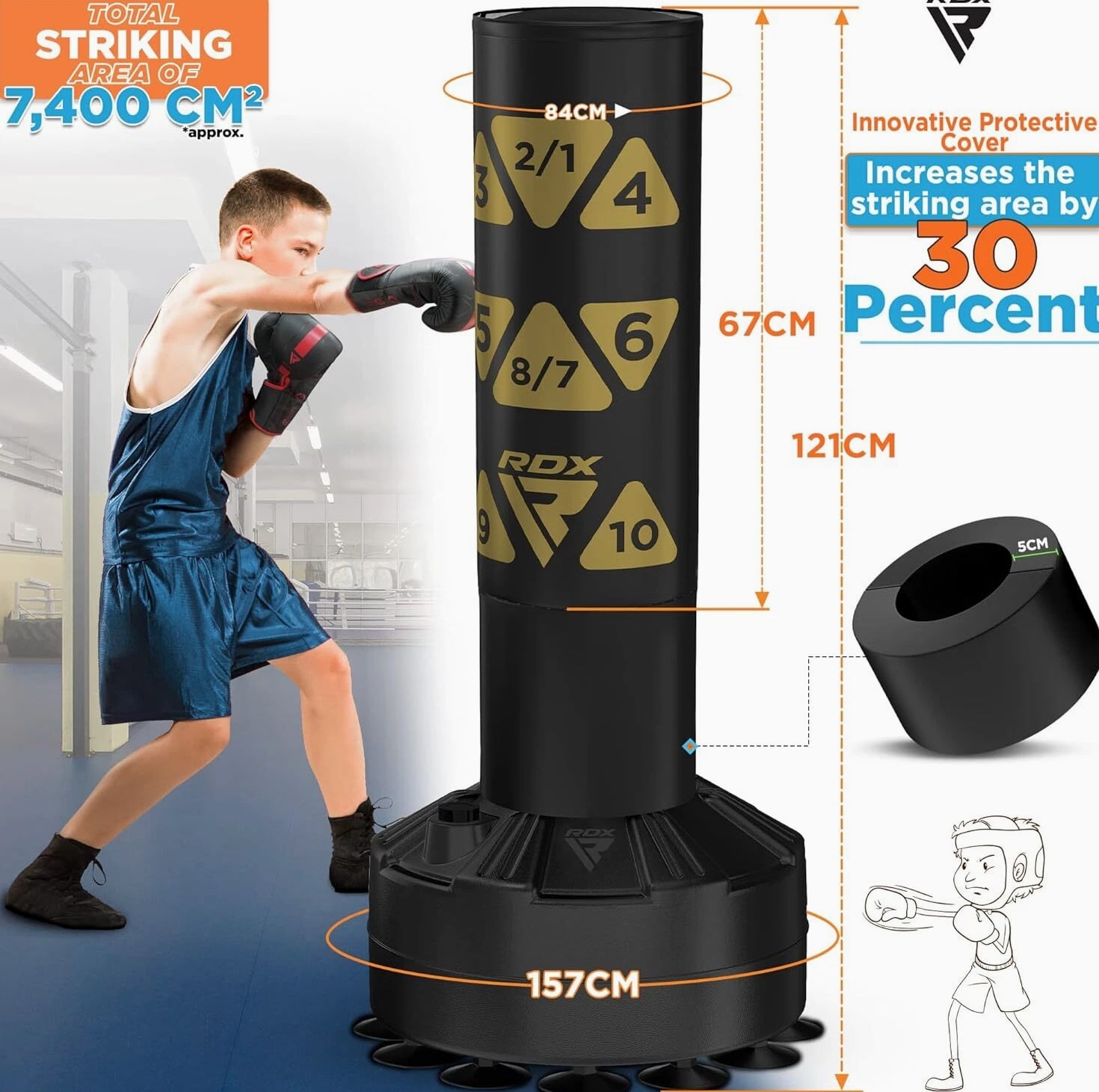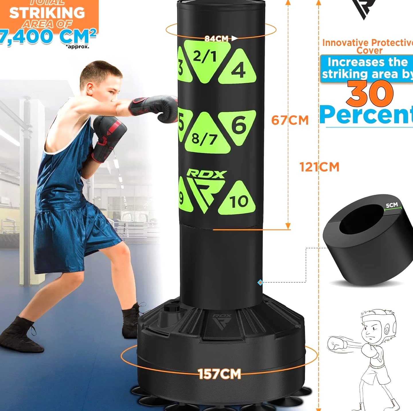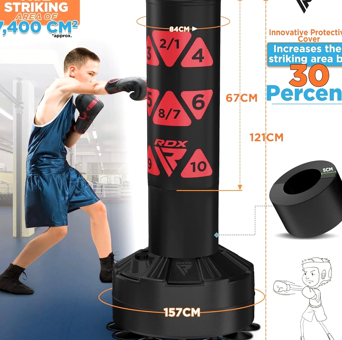 Product Features: MULTI-LAYERED MAYA HIDE LEATHER offers career-lasting durability. Top of the line high-density foam filling for a complete training experience at an early stage. Ideal for Boxing, Muay Thai, MMA, Kickboxing, training while building stamina, endurance, footwork and more. HYBRID DESIGN (PATENT PENDING) Ronin Junior bag comes with precision numbered mapping to help your kids increase hand-eye coordination. It is tailor made for early coordination training. Anti-tear nylon lining for enhanced toughness. 4FT RESILIENCE offers maximum force dispersion and balance. Easy to assemble junior bag base can be filled through the wide opening on the side with both water and sand without having to remove the bag or connector from the base. When filled with water, the weight is around 50kg and with sand, it varies from 65kg to 70kg. VACUUM LOCK BASE with 12 suction cups for high level stability and unprecedented grip. State of the art connector is densely padded and helps prevent the bag from swaying and tilting excessively. HIGH DENSITY FOAM COLLAR protector at the base to increase striking area and enhanced stability. Extra thick cushioning provides ultimate protection for feet kicks and Quick EZ Hook and Loop closure of the collar pad provides a secure fit. (Due to size of the item, punch bag base and bag itself will be shipped in two separate parcels)