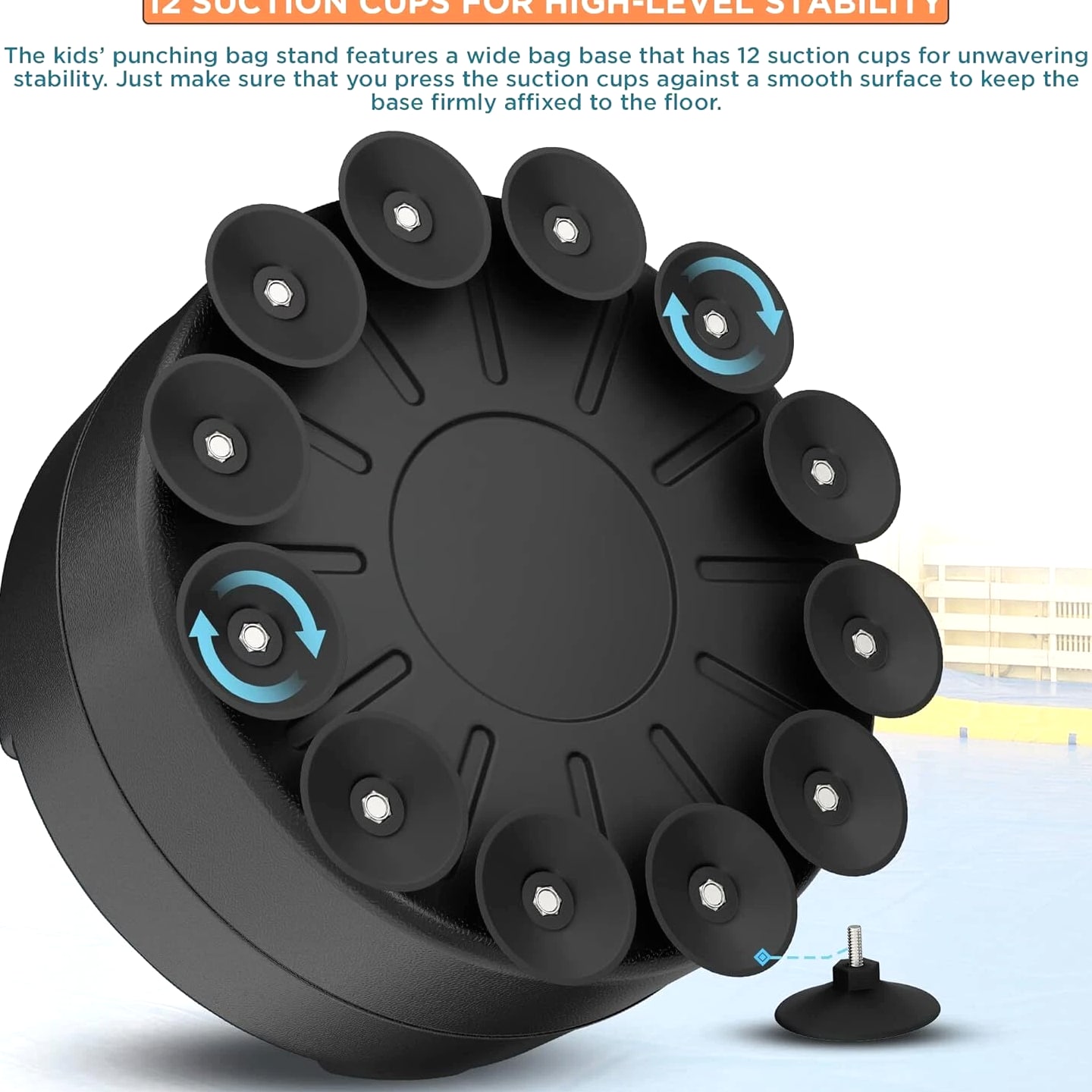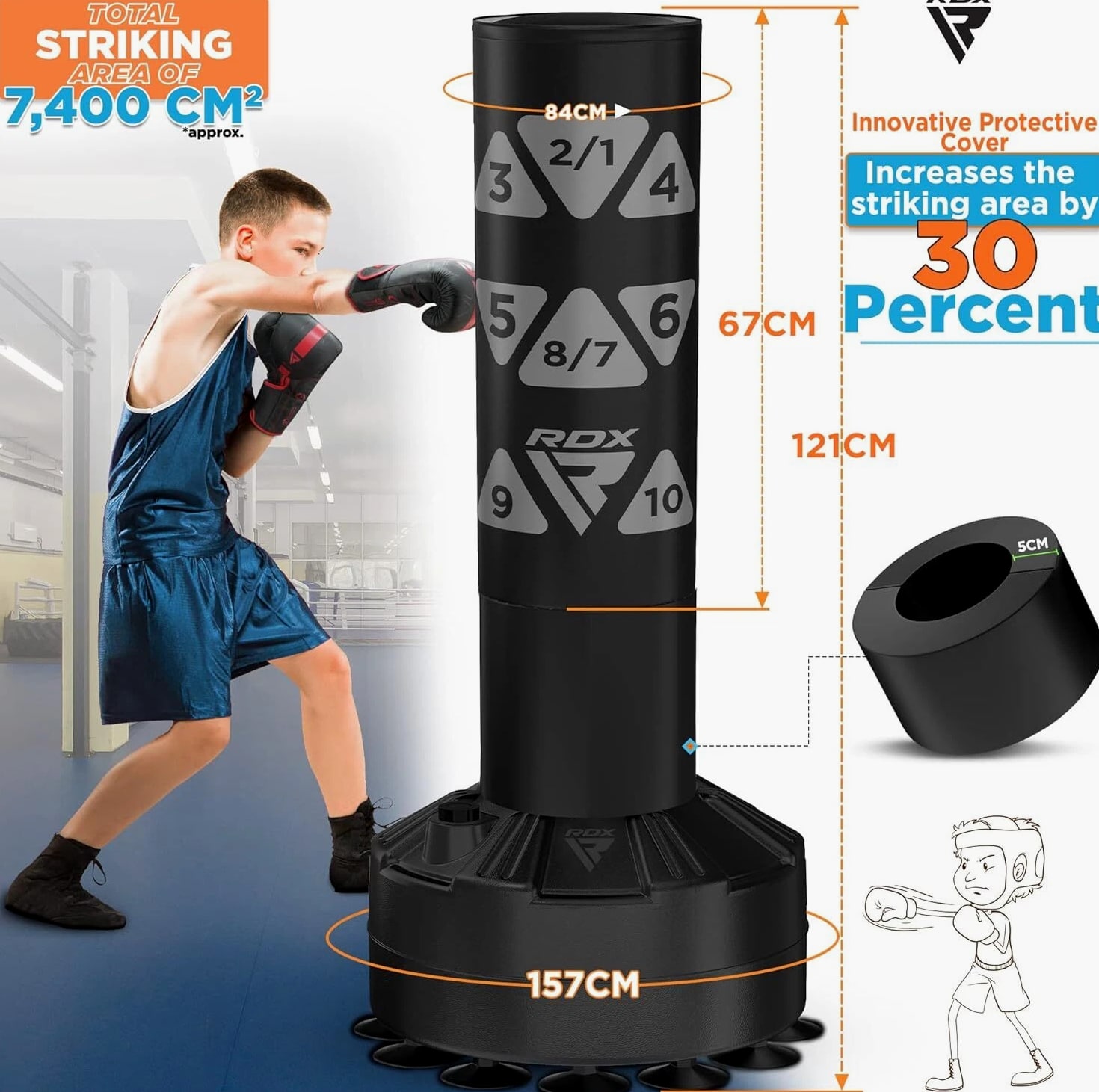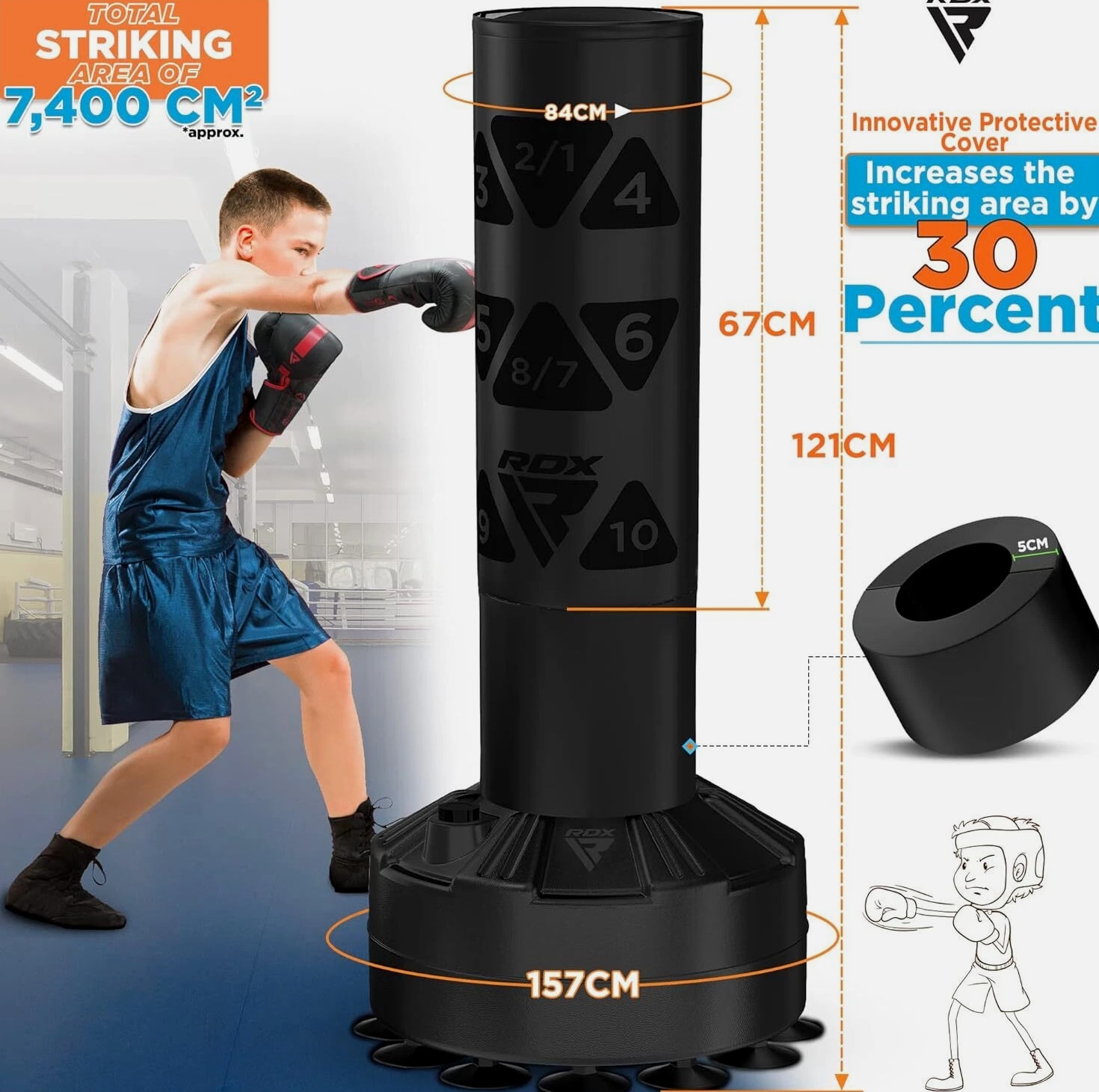 Product Features: MULTI-LAYERED MAYA HIDE LEATHER offers career-lasting durability. Top of the line high-density foam filling for a complete training experience at an early stage. Ideal for Boxing, Muay Thai, MMA, Kickboxing, training while building stamina, endurance, footwork and more. HYBRID DESIGN (PATENT PENDING) Ronin Junior bag comes with precision numbered mapping to help your kids increase hand-eye coordination. It is tailor made for early coordination training. Anti-tear nylon lining for enhanced toughness. 4FT RESILIENCE offers maximum force dispersion and balance. Easy to assemble junior bag base can be filled through the wide opening on the side with both water and sand without having to remove the bag or connector from the base. When filled with water, the weight is around 50kg and with sand, it varies from 65kg to 70kg. VACUUM LOCK BASE with 12 suction cups for high level stability and unprecedented grip. State of the art connector is densely padded and helps prevent the bag from swaying and tilting excessively. HIGH DENSITY FOAM COLLAR protector at the base to increase striking area and enhanced stability. Extra thick cushioning provides ultimate protection for feet kicks and Quick EZ Hook and Loop closure of the collar pad provides a secure fit. (Due to size of the item, punch bag base and bag itself will be shipped in two separate parcels)