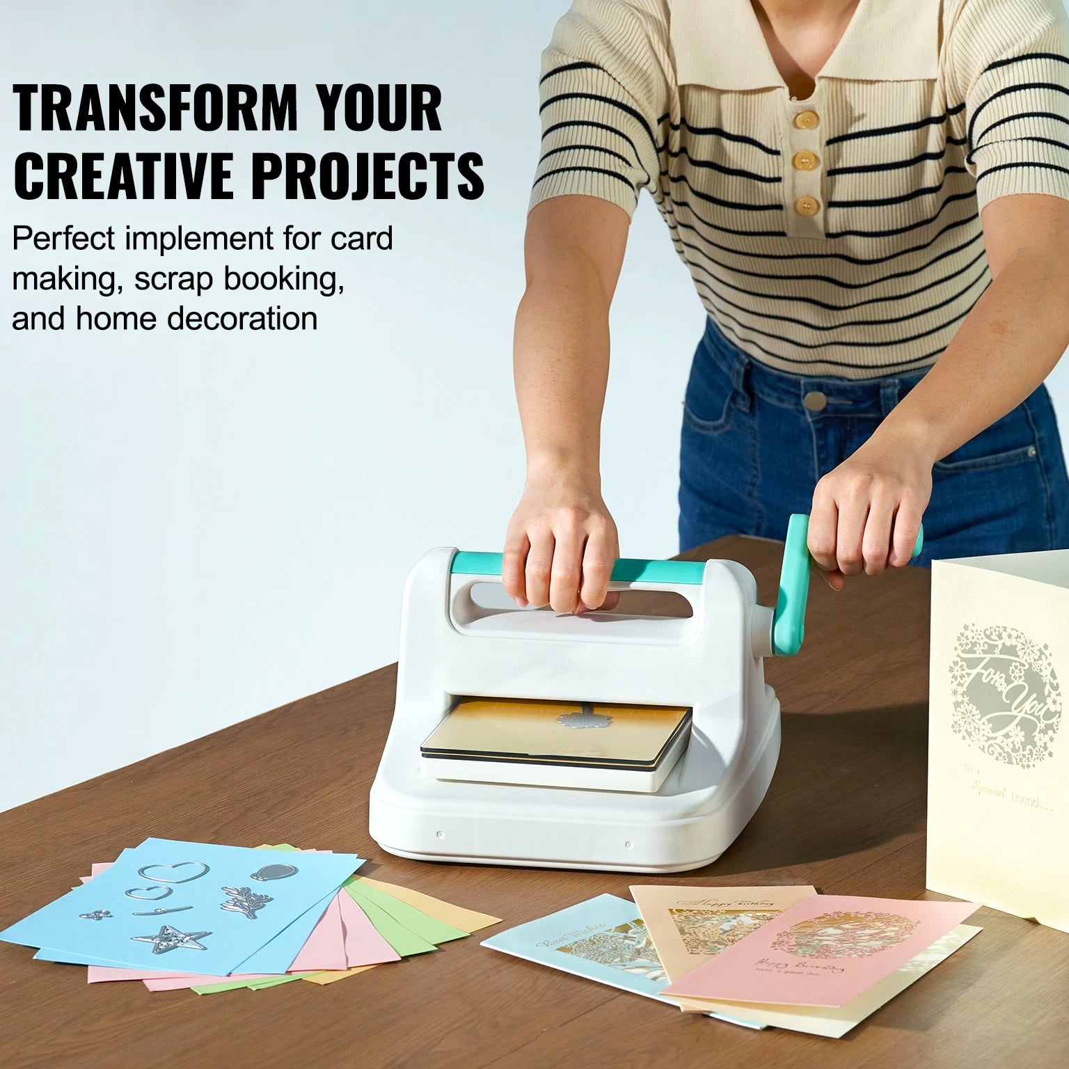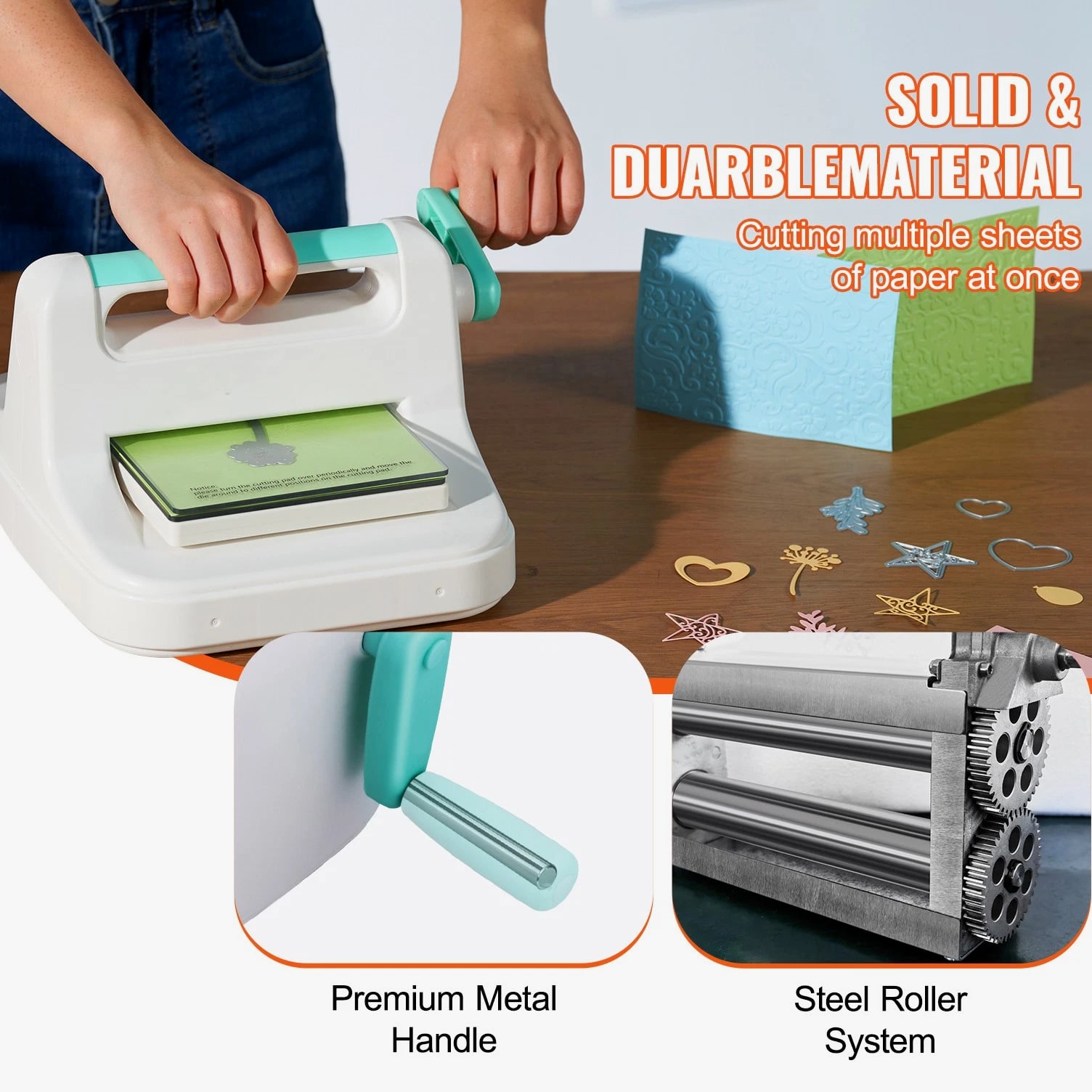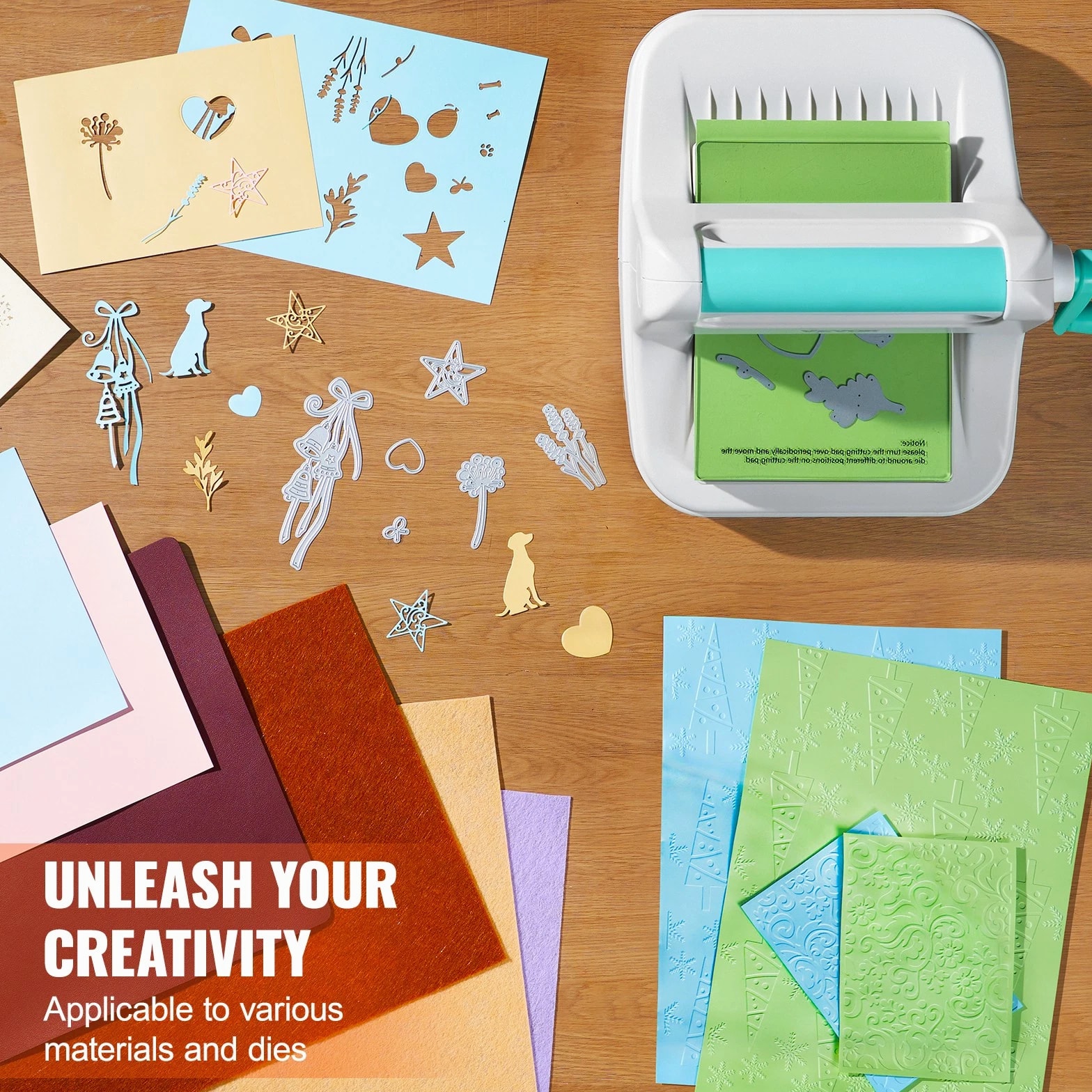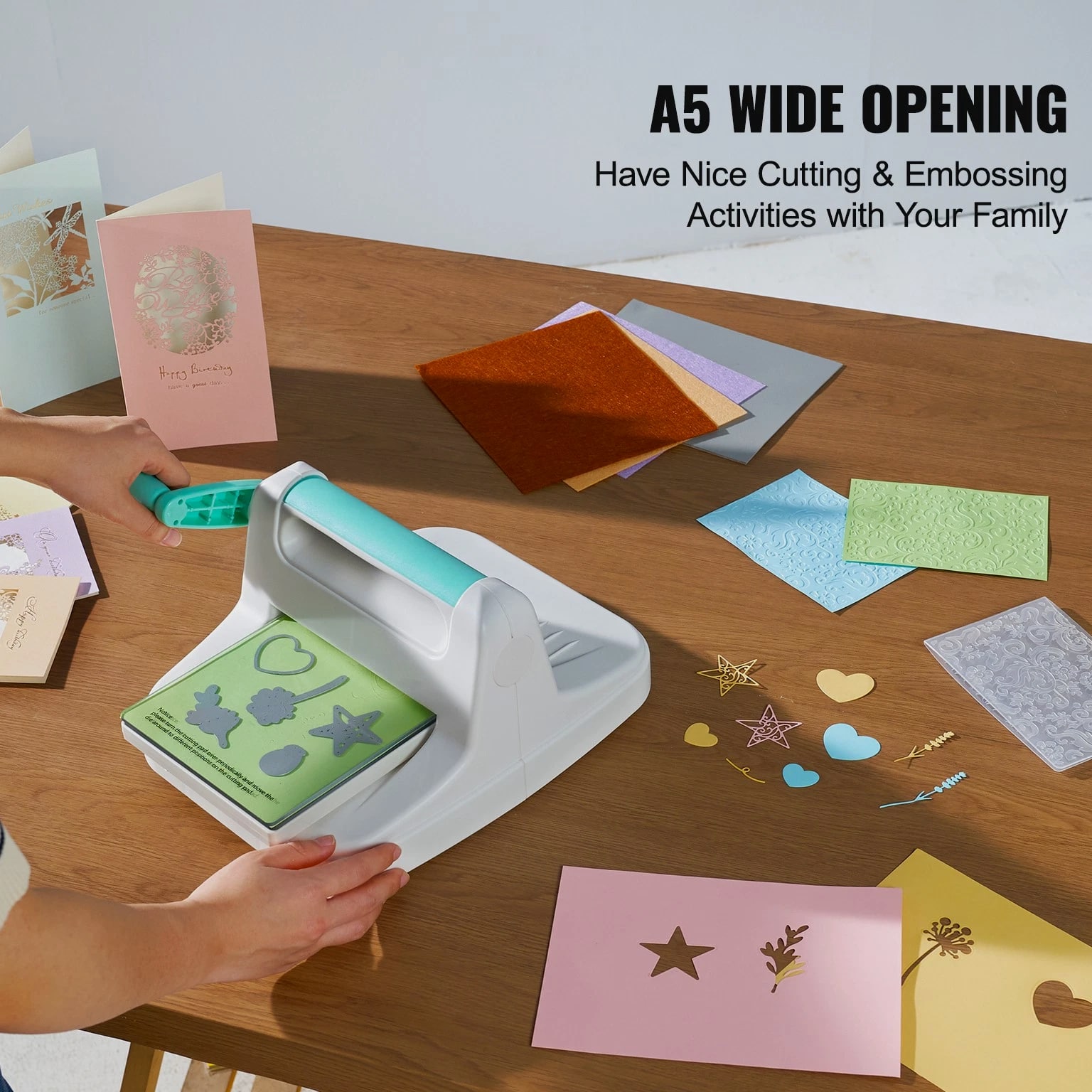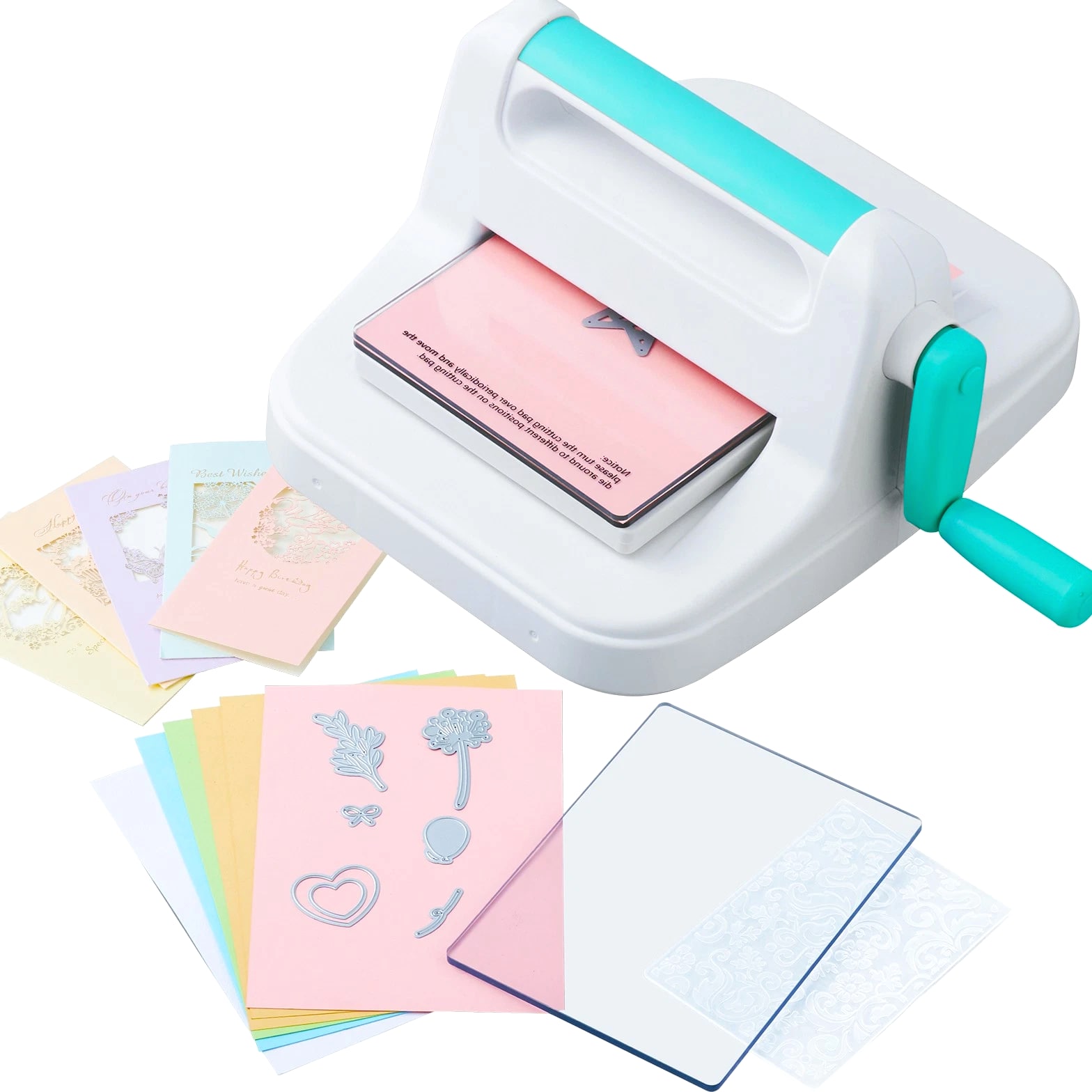 Features & Details Comprehensive Crafting Set: Explore the world of DIY with this versatile manual scrapbooking machine! The kit includes a die-cut machine, embossing pad, two cutting pads, an A6 embossing folder, a plate, eight cutting dies, and ten A5 cardstocks—providing all the essentials for various creative projects. Clear instructions are included, making it easy for beginners to get started quickly! Durable Metal Construction: Featuring a sturdy metal handle and robust steel roller mechanism, this portable die-cutting and embossing machine delivers enhanced force and embossing pressure. It allows you to cut through multiple layers of various materials with ease in just one pass. The well-designed structure ensures reliable performance and extended durability. A5 Wide Opening: This manual die-cutting and embossing machine is compatible with standard 6-inch embossing folders, texture plates, and rule dies. Its compact design ensures convenient storage. Additionally, the stable construction keeps the machine securely in place, reducing the risk of errors during operation. Versatile Usage: This embossing machine is designed to handle a variety of materials, including paper, leather, fabric, and metal sheets. Use everyday materials to explore and express your creative ideas effortlessly! Ideal for Creative Projects: This crafting machine is tailored for individuals who enjoy adding a touch of sophistication to their handmade creations. It is well-suited for a variety of DIY projects, including earring crafting, hair accessory design, jewelry creation, handmade paper crafts, quilting, album embellishment, card design, and home and event decorations.