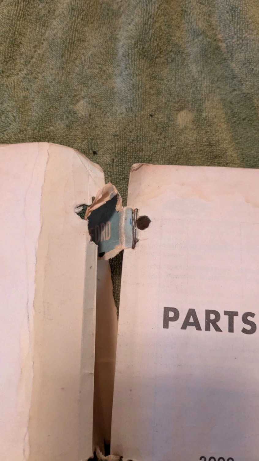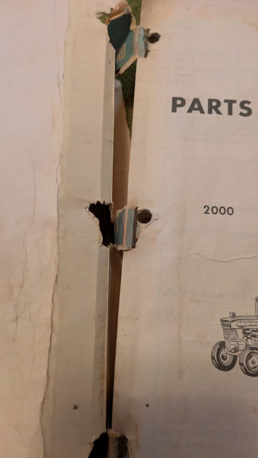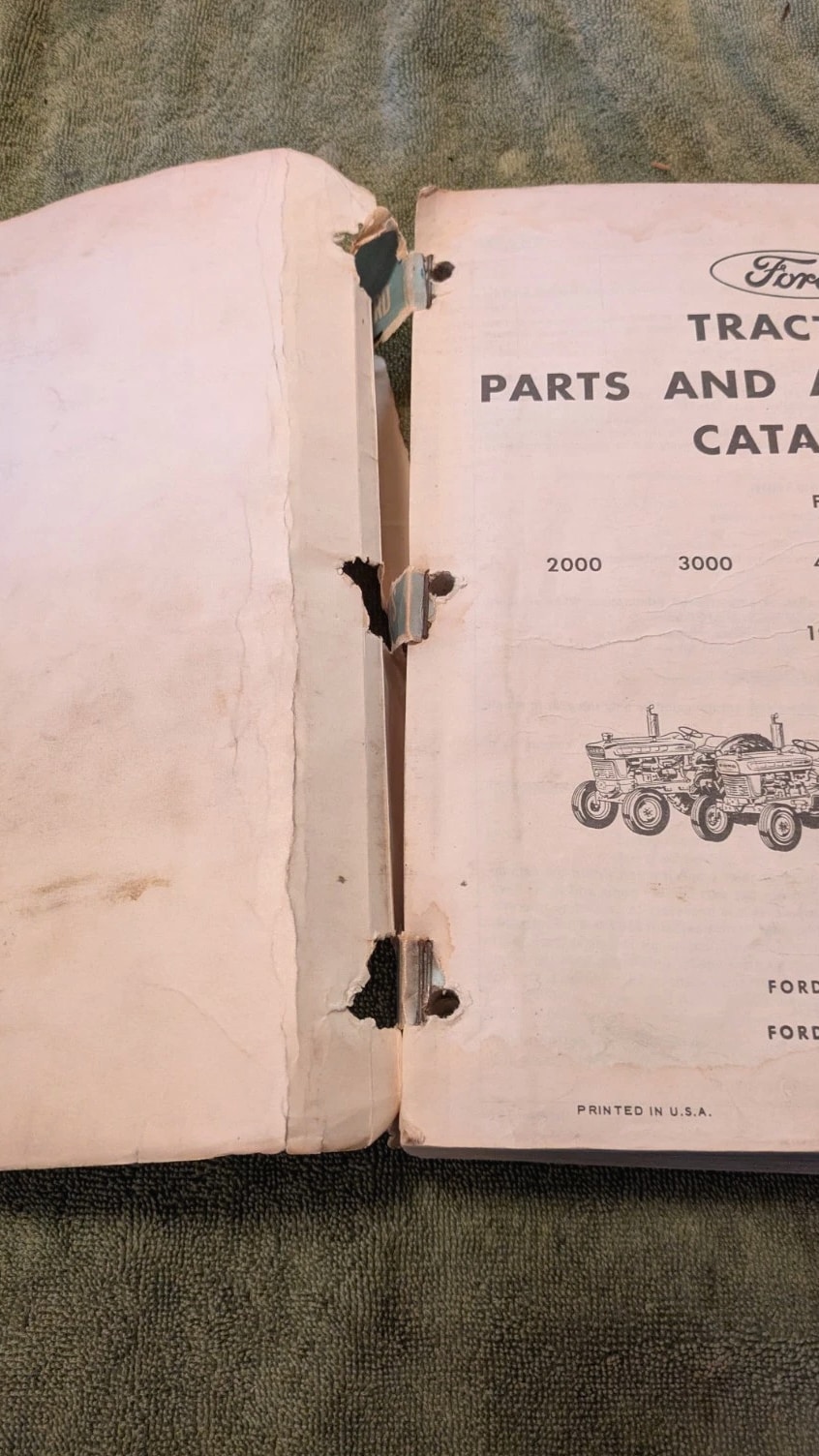 This catalog has some writing on pages, grease and torn cover. There are no missing pages. It's a well used shop manual with plenty of life left in its pages. This original Dealership copy has the original staple binding intact, but the cover is torn.