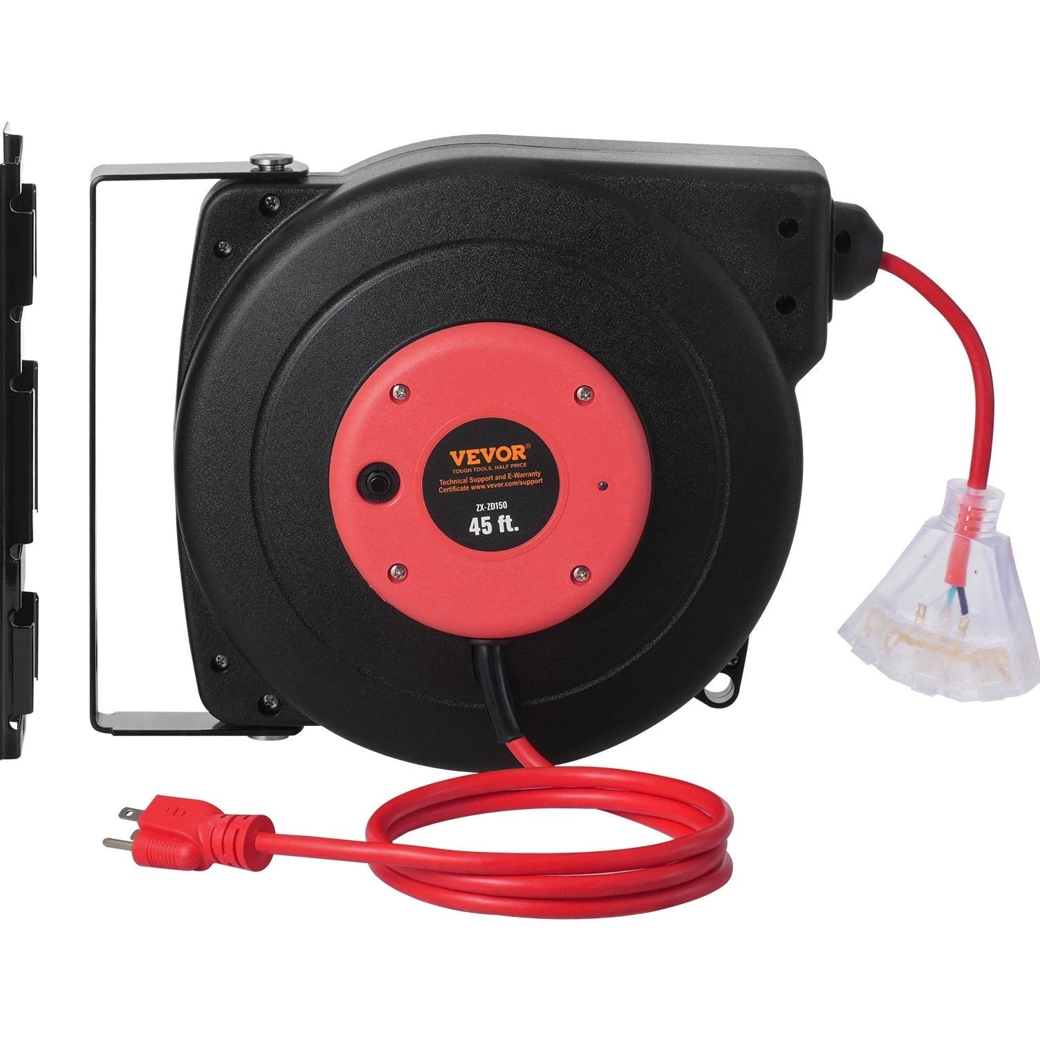 Highlights Heavy Duty 45FT Cord Reel: Ready for any challenge, our 12AWG/3C SJTOW cables are built to resist water, oil, acid, alkali, and ozone. Our retractable extension cord reel features a high-quality PP case, 45 ft extension cord, and 4.5 ft lead-in cord, rated for 15A / 125V / 1875W. Power up and reach further than ever! Choose from 4 vibrant colors to match your style! Lighted 3-Outlet Transparent Socket: Upgrade your power setup with this grounded 3-outlet socket, designed to power multiple devices at once. The built-in indicator light glows when the socket is powered on, ensuring you're always ready to go. It efficiently maximizes both power strips and wall outlets for added convenience. Overload Protection for Peace of Mind: Rigorously tested for electrical security, breaker lifespan, and on/off functionality, our retractable extension cord reel shields your devices from short circuits and overloads. Automatically cuts power if usage exceeds 15A, ensuring secure operation of your power tools. Simply press the reset button to restore power and keep working! Automatic Retractable System: Enjoy hassle-free cable control with our advanced auto-retract system. Featuring an advanced cord stopper, you can easily adjust the cable length and avoid annoying tangles. The inner coil spring is increased by 1 turn, improving elasticity. Enjoy smooth retraction every time! Versatile and User-Friendly: This retractable cord reel is designed for easy installation on walls or ceilings, featuring a 180° swivel bracket for effortless access from any direction. Enjoy the convenience of smooth cable extension and retraction, while keeping your workspace organized and free from tangled cords and trip hazards. Details 45FT Retractable Extension Cord Reel, Get ready to power up! Our retractable extension cord reel features a 45 ft extension cord, a 4.5 ft lead-in cord, an automatic retractable system, and a 15A circuit breaker. Adopting flame-retardant and tangle-resistant 12