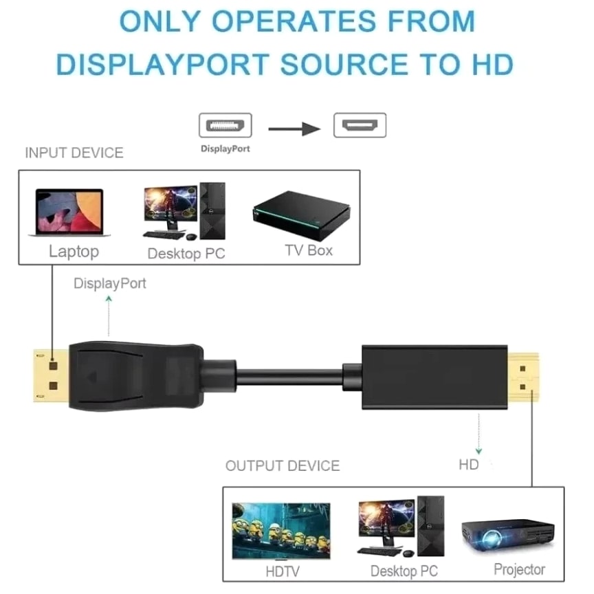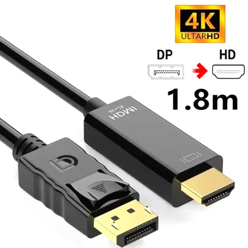 4K DisplayPort to HDMI Cable 1.8M – DP to HDMI Adapter Converter for PC Laptop Monitor TV Projector Connect your DisplayPort-enabled device to an HDMI display with this 4K DisplayPort to HDMI Cable (1.8M). Designed for high-definition video and reliable performance, this plug-and-play adapter delivers smooth 4K visuals and crystal-clear audio for work, gaming, and entertainment. 🎥 Ultra HD 4K Resolution Support Enjoy stunning clarity with support for 4K x 2K resolution, providing sharp, vibrant visuals and colors. Perfect for streaming, presentations, gaming, and extended desktop setups on larger screens. 🔌 DisplayPort to HDMI Connection This cable converts DisplayPort signal to HDMI seamlessly, allowing you to connect: Desktop PCs Laptops TV boxes Workstations To HDMI-enabled devices such as monitors, HDTVs, and projectors. Note: This is not bi-directional. Converts DisplayPort source to HDMI display only. ⚡ Plug & Play Convenience No drivers or software required. Simply connect and start using instantly. Supports both mirror mode and extended display mode for multitasking, presentations, and entertainment. 📏 1.8M Durable Cable Design The 1.8-meter length provides flexible setup for home or office use. Built with durable PVC material and strong connectors for stable signal transmission and long-lasting performance. 💻 Wide Compatibility Compatible with most DisplayPort-enabled devices and HDMI displays, including: PCs and laptops with DisplayPort Monitors and HDTVs Projectors Multimedia systems ✨ Key Features 4K DP to HDMI adapter cable Length: 1.8M Input: DisplayPort male Output: HDMI male Supports 4K x 2K resolution Mirror & extend display modes Plug and play – no drivers needed Durable and flexible PVC cable Upgrade your workstation or entertainment setup with this 4K DisplayPort to HDMI converter cable, delivering reliable high-definition performance for home, office, and professional use.