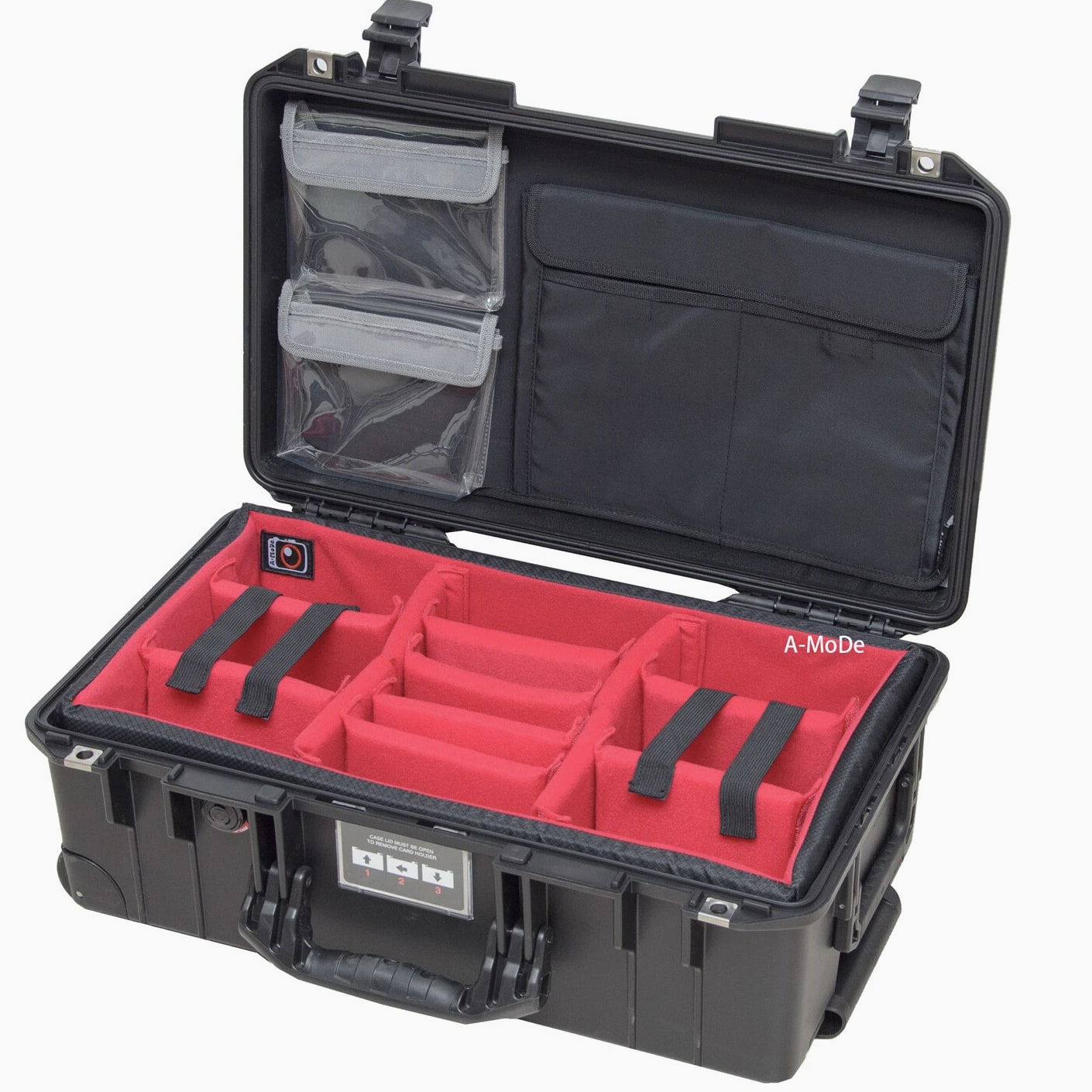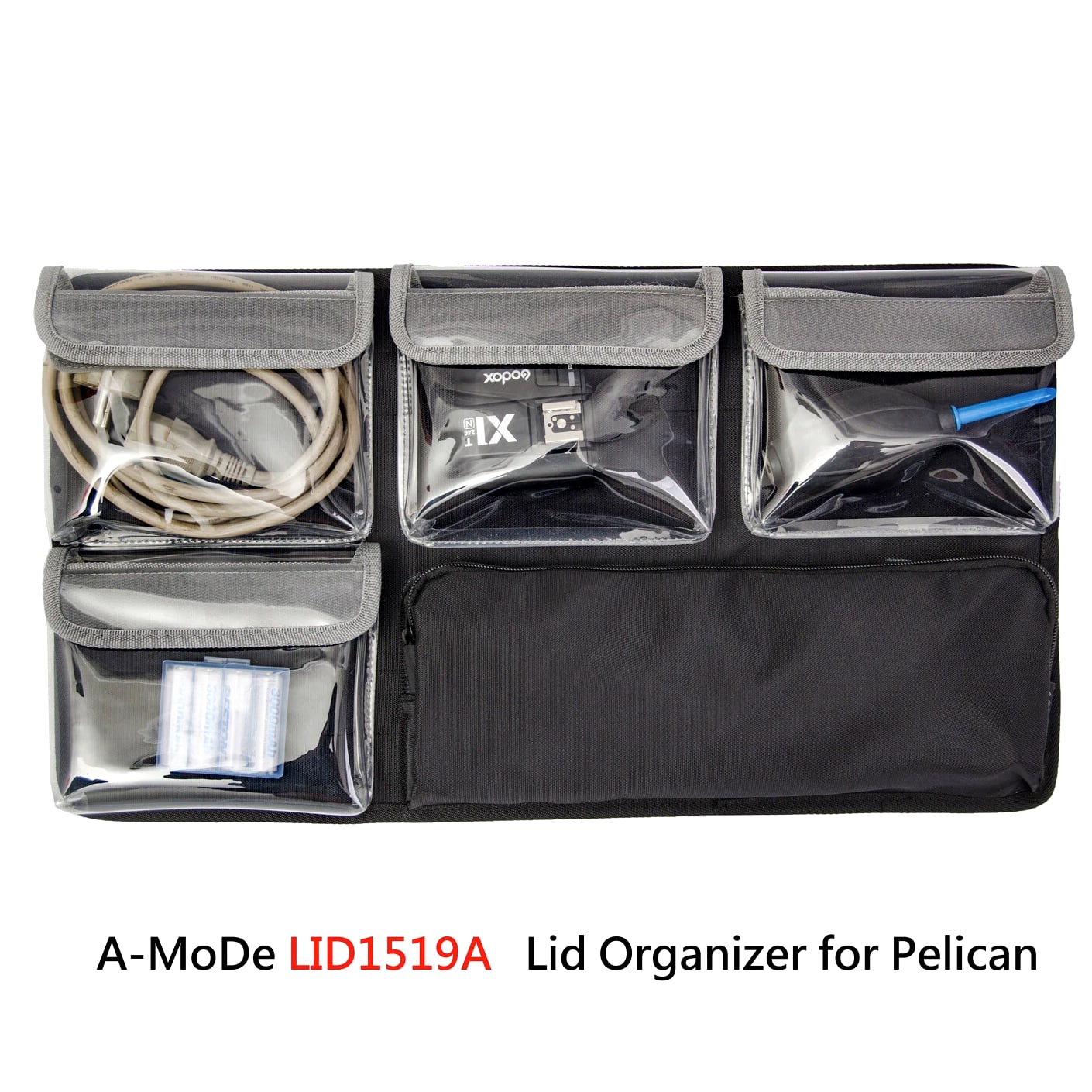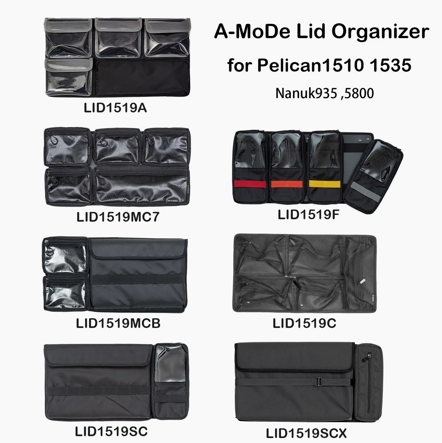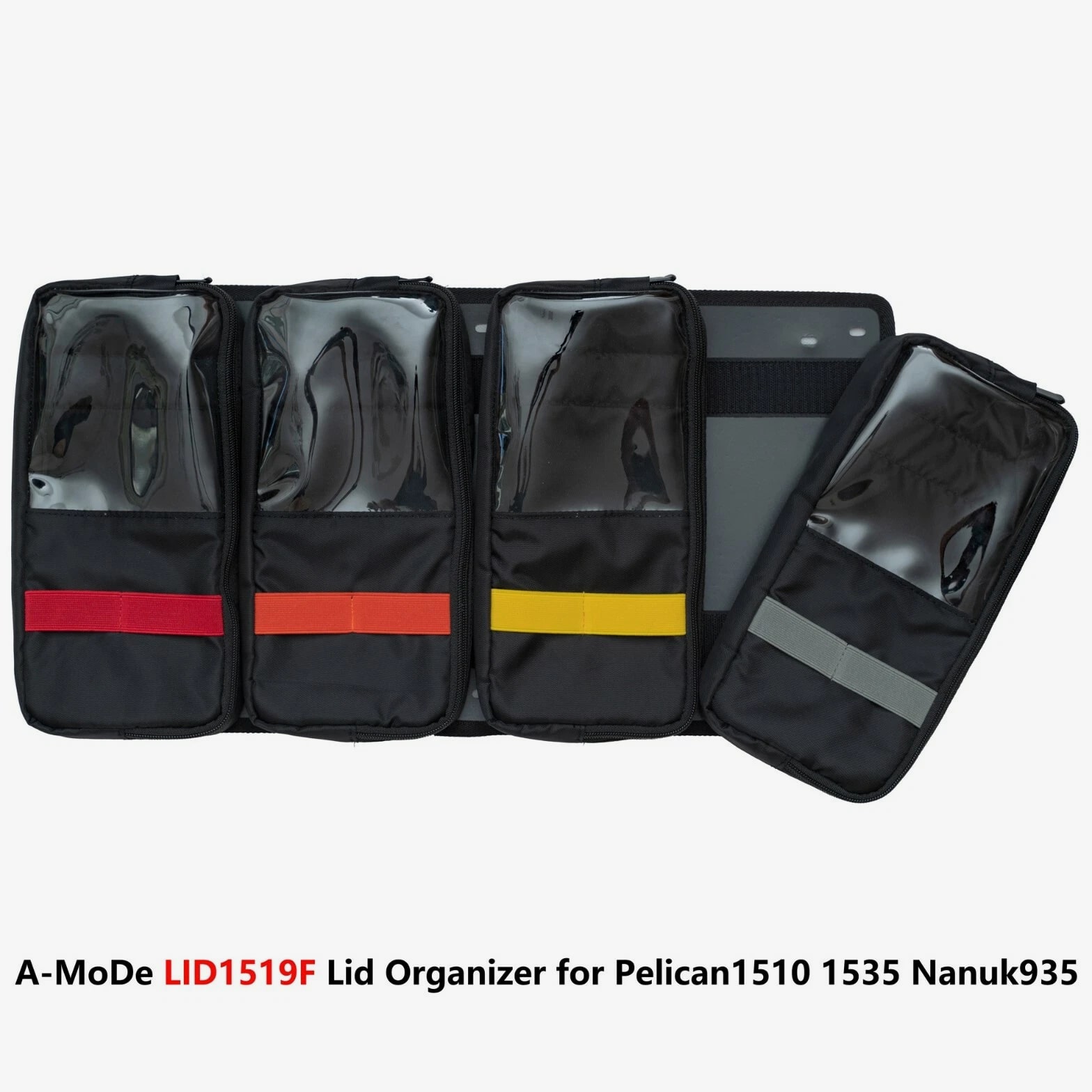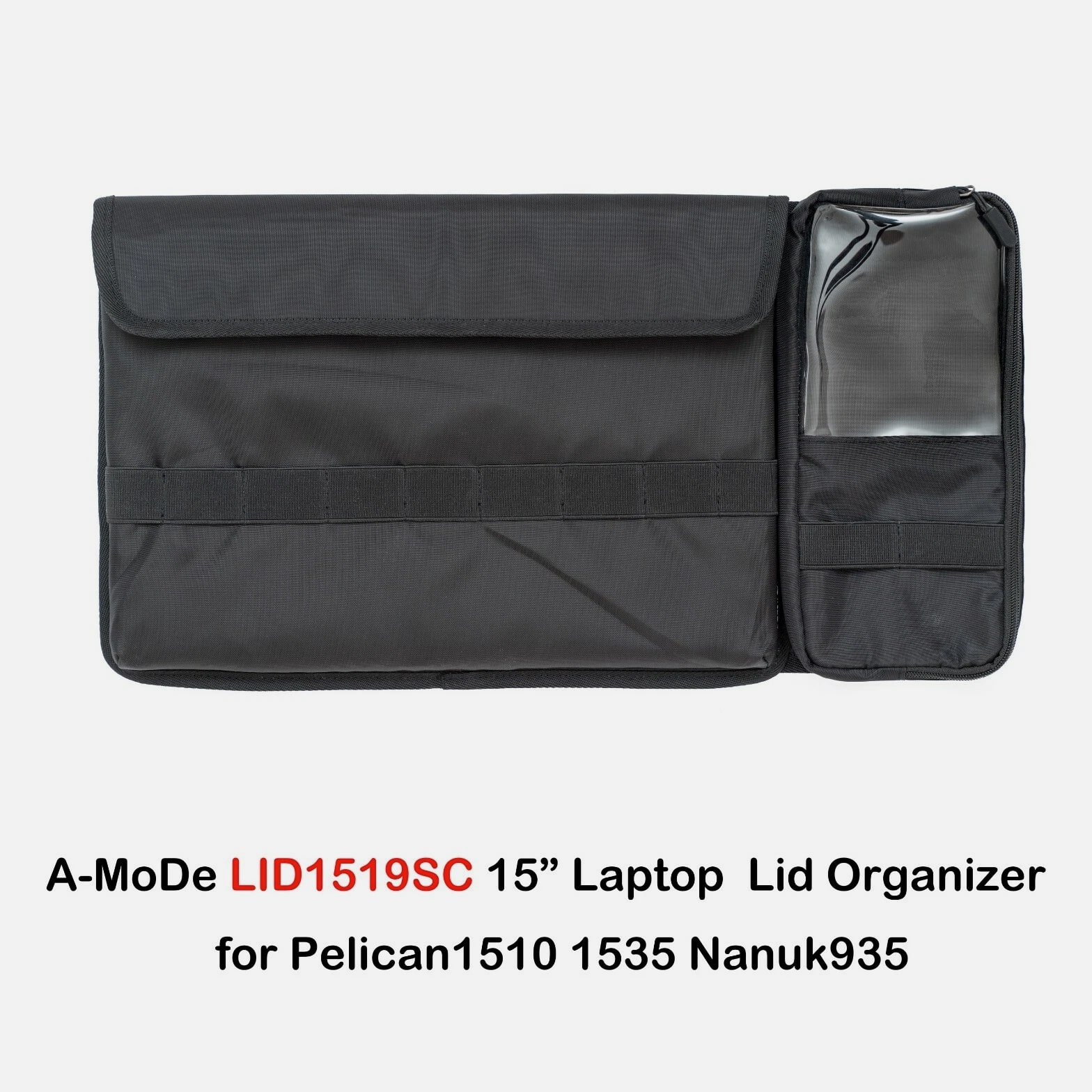 A-MoDe LID1519SC Lid Organizer l 2 in 1 protection: Waterproof laptop/iPad/netbook sleeve and accessories pouch l 1 pocket, 15 16 inch (36.5 x 27cm, 14.3 x 10.6 x 1.7) laptop and iPad mini. **macbook pro 16" size 35.57 x 24.81 x 1.68 ** l Laptop sleeve padded: 2mm EPE, made of durable 400D waterproof nylon l Includes 6 easy to install screws into pre-drilled holes. l Includes 1 flat padded attachment to the Pelican lid, easily exchangeable with Lid1510A or B l Designed to fit only Pelican 1510 1535 Nanuk 935 IM2500 safety box l Dimensions: 51.5 x 28cm (20.27 x 11") LID1519A Product Highlights •4 clear pockets, 1 zipper pocket with hidden zipper head. •Made of durable 600D nylon and clear TPU pockets for visibility. •Adds more 1/3 storage to organize your equipment. •0.5mm thick TPU, anti-static wear-resistant TPU material (not subject to temperature changes) •Includes 6 easy to install screws into pre-drilled holes. •Includes 1 flat padded attachment to the Pelican lid, easily exchangeable with Lid1510B •Suitable for Pelican 1510 1535 IM2500 1519 1514 safety box A-MoDe LID1519MCB Laptop Lid Organizer 2 clear mesh film pockets, 13" 14" Macbook laptop (pocket size: 33 x 23 cm) and iPad mini. Material: 600D waterproof nylon, 0.6mm clear mesh film Weight: 0.45kg Includes 6 screws for easy installation into pre-drilled holes. Includes 1 flat pad that attaches to Pelican lid and can be easily replaced Applicable to Pelican 1510 1535 Nanuk 935 IM2500 1519 1514 safe Includes: 1 laptop pouch, 2 pockets, 1 mounting pad and screws (Apache 5800 and IM2500 or other safety shells need to be installed with double-sided tape.) A-MoDe LID1519F Lid Organizer 4 clear zipper pockets with hidden zipper head (removable design) Made of durable 600D nylon and clear pockets for visibility. Adds more 1/3 storage to organize your equipment. 0.5mm thick TPU, anti-static wear-resistant TPU material (not subject to temperature changes) Includes 6 easy to install screws into pre-drilled holes. Include