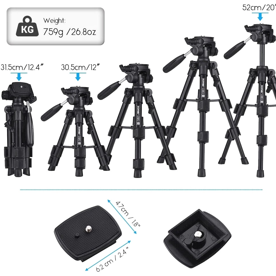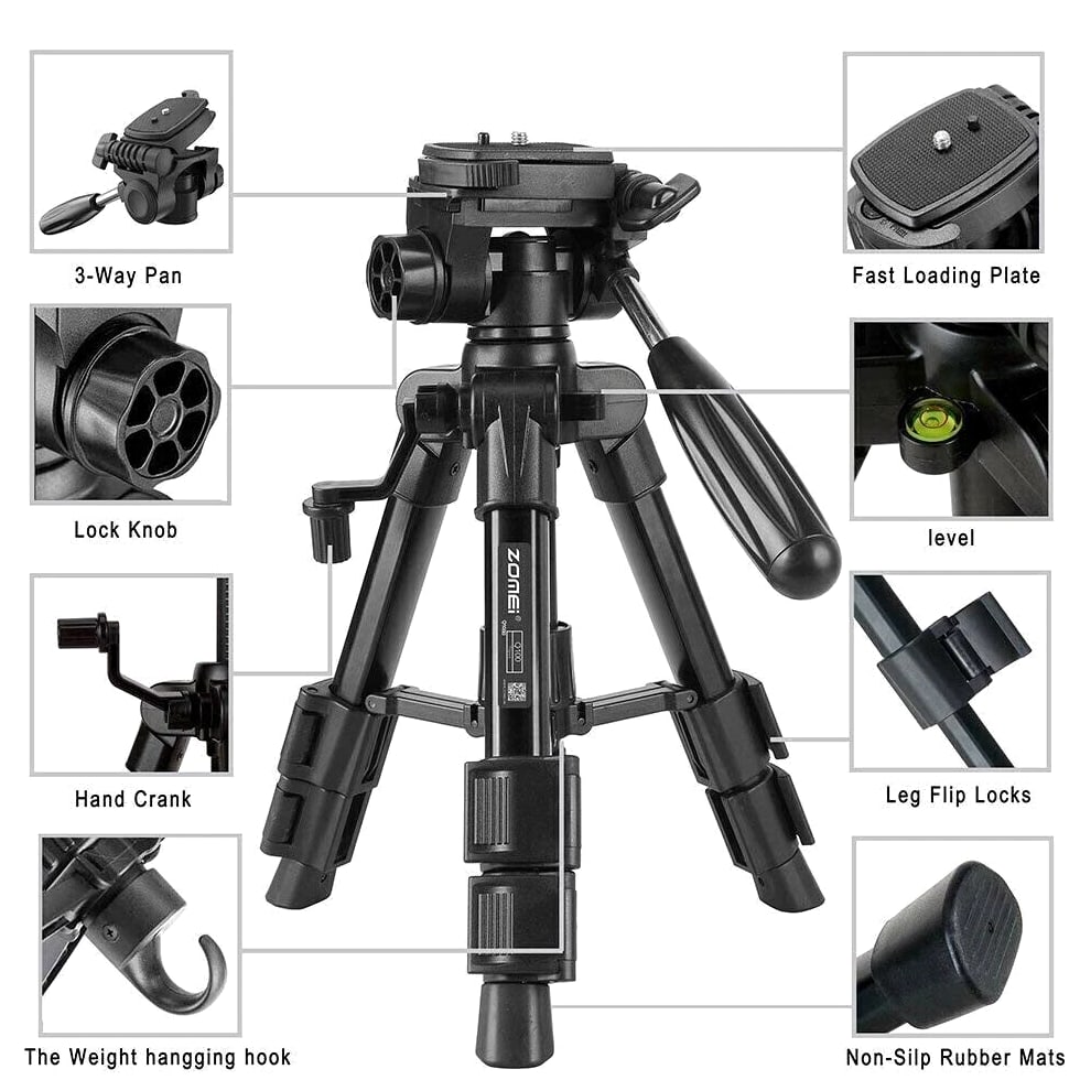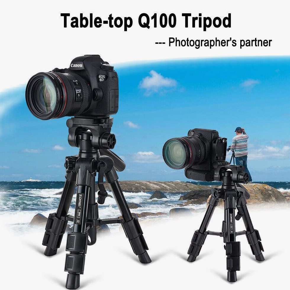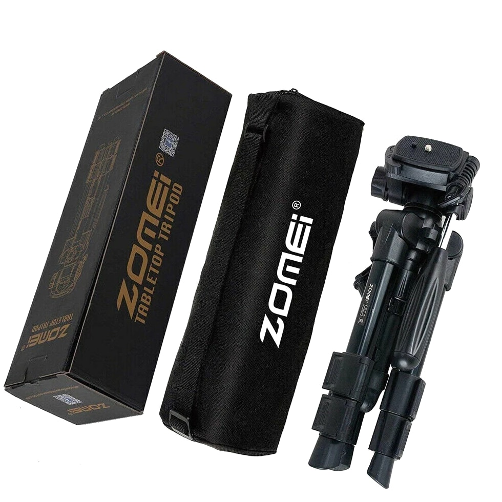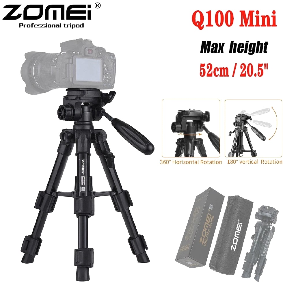 COMPACT PREMIUM MATERIAL: Zomei table tripod made of high quality aluminum alloy tube and ABS environmental plastic PORTABLE MINI SIZE: The working height for this mini tripod ranges from 12.5 inch to 21 inch and maximal loading weight is 6.6lbs. You can use this small table tripod to fasten common cameras, cellphone, ipad, telescope etc. It's one great travel tripod option EASY TO SET UP: 1/4" screw on the quick release plate for mounting most DSLR cameras such as Canon, Nikon, Sony, and 3/8" screw hole at the bottom for being mounted on most tripods, monopods FLEXIBLE PAN HEAD: The head has pan and tilt head which can be locked in position and also flipped 90° to quickly switch between portrait and landscape. There is a quick release plate, which means once attached to the camera, you can quickly switch between handheld and tripod QUALITY GUARANTEE: Zomei always striving to provide high quality products and best service for our customers. All tripods have 12 month guarantee. If you have any problem with the product please contact us directly, we will respond within 24 hours Product Description Details: - Quick-release mounting plate helps ensure fast transition between shots - 3-way swivel pan head with a bubble gradienter provide you with a panoramic view - Non-slip rubber feet increase the stability of the tripod - Portable carry bag allows you to carry this tripod conveniently - This is a universal tripod compatible with Nikon, Canon, Sony etc - Pan head tripod more suitable for DSLR Specifications: Brand: ZOMEI Model: Q100 Color: Black Material: Aluminum alloy Payload: 3000g / 6.6lbs Height: 30.5-52cm / 12-20" Folding Height: 31.5cm / 12.4" Quick Release Plate Size: 6.2 * 4.7cm / 2.4 * 1.8" Item Weight: 759g / 26.8oz Package Size: 33.5 * 10.5 * 10.5cm / 13.1 * 4.1 * 4.1" Package Weight: 990g / 34.9oz Package List: 1 * Tripod 1 * Carrying bag