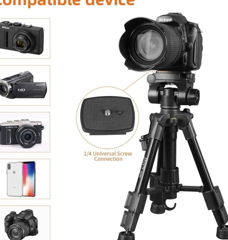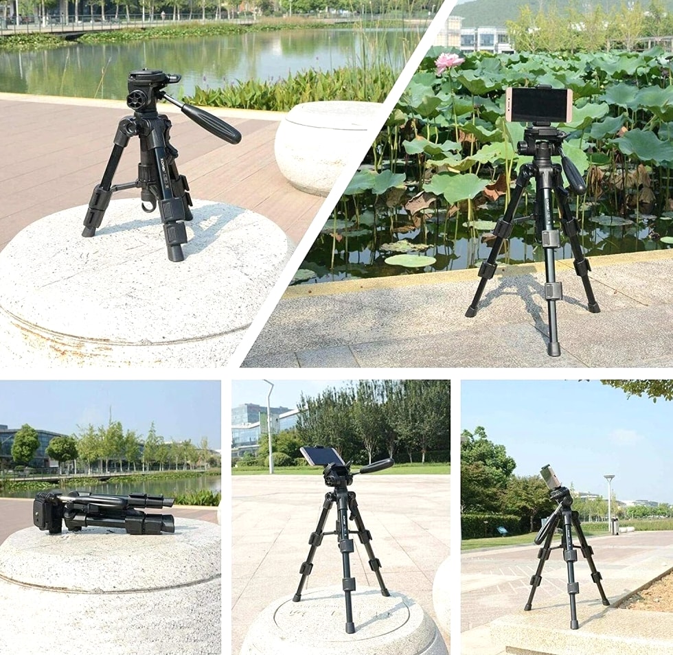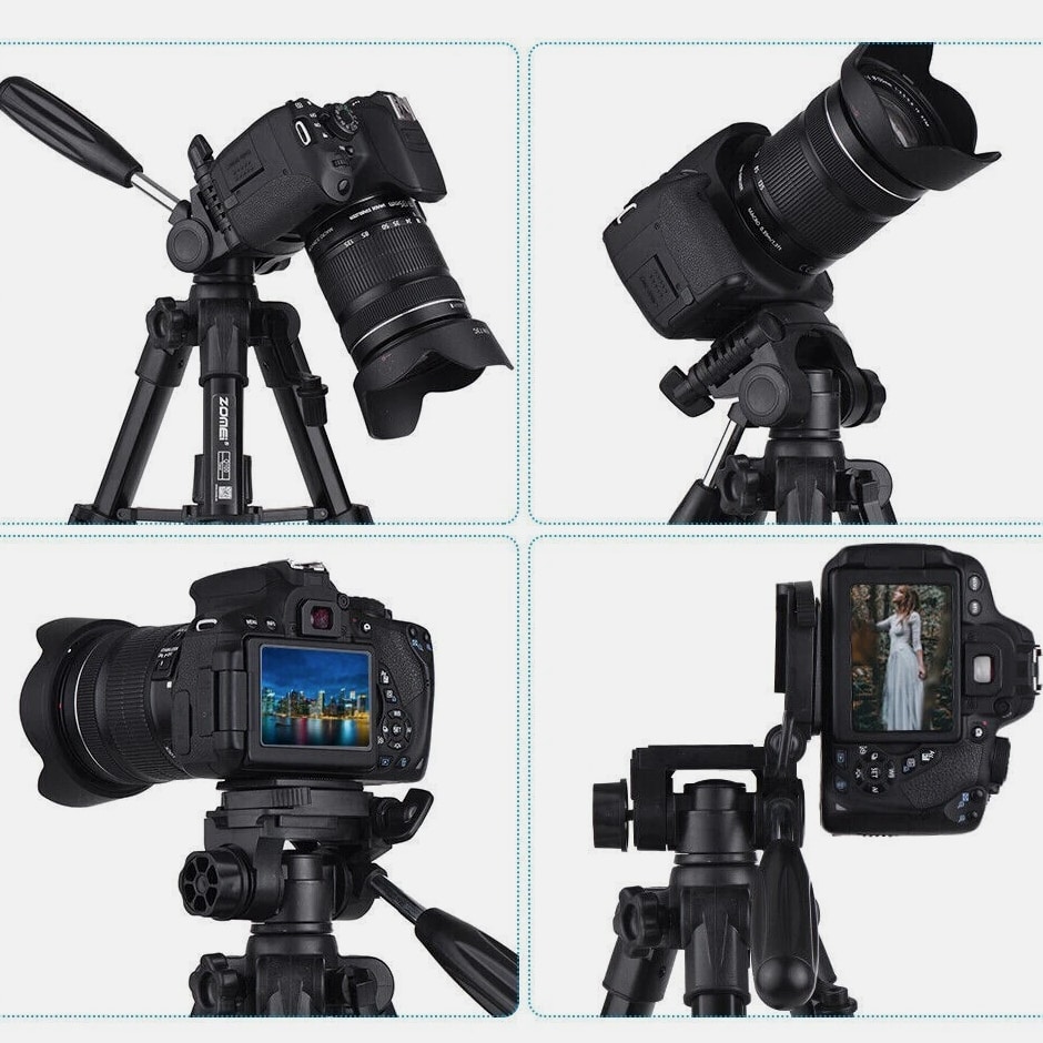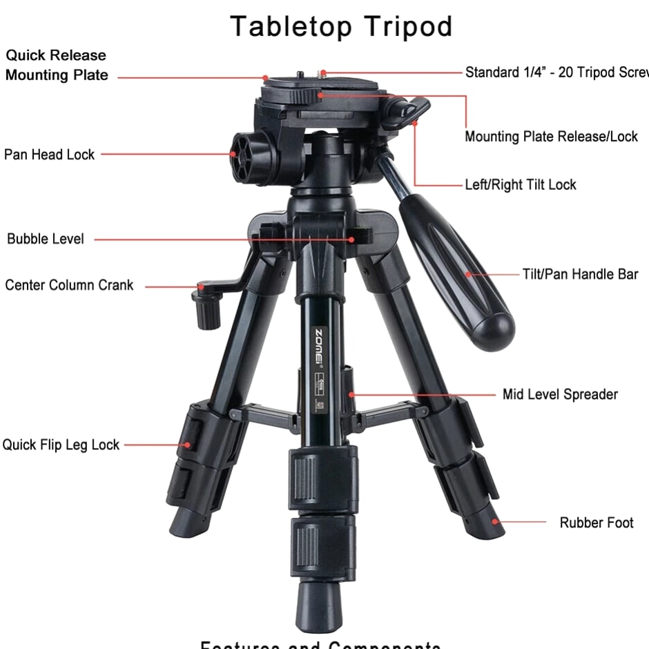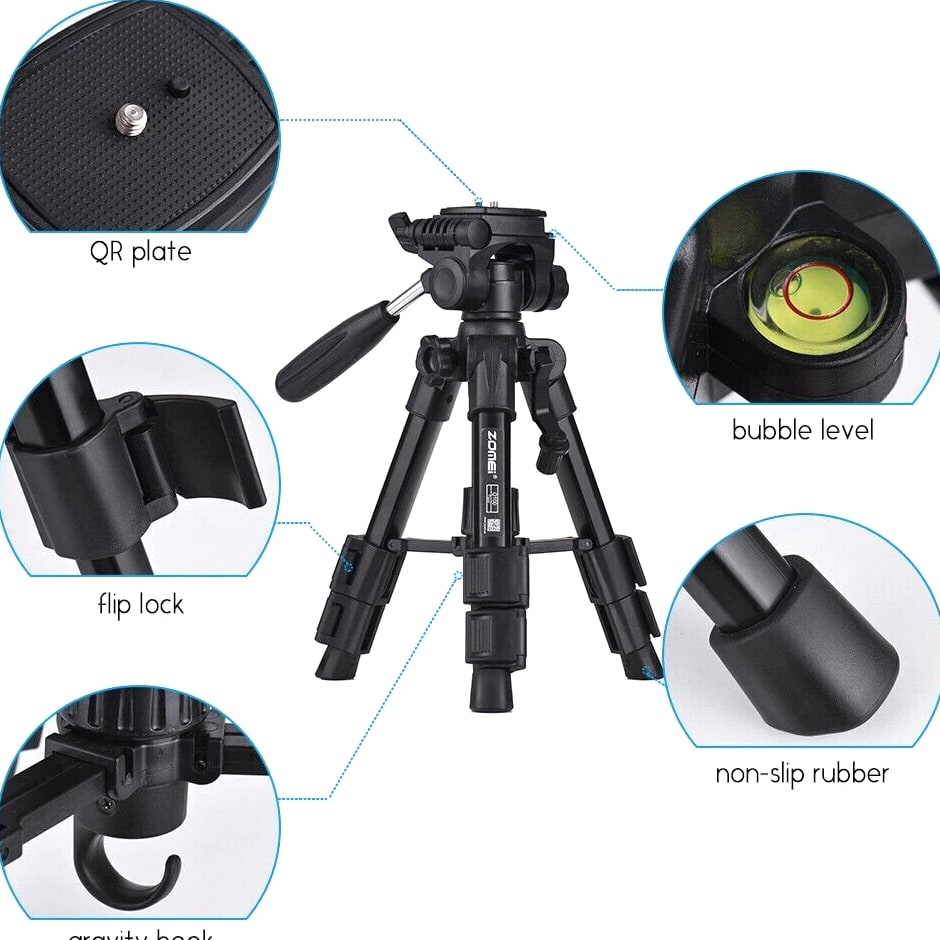 COMPACT PREMIUM MATERIAL: Zomei table tripod made of high quality aluminum alloy tube and ABS environmental plastic PORTABLE MINI SIZE: The working height for this mini tripod ranges from 12.5 inch to 21 inch and maximal loading weight is 6.6lbs. You can use this small table tripod to fasten common cameras, cellphone, ipad, telescope etc. It's one great travel tripod option EASY TO SET UP: 1/4" screw on the quick release plate for mounting most DSLR cameras such as Canon, Nikon, Sony, and 3/8" screw hole at the bottom for being mounted on most tripods, monopods FLEXIBLE PAN HEAD: The head has pan and tilt head which can be locked in position and also flipped 90° to quickly switch between portrait and landscape. There is a quick release plate, which means once attached to the camera, you can quickly switch between handheld and tripod QUALITY GUARANTEE: Zomei always striving to provide high quality products and best service for our customers. All tripods have 12 month guarantee. If you have any problem with the product please contact us directly, we will respond within 24 hours Product Description Details: - Quick-release mounting plate helps ensure fast transition between shots - 3-way swivel pan head with a bubble gradienter provide you with a panoramic view - Non-slip rubber feet increase the stability of the tripod - Portable carry bag allows you to carry this tripod conveniently - This is a universal tripod compatible with Nikon, Canon, Sony etc - Pan head tripod more suitable for DSLR Specifications: Brand: ZOMEI Model: Q100 Color: Black Material: Aluminum alloy Payload: 3000g / 6.6lbs Height: 30.5-52cm / 12-20" Folding Height: 31.5cm / 12.4" Quick Release Plate Size: 6.2 * 4.7cm / 2.4 * 1.8" Item Weight: 759g / 26.8oz Package Size: 33.5 * 10.5 * 10.5cm / 13.1 * 4.1 * 4.1" Package Weight: 990g / 34.9oz Package List: 1 * Tripod 1 * Carrying bag