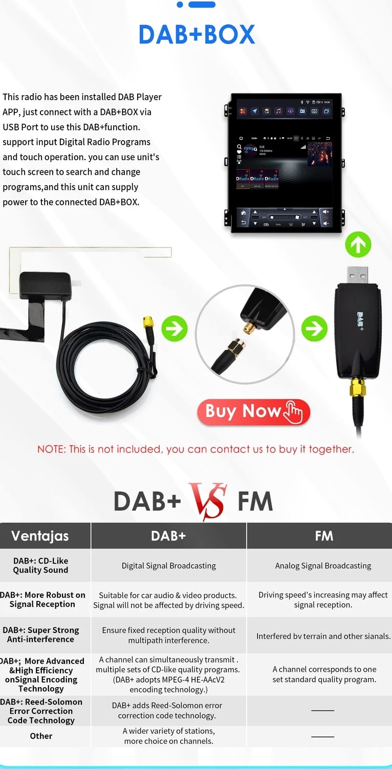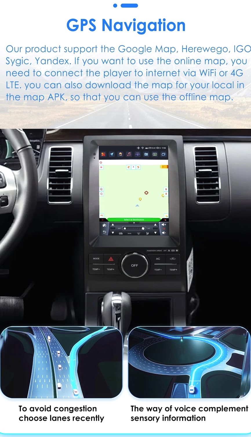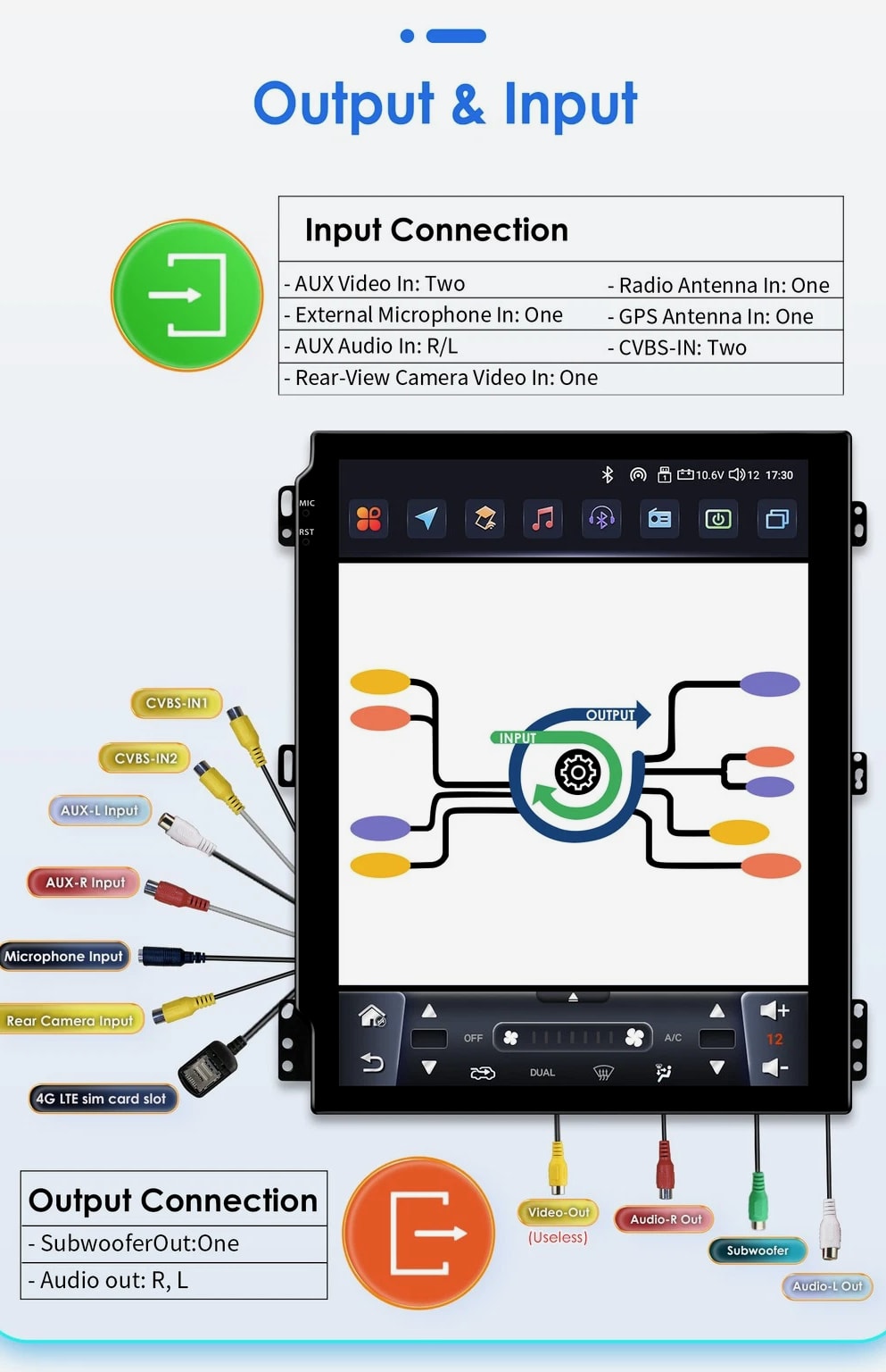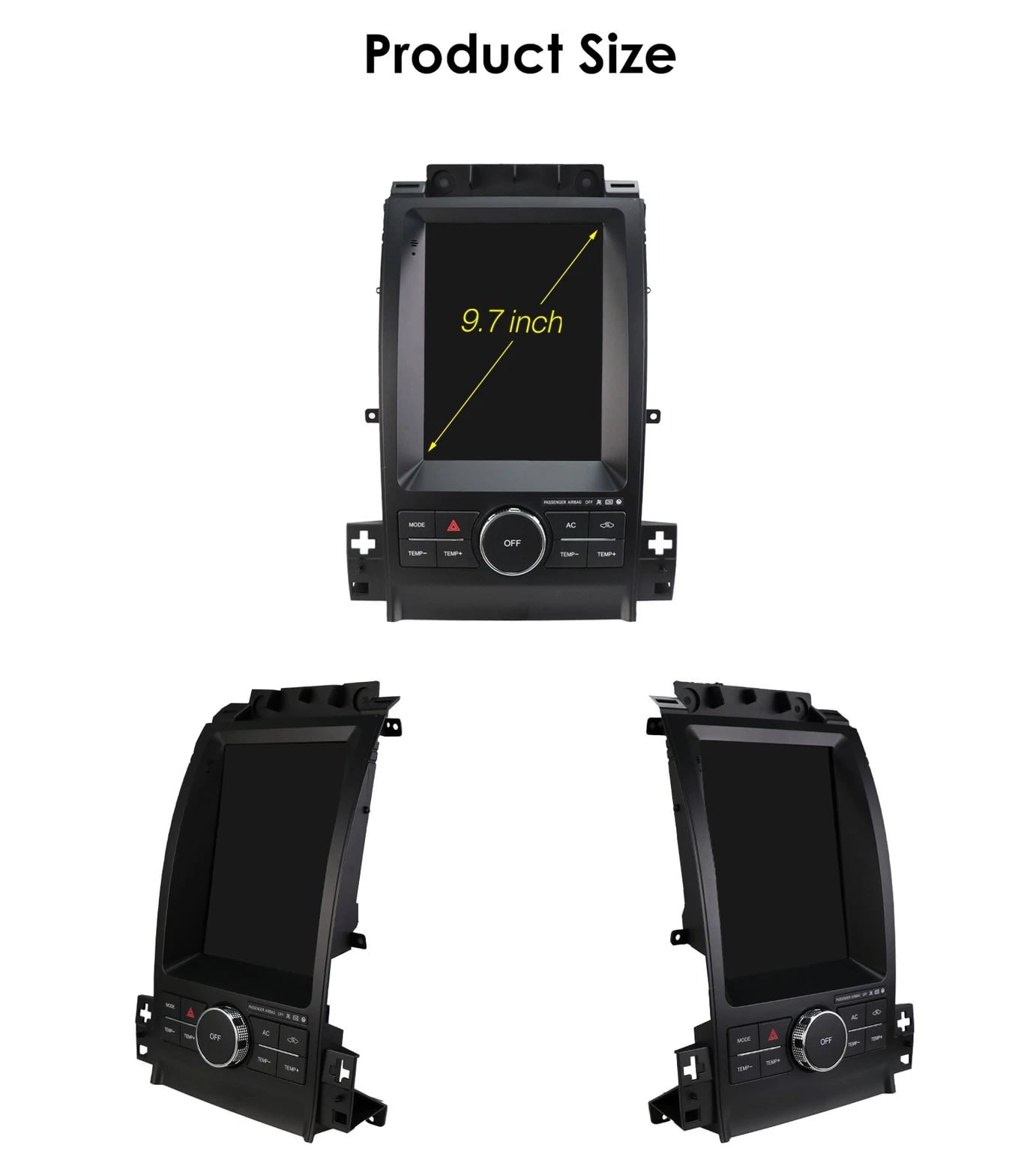 - Power Supply: DC 12V (allowance range: 10.8-14.5V) - Max. Current: 10A - Screen Size: 9.7 inch General - Operation System: Android 12 - CPU: Allwinner A100 1.5Ghz*4 - RAM: 2GB - ROM: 32GB System - Touch Screen: Yes - Resolution: 768*1024 - Capacitive or Resistance Screen: Capacitive - Built-in Clock and Calendar: Yes, show real time and can use network-provided time - Main Menu Status Bar display: Can be changed to Music/Radio/BT-Stereo Player and Clock/Date/Week - Change Apps-Icon Position: Yes - Key Backlight Color: White Display - WiFi: Built-in WiFi Modem, support 802.11b/g/n WiFi - Explorer: Opera, UCWeb, SkyFile, Dolphin, and more explorer options - Online Entertainment: Online Video, TV, Movie, Music, Radio, Video Chat - Online Navigation: Online Maps Navigating - Online Games: Yes, online play or you can download from play store - Online Communication: WeChat, Twitter, Facebook, Skype, Gmail, Whatsapp etc. - Read and edit Office Software: Yes, support Word, Excel, Powerpoint, PDF, TXT Internet - Format: MP3/WMA/MP2/OGG/AAC/MA4/FLAC/APE/WAV etc. Could play via song list - Record: MP3, WMA - Other: LRC synchronized display; ID3 search; Search by files; Album Picture; User-defined audio effect - Amp IC: YD7388 - SNR: Noise ratios: =90dB Audio - Format: Support AVI (H.264, DIVX, XVID), RM, RMVB, MKV (H.264, DIVX, XVID). WMA, MOV, MP4 (H.264, MPEG, DIVX, XVID). DAT (VCD format). VOB (DVD format). PMP, MPEG, MPG. FLV (H.263, H.264). ASF, TS, TP, 3GP, MPG etc. =30 formats, Playing internet video directly (while downloading) - Play: Up to 1920*1080 Pixels, 30Mb. Fluent play without light spot Video - Operation System: Android - Support Maps: Android Map, Sygic, Kudos - Voice Guidance: Yes - Support 2D/3D Map Views: Yes - Dual Zone: Yes, navigating while music playing - Online Navi: Yes, support maps online navigating - Hands Free: Yes - A2DP (Bluetooth Stereo Music): Yes, can play stereo music through Bluetooth - Bluetooth Music Control: Yes, play/pause