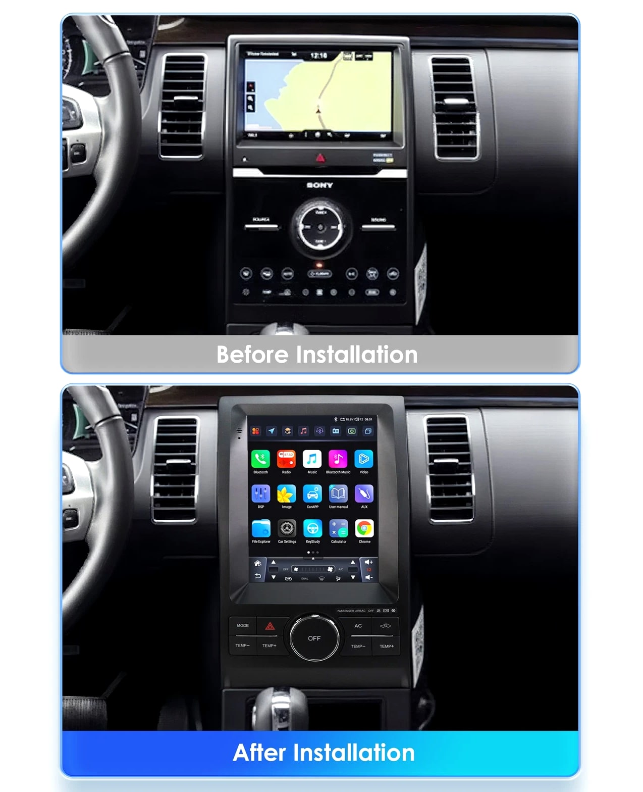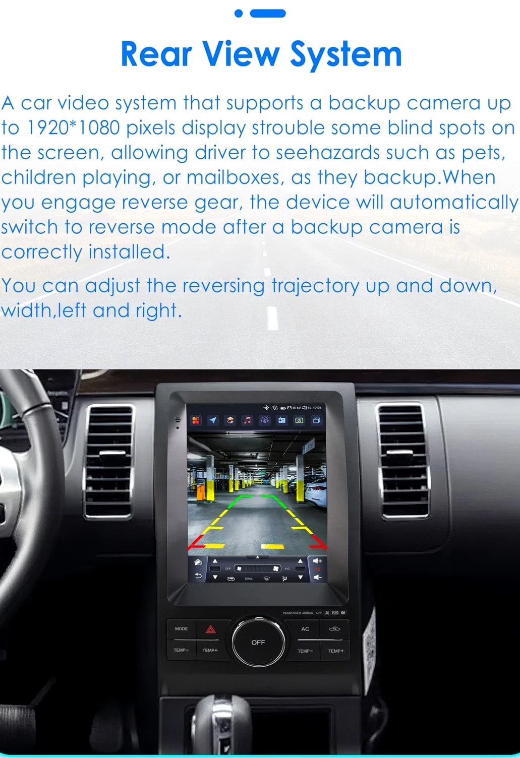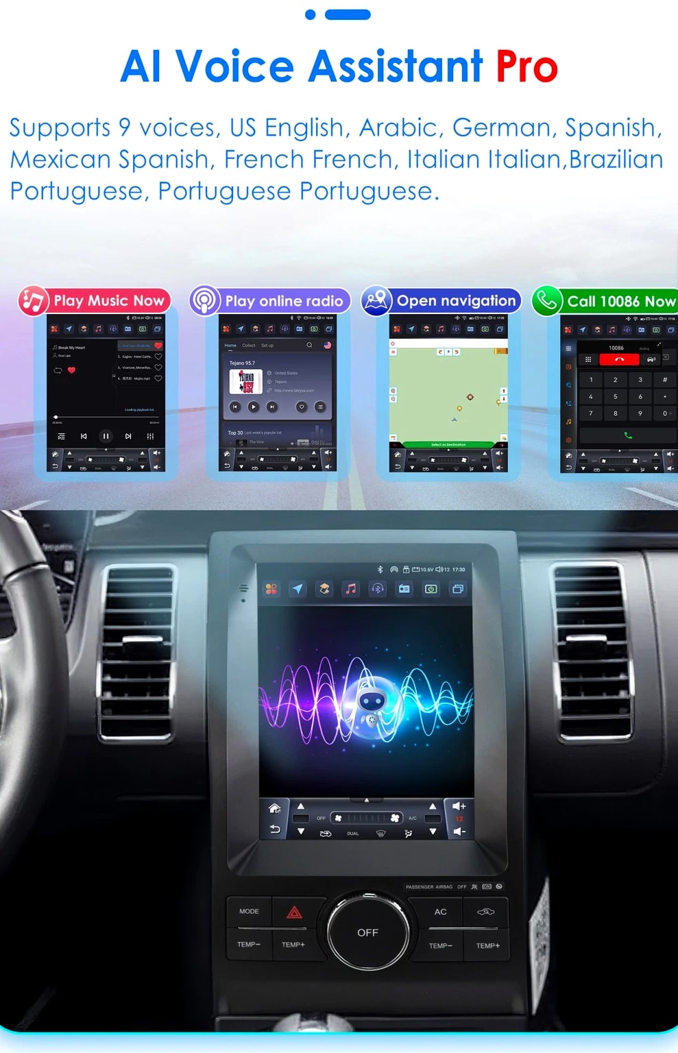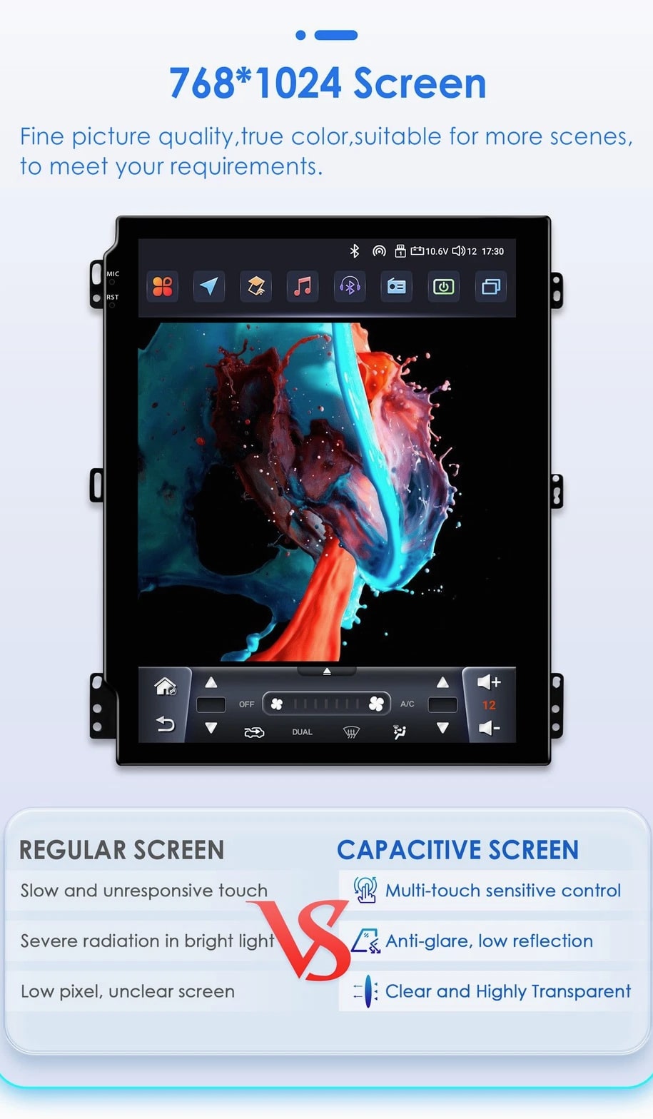 - Power Supply: DC 12V (allowance range: 10.8-14.5V) - Max. Current: 10A - Screen Size: 9.7 inch General - Operation System: Android 12 - CPU: Allwinner A100 1.5Ghz*4 - RAM: 2GB - ROM: 32GB System - Touch Screen: Yes - Resolution: 768*1024 - Capacitive or Resistance Screen: Capacitive - Built-in Clock and Calendar: Yes, show real time and can use network-provided time - Main Menu Status Bar display: Can be changed to Music/Radio/BT-Stereo Player and Clock/Date/Week - Change Apps-Icon Position: Yes - Key Backlight Color: White Display - WiFi: Built-in WiFi Modem, support 802.11b/g/n WiFi - Explorer: Opera, UCWeb, SkyFile, Dolphin, and more explorer options - Online Entertainment: Online Video, TV, Movie, Music, Radio, Video Chat - Online Navigation: Online Maps Navigating - Online Games: Yes, online play or you can download from play store - Online Communication: WeChat, Twitter, Facebook, Skype, Gmail, Whatsapp etc. - Read and edit Office Software: Yes, support Word, Excel, Powerpoint, PDF, TXT Internet - Format: MP3/WMA/MP2/OGG/AAC/MA4/FLAC/APE/WAV etc. Could play via song list - Record: MP3, WMA - Other: LRC synchronized display; ID3 search; Search by files; Album Picture; User-defined audio effect - Amp IC: YD7388 - SNR: Noise ratios: =90dB Audio - Format: Support AVI (H.264, DIVX, XVID), RM, RMVB, MKV (H.264, DIVX, XVID). WMA, MOV, MP4 (H.264, MPEG, DIVX, XVID). DAT (VCD format). VOB (DVD format). PMP, MPEG, MPG. FLV (H.263, H.264). ASF, TS, TP, 3GP, MPG etc. =30 formats, Playing internet video directly (while downloading) - Play: Up to 1920*1080 Pixels, 30Mb. Fluent play without light spot Video - Operation System: Android - Support Maps: Android Map, Sygic, Kudos - Voice Guidance: Yes - Support 2D/3D Map Views: Yes - Dual Zone: Yes, navigating while music playing - Online Navi: Yes, support maps online navigating - Hands Free: Yes - A2DP (Bluetooth Stereo Music): Yes, can play stereo music through Bluetooth - Bluetooth Music Control: Yes, play/pause