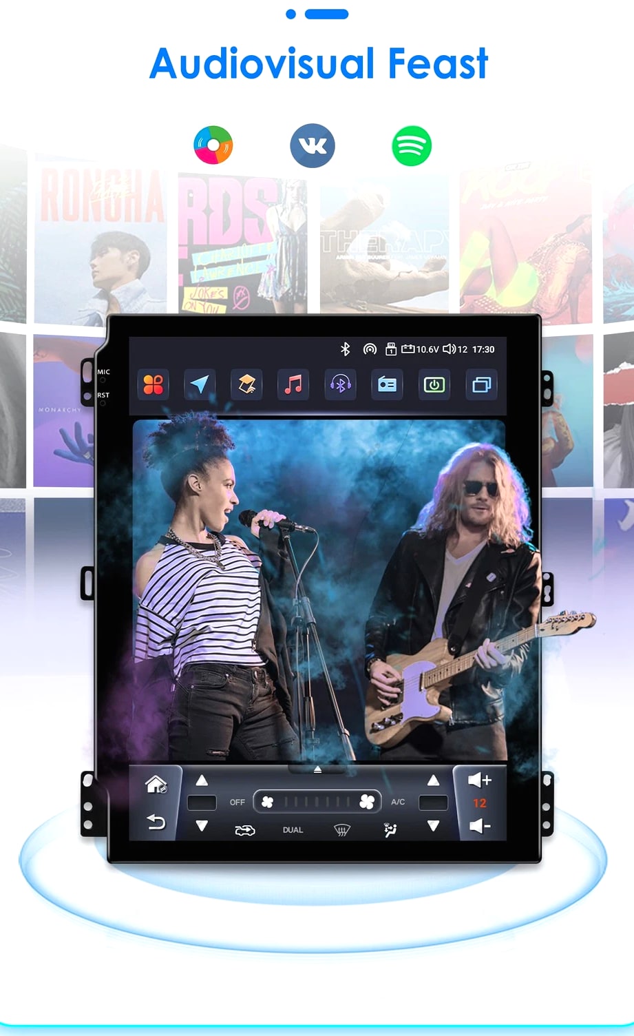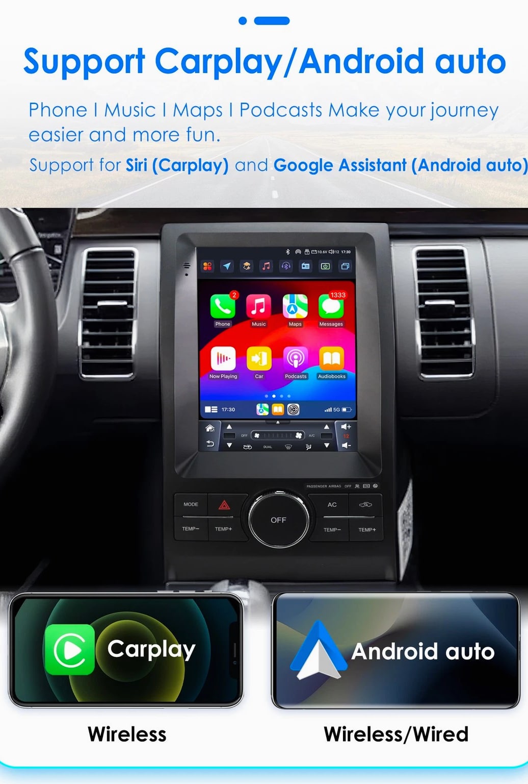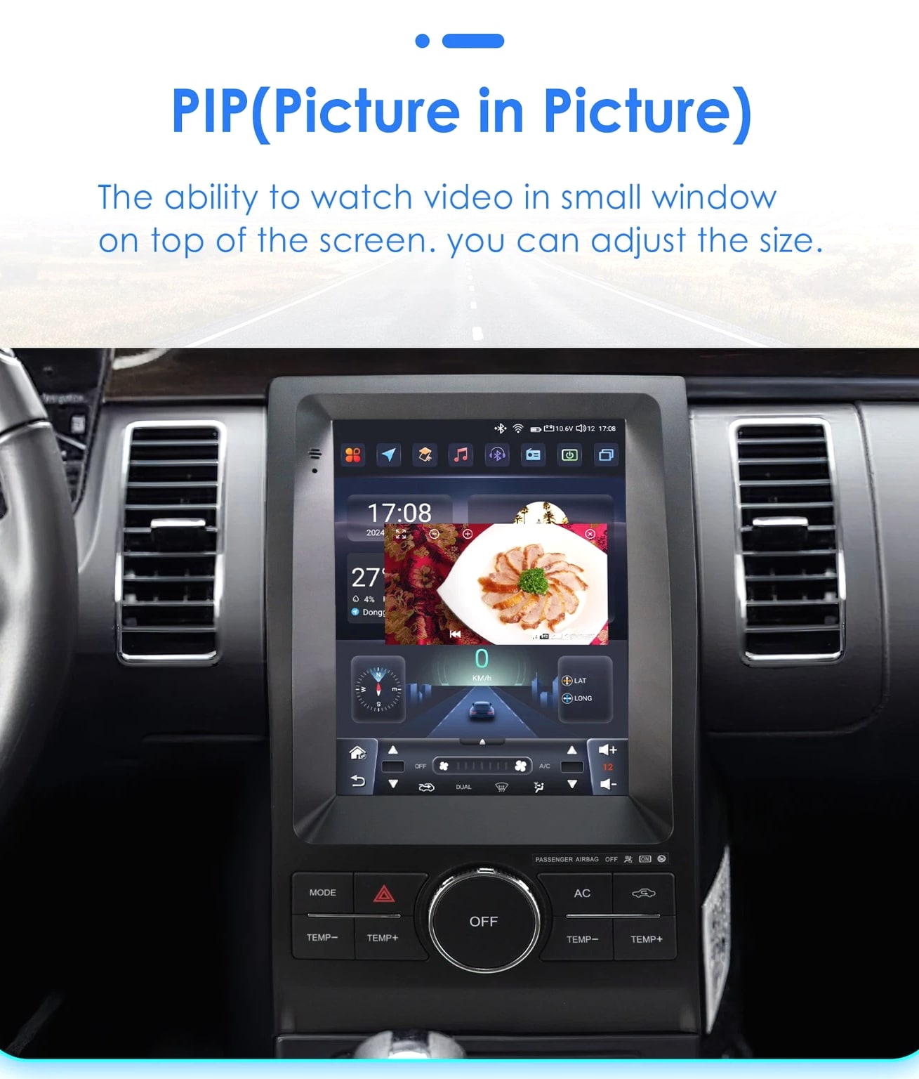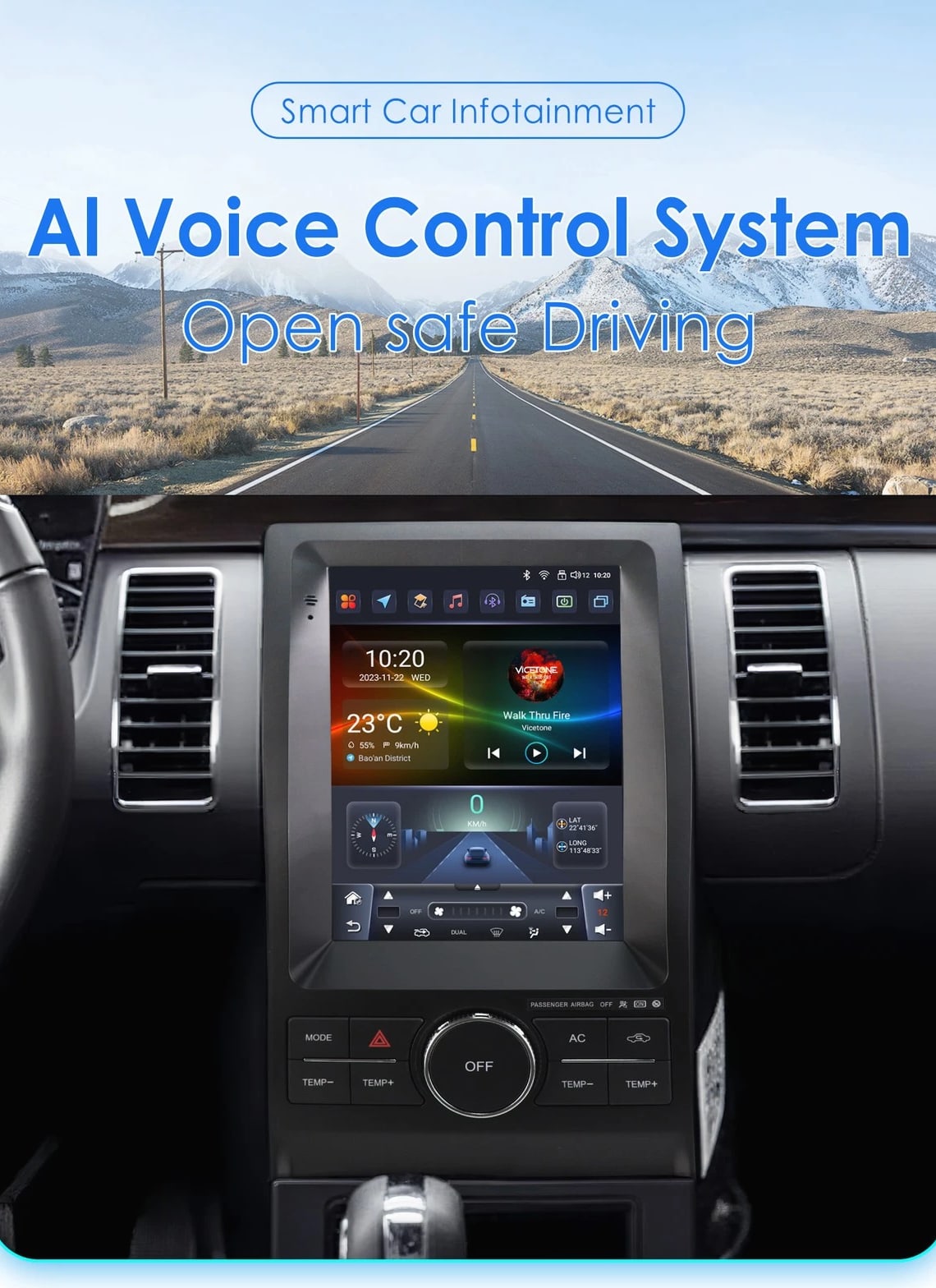- Power Supply: DC 12V (allowance range: 10.8-14.5V) - Max. Current: 10A - Screen Size: 9.7 inch General - Operation System: Android 12 - CPU: Allwinner A100 1.5Ghz*4 - RAM: 2GB - ROM: 32GB System - Touch Screen: Yes - Resolution: 768*1024 - Capacitive or Resistance Screen: Capacitive - Built-in Clock and Calendar: Yes, show real time and can use network-provided time - Main Menu Status Bar display: Can be changed to Music/Radio/BT-Stereo Player and Clock/Date/Week - Change Apps-Icon Position: Yes - Key Backlight Color: White Display - WiFi: Built-in WiFi Modem, support 802.11b/g/n WiFi - Explorer: Opera, UCWeb, SkyFile, Dolphin, and more explorer options - Online Entertainment: Online Video, TV, Movie, Music, Radio, Video Chat - Online Navigation: Online Maps Navigating - Online Games: Yes, online play or you can download from play store - Online Communication: WeChat, Twitter, Facebook, Skype, Gmail, Whatsapp etc. - Read and edit Office Software: Yes, support Word, Excel, Powerpoint, PDF, TXT Internet - Format: MP3/WMA/MP2/OGG/AAC/MA4/FLAC/APE/WAV etc. Could play via song list - Record: MP3, WMA - Other: LRC synchronized display; ID3 search; Search by files; Album Picture; User-defined audio effect - Amp IC: YD7388 - SNR: Noise ratios: =90dB Audio - Format: Support AVI (H.264, DIVX, XVID), RM, RMVB, MKV (H.264, DIVX, XVID). WMA, MOV, MP4 (H.264, MPEG, DIVX, XVID). DAT (VCD format). VOB (DVD format). PMP, MPEG, MPG. FLV (H.263, H.264). ASF, TS, TP, 3GP, MPG etc. =30 formats, Playing internet video directly (while downloading) - Play: Up to 1920*1080 Pixels, 30Mb. Fluent play without light spot Video - Operation System: Android - Support Maps: Android Map, Sygic, Kudos - Voice Guidance: Yes - Support 2D/3D Map Views: Yes - Dual Zone: Yes, navigating while music playing - Online Navi: Yes, support maps online navigating - Hands Free: Yes - A2DP (Bluetooth Stereo Music): Yes, can play stereo music through Bluetooth - Bluetooth Music Control: Yes, play/pause