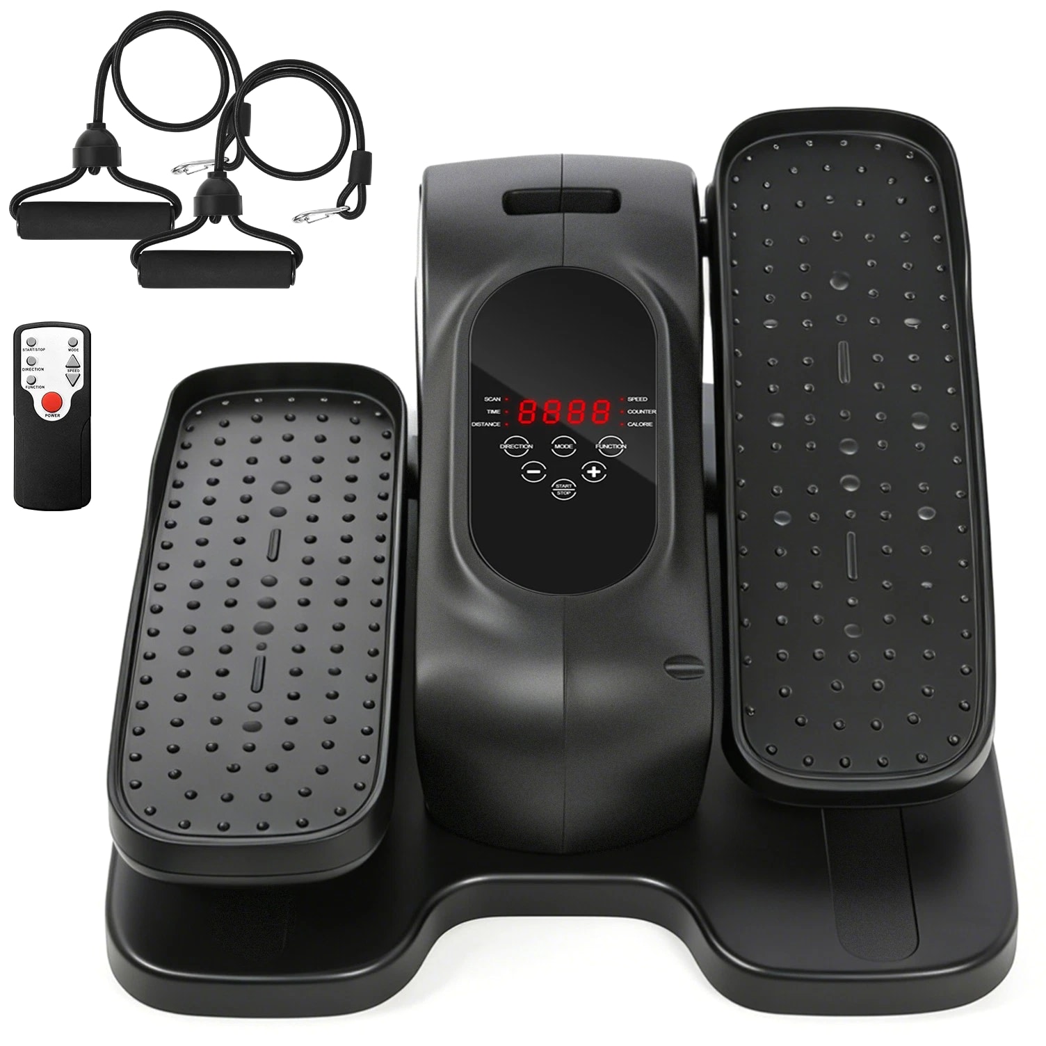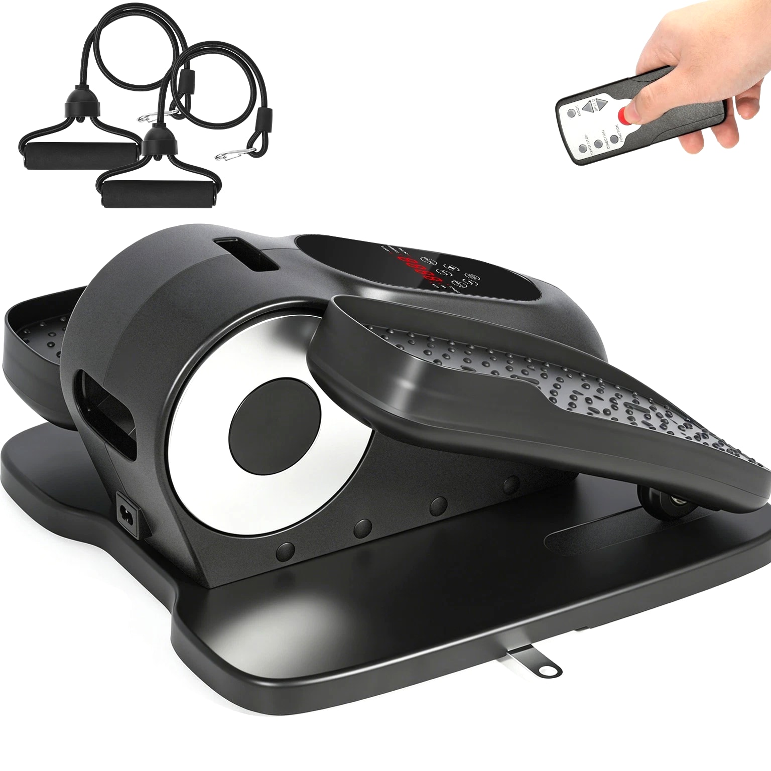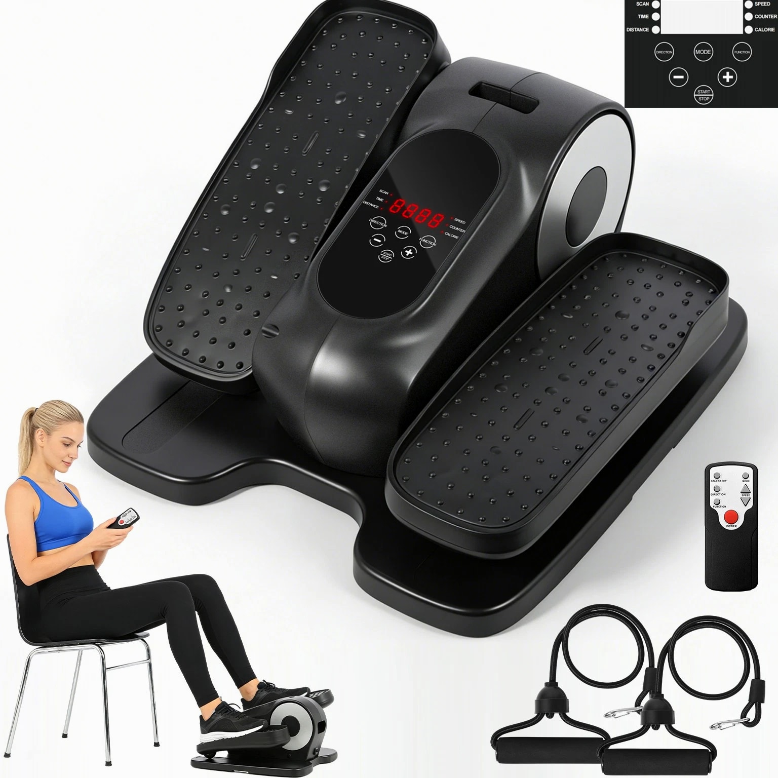 Himly Under Desk Elliptical – 2-in-1 Manual and Auto Modes You can choose between manual mode (12 speed levels) or automatic mode (default speed level 3). The pedal can be moved forward or backward, switching in just 3 seconds. Adjust the speed to work different muscle groups and achieve your fitness goals. Low-Impact & Joint-Friendly Ideal for office workers, seniors, or those in rehab. Promotes circulation, strengthens leg muscles, and improves joint mobility with zero joint stress. Quiet & Portable Advanced noise reduction and silent wheels for quiet operation at home or work. Compact size: 14.76"L x 15.75"W x 8.07"H. Lightweight at 13.45lb, easy to move. LCD Screen & Remote Features an extra large and clear screen on this elliptical machine, allowing for intuitive operation and real time tracking of time, speed and calories burned. Includes a convenient remote control to seamlessly adjust settings without bending over or pausing your exercise; perfect for seniors (Batteries for remote not included.) Full-Body Workout Low-impact exercise ideal for office workers, seniors and sedentary users; includes resistance bands for upper body training Perfect Gift Idea Promotes health for office workers, seniors, and those in rehab. Improves circulation and relaxes muscles. Ideal gift for friends, parents, or grandparents. Product Parameters: Product Model: DT01 Product Input Voltage: 120V~ 60Hz Rated Power: 80W Net Weight: 6.1KG Gross Weight: 7.3KG Product Size: 40×37.5×20.5CM/15.75 × 14.76 × 8.07 in Package Size: 44×41×26.5CM Maximum Load: 15.0KG per foot Safety Notes: Consult a doctor before use if you have pre-existing medical conditions or use medical devices (e.g. pacemakers) Adult use only; keep device and power cord away from children under 8 Unplug before cleaning or non-use; do not use in humid, dusty or outdoor spaces